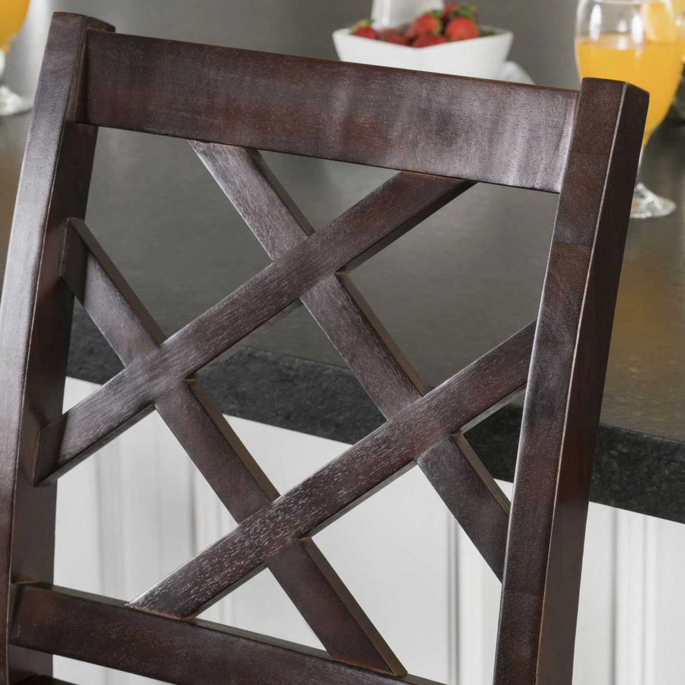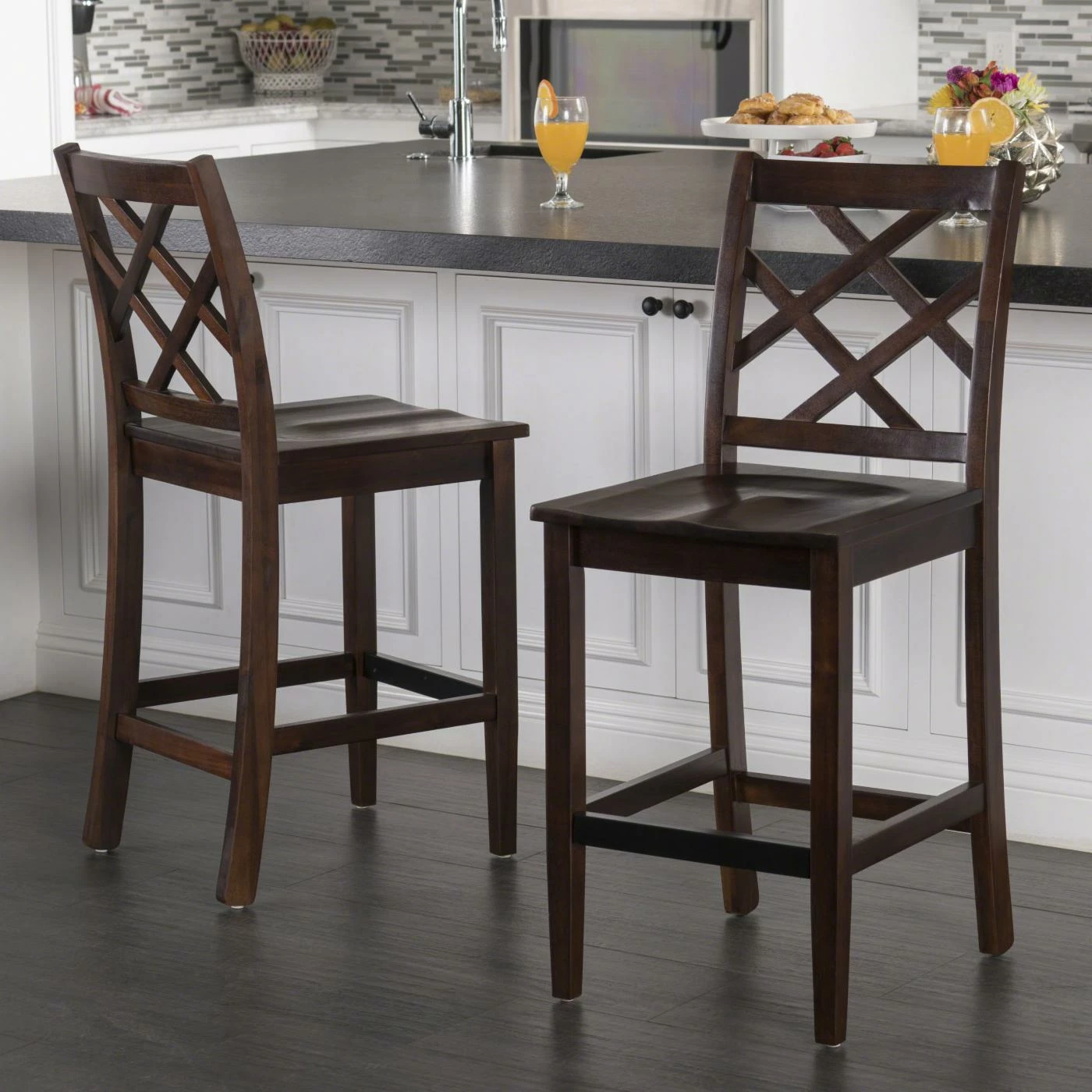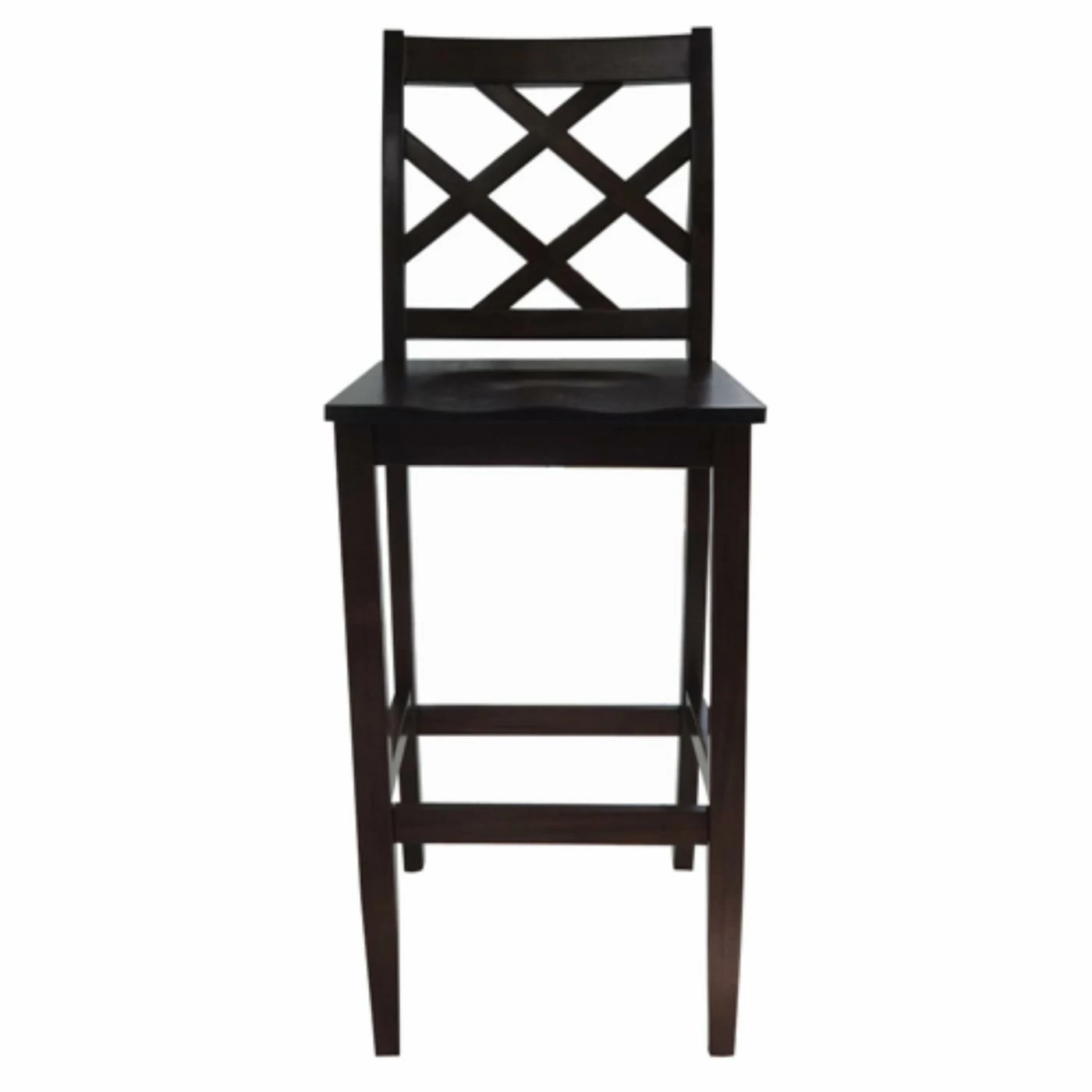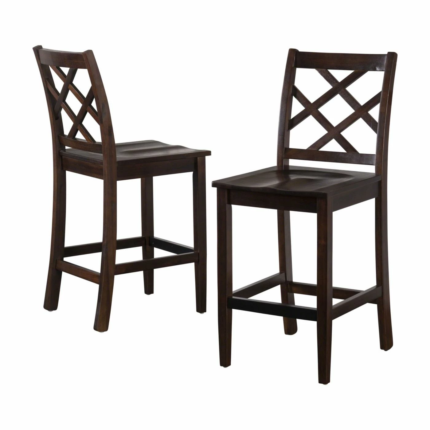Complete your breakfast bar or counter-height table in classic style with the Harmon 26 in. Cross Back Counter Height Chair. Square legs and a cross back give the solid acacia wood chair a traditionally casual appearance. For optimal support, the seat has a scooped design and the front horizontal stretcher doubles as a footrest.