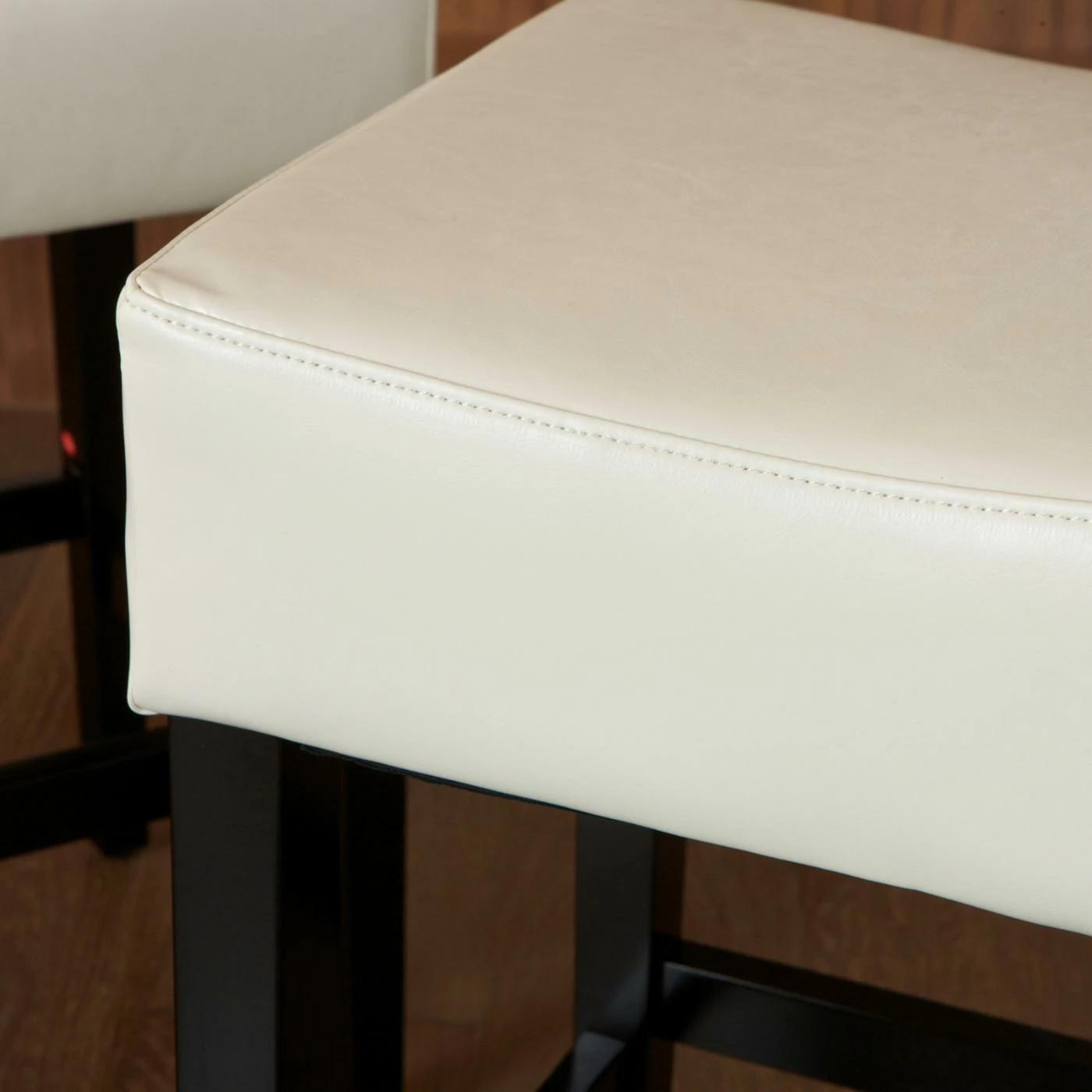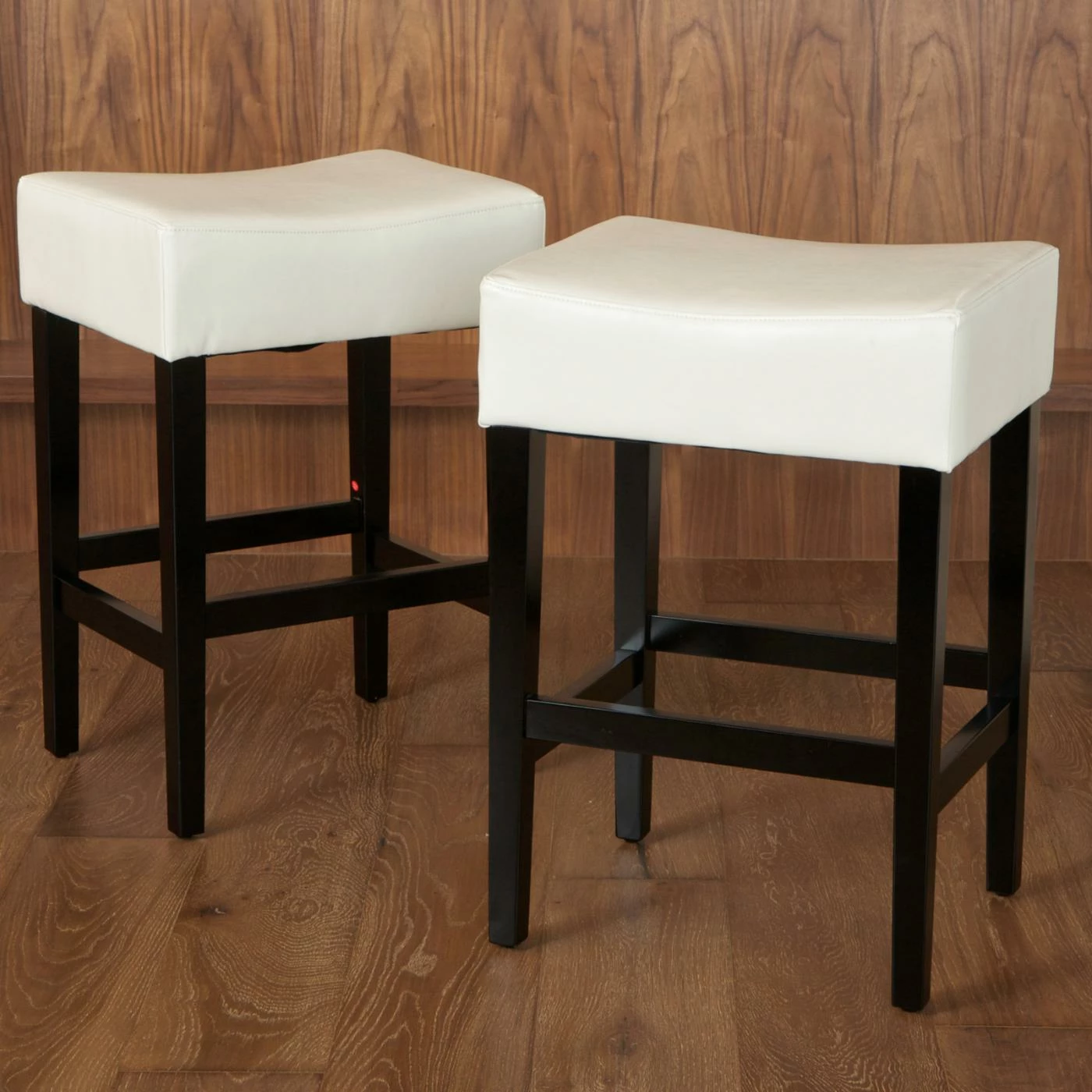 With striking contrast, the Lopez Backless Ivory Leather Counter Stools – 2 Pack makes a bold statement in your home. The fine, ivory-white bonded leather and black wooden frame play off each other perfectly. These elegant bar stools come fully assembled for your convenience.