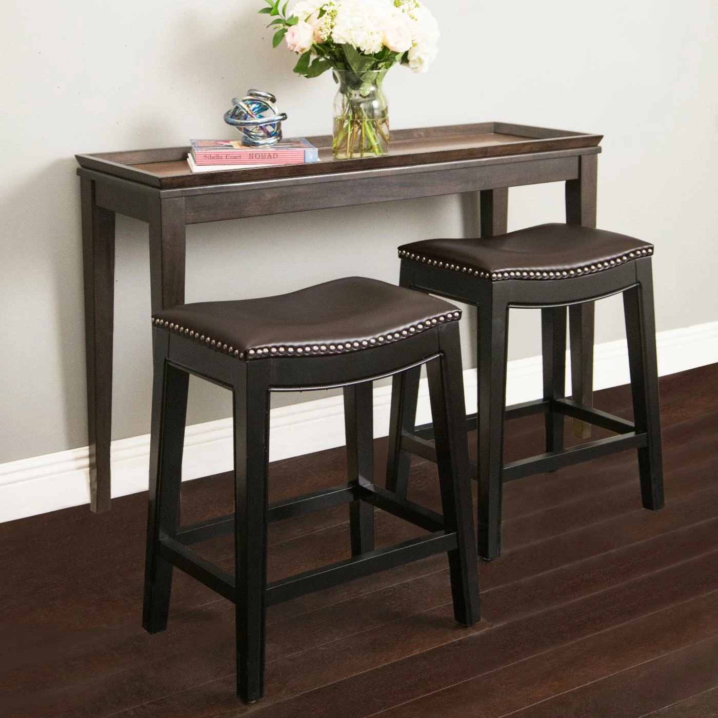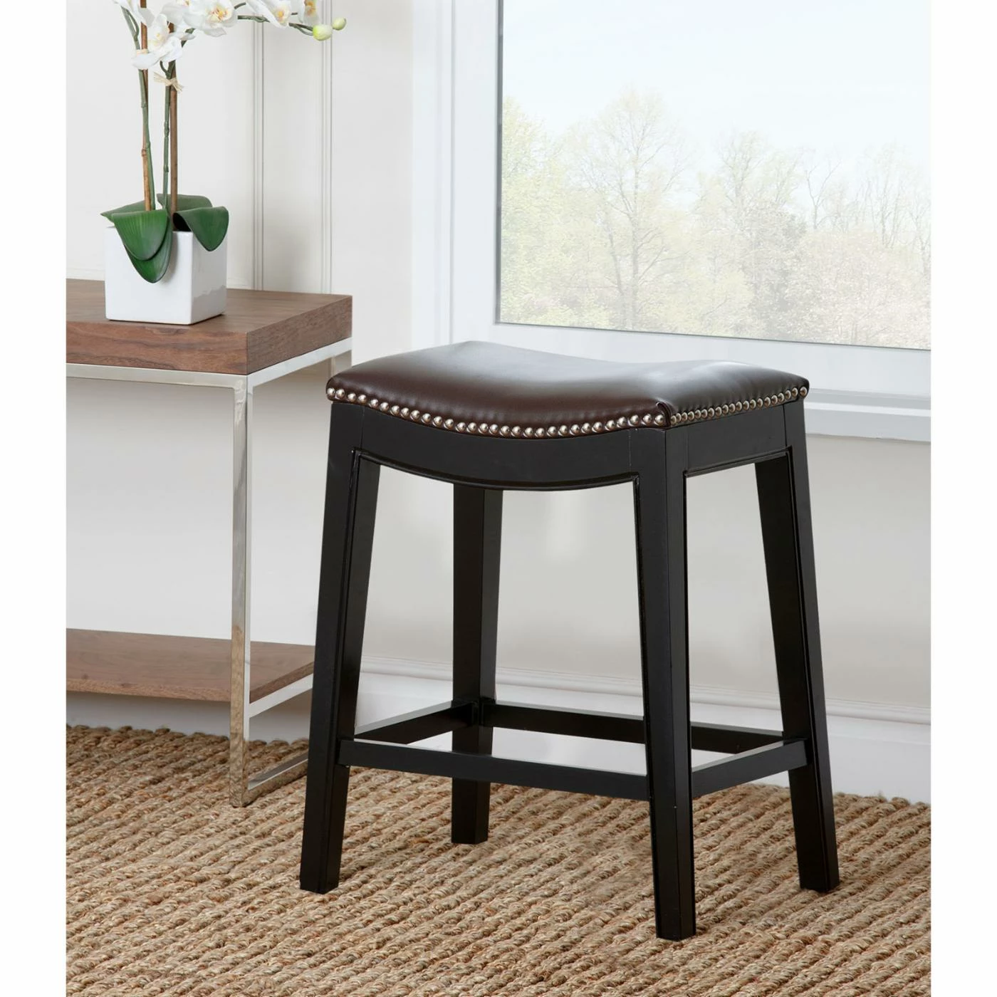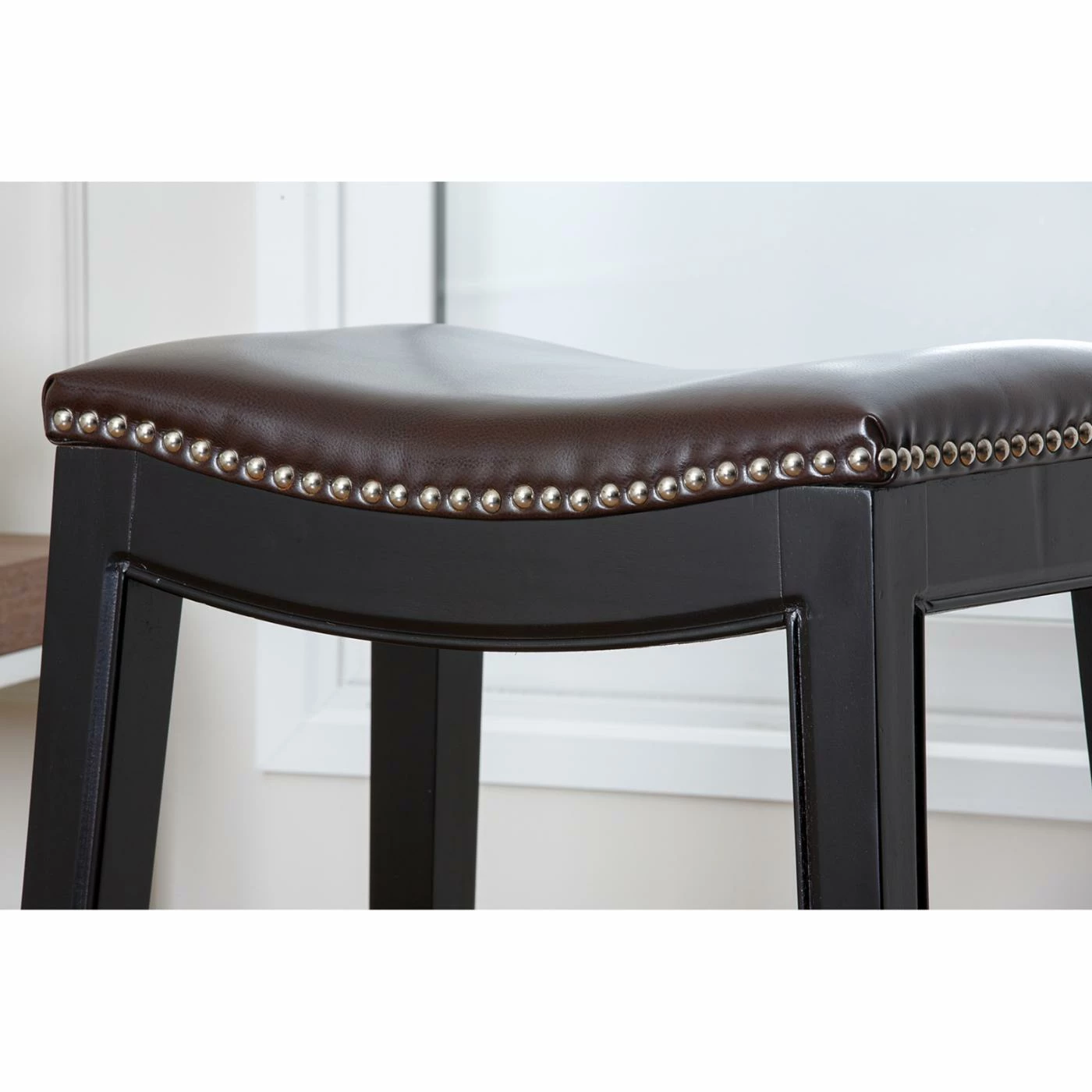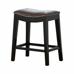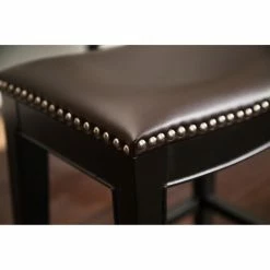 Whether you’re sidled up to breakfast, perched with a cup of coffee, or gabbing while waiting for dinner, sit in style with the Abbyson Reagan Dark Brown Leather Nailhead Trim Counter Stool. This beautiful counter stool has a durable hardwood frame and is covered in soft bonded leather with a rich brown color that warms up any space. This beautiful counter stool has long legs with a sleek black finish that lend a touch of contemporary style, and a nailhead trim accent for gorgeous detail. No matter what activity you’re sitting down to, you’ll be seated in comfort thanks to the stool’s cushy, high-density foam seat and exceptional support. Quality craftsmanship and excellent design mean you’ll be comfortably perched atop this stool for years to come.