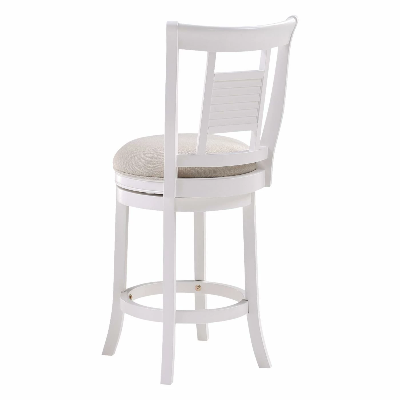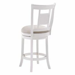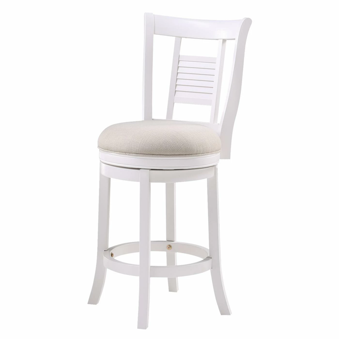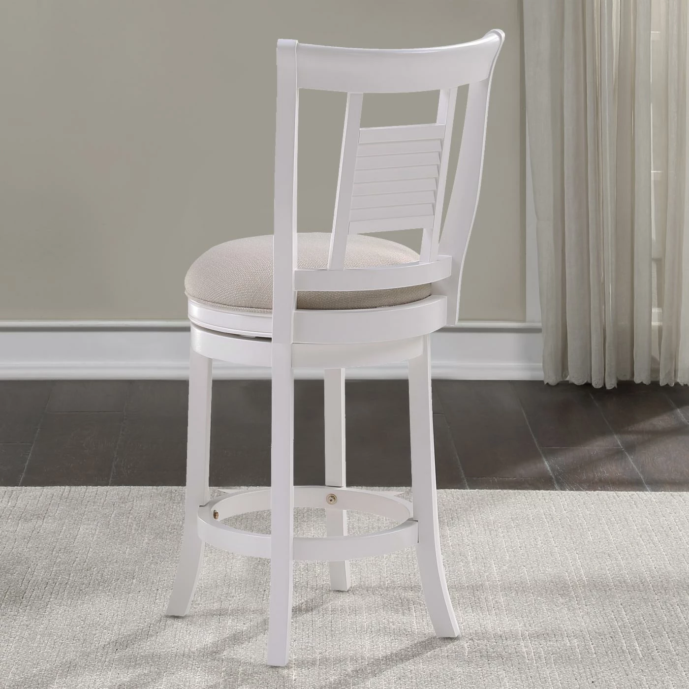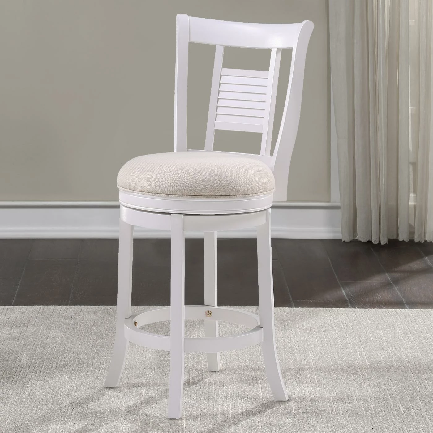 Dress up your kitchen counter or bar with the farmhouse style American Woodcrafters Grove 26 in. Swivel Counter Stool. This stool features a solid hardwood frame in white with a louvered insert within a slat back . A comfortable padded seat is upholstered in durable and easy to clean woven ivory polyester fabric. With a circular footrest to add strength and stability, it also has a 360-degree swivel to let you twist and turn to make getting on and off the stool a breeze. Your purchase includes one (1) bar stool.