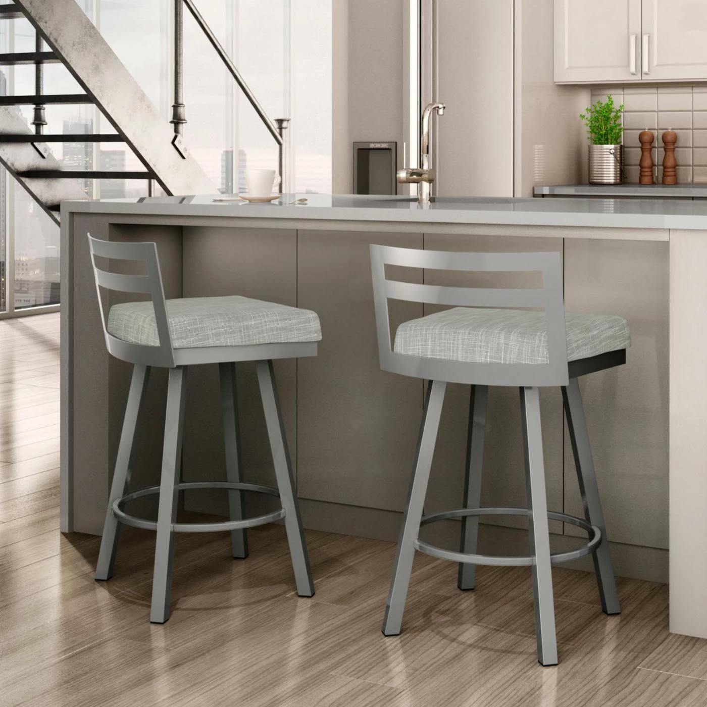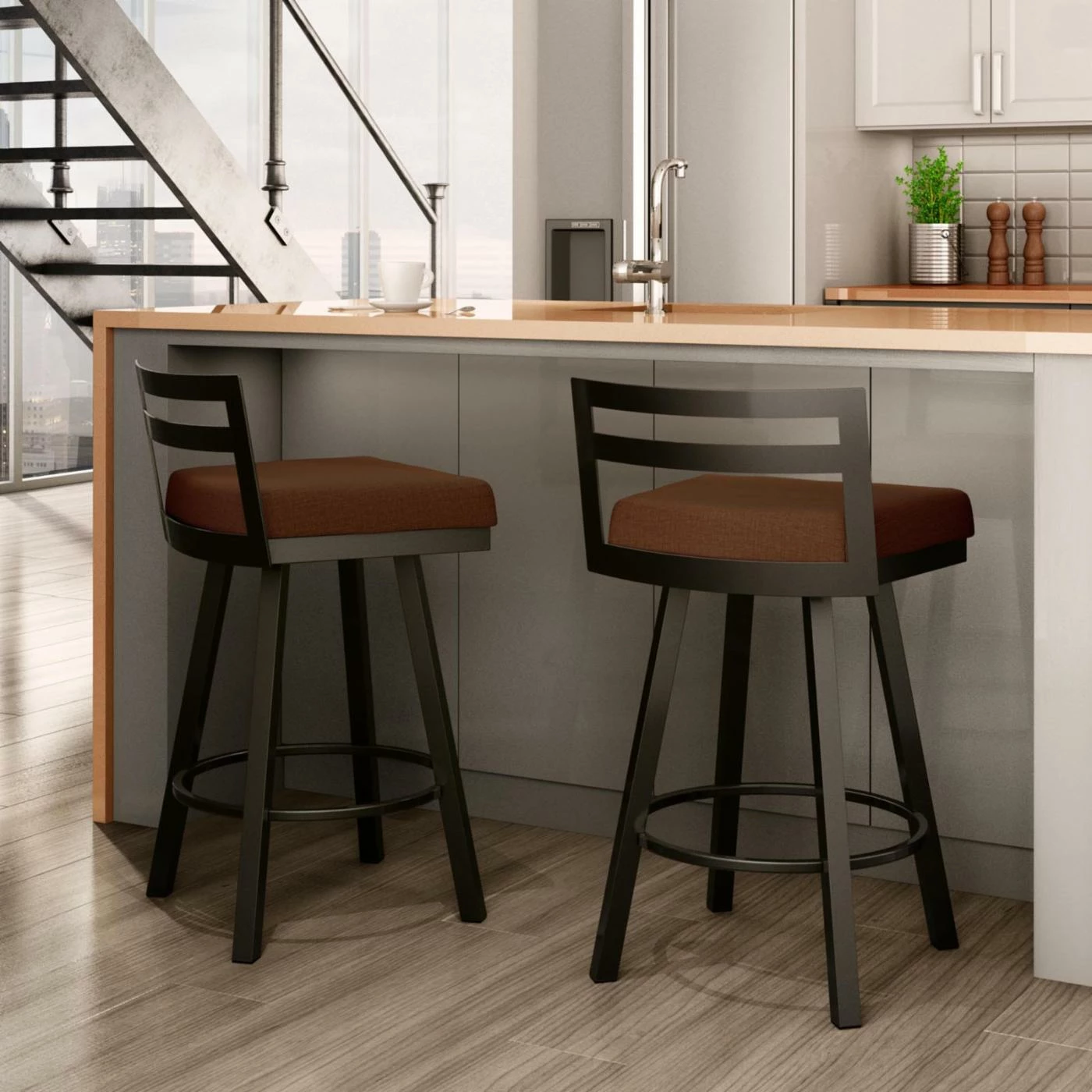 A clean kitchen needs stools that share the same sentiment. The Amisco Derek 26 in. Swivel Counter StoolΒ is all about convenience, comfort, and clean lines. You and your guests will be infatuated by the sleek look of this contemporary counter-height stool with its angled legs, low-profile backrest, and cushioned seat. The Derek Swivel Stool is available in your choice of seat color and frame finish to better complement your existing kitchen and dining dΓ©cor.