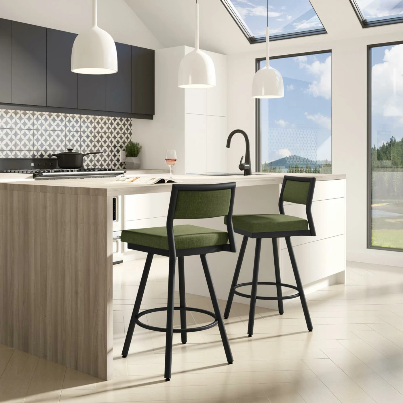 The Amisco Jacob 26.75 in. Low Back Counter Stool has a bold blend of thick lines and deep colors that add a Nordic modern appeal. Tubed metal constructs the frame, perched sturdily on splayed legs. The legs are held together with a ring footrest. Soft, dense foam pads the low backrest and wide square seat. The base of the seat angles sharply into the backrest. A linen-like fabric upholsters the piece. Choose from a variety of color options to make it yours.