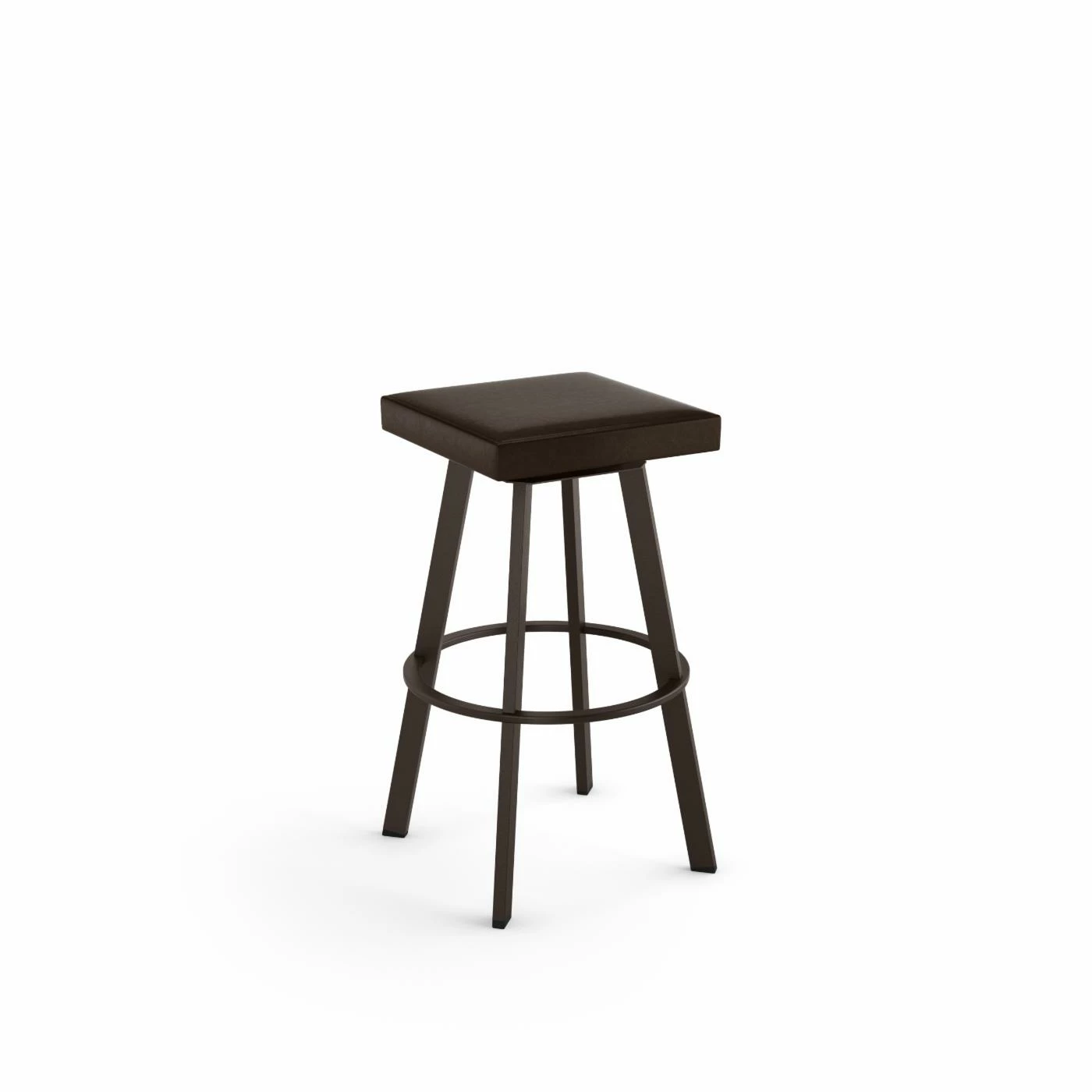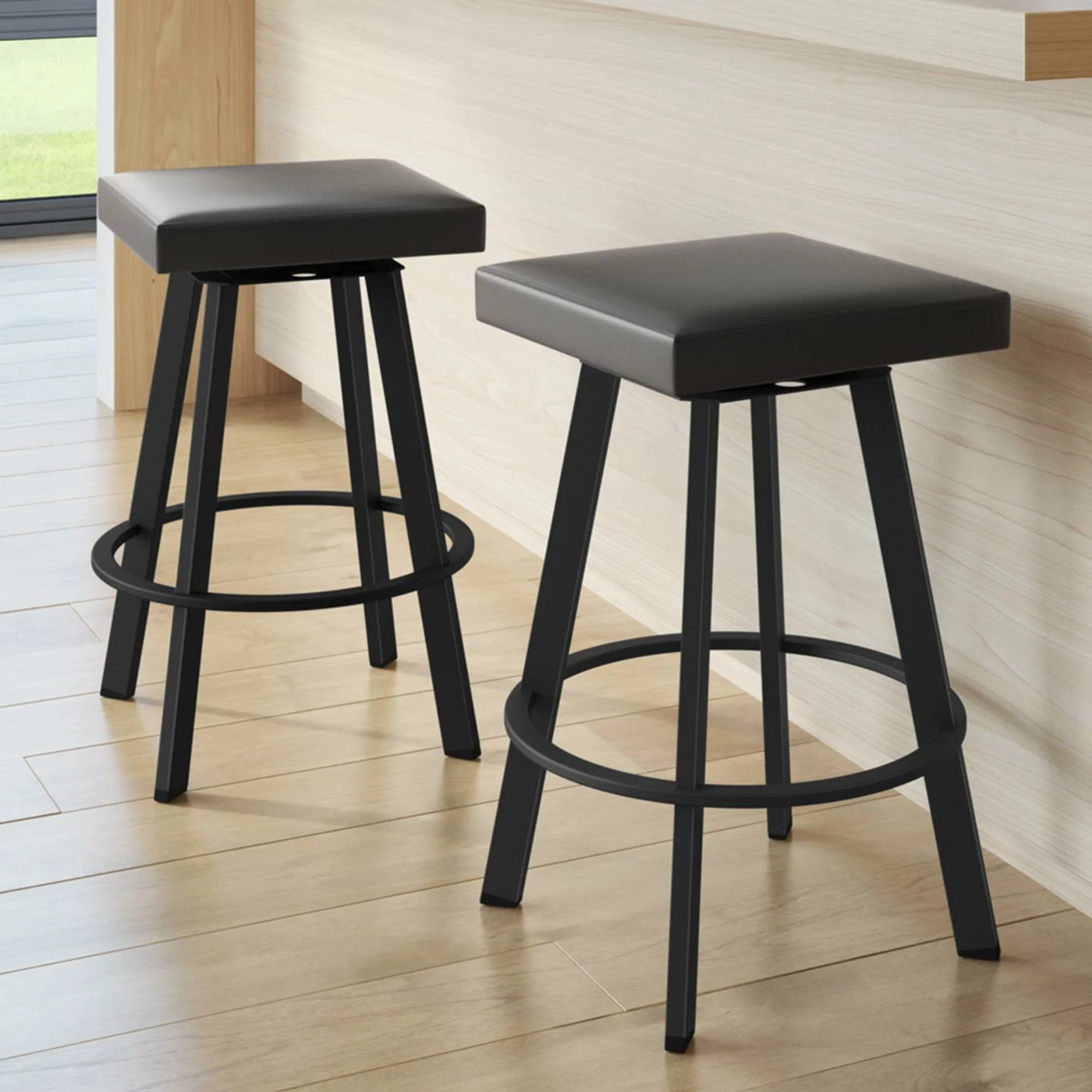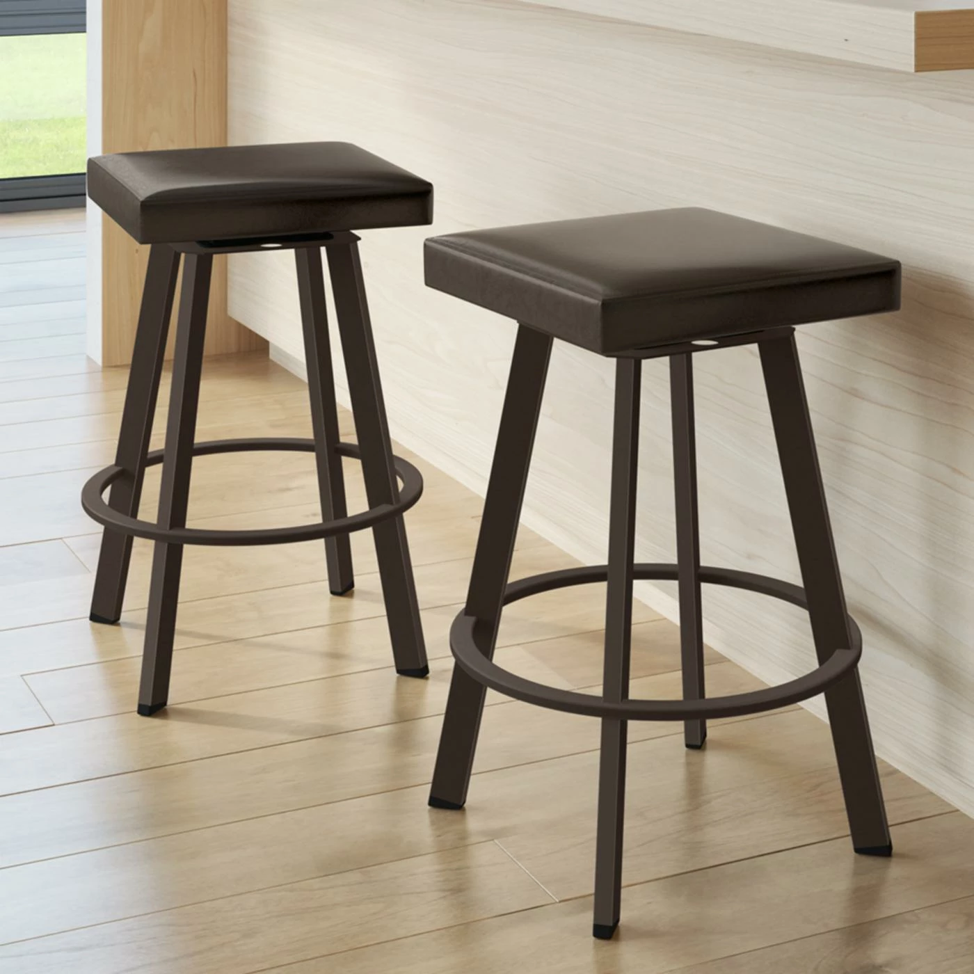 Offer your counter-height dining table a streamlined change of pace with the Amisco Sinclair 26 in. Swivel Counter Stool. This backless counter stool makes an ideal seating option for quick bites with the family or longer evenings entertaining friends. Its hardy frame is crafted from thick metal with bar-shaped legs set at wide splayed angles. Rubber foot-caps protect your flooring. The legs feature a built-in ring footrest for additional support. The square seat has a swivel base and is padded with foam, upholstered in faux leather. Choose among the available color options to best match your room design.