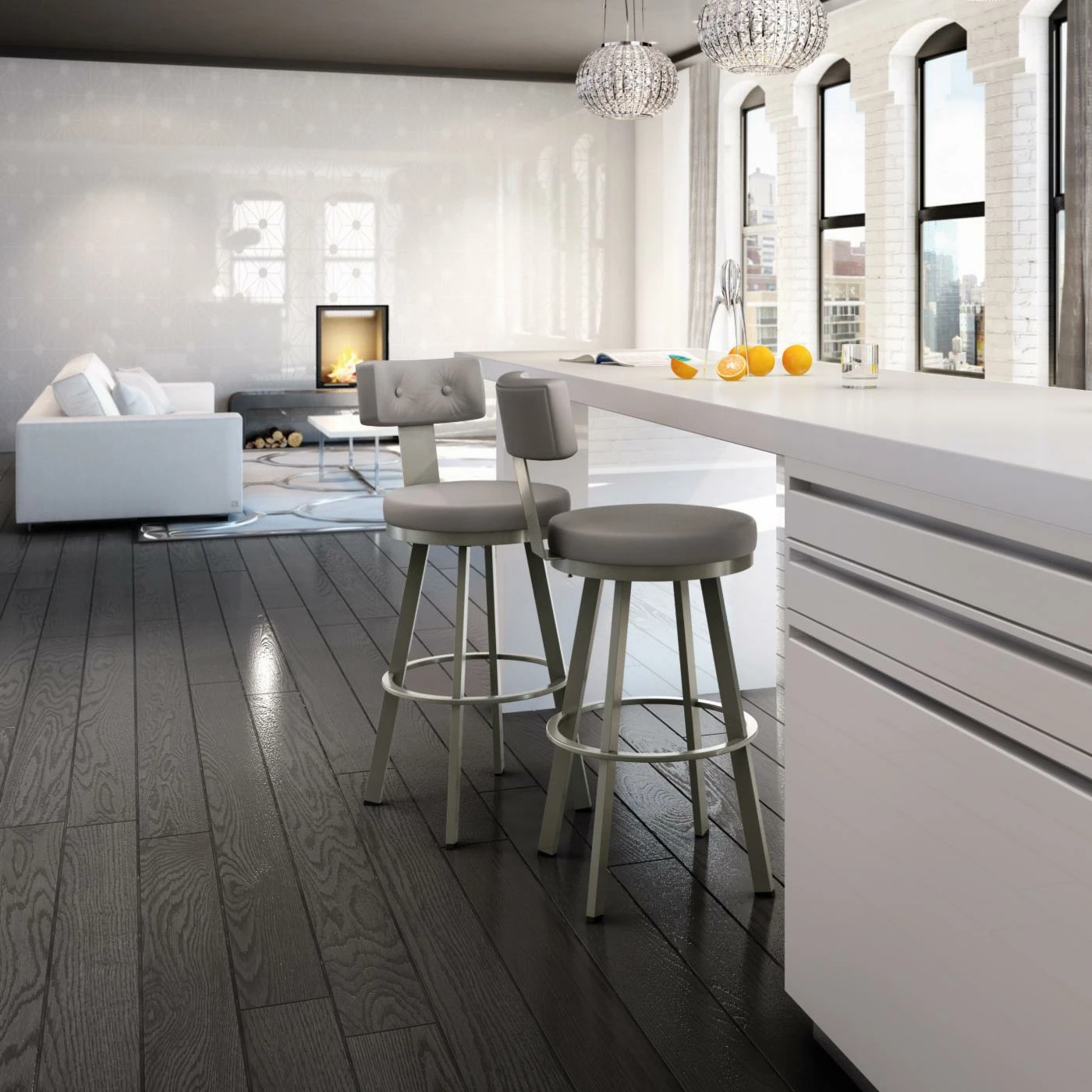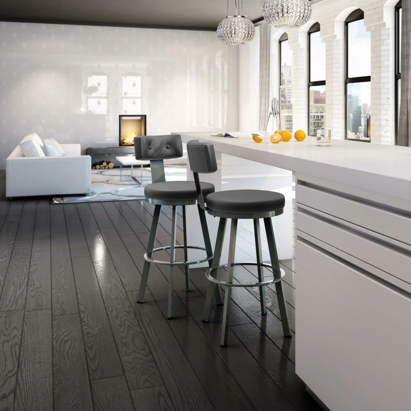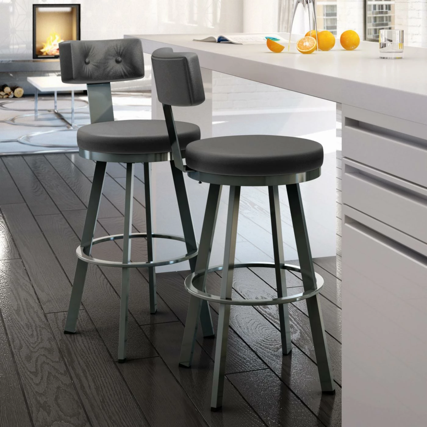 The Amisco Tower Counter Height Swivel Metal Stool is Deco style with a 21st century sensibility. The architectural lines and simple curves and circles are crafted from rugged, cold-rolled steel that’s finished with a baked-on powder coat for added durability and a smooth, appealing exterior. This counter-height stool features a padded seat and back rest that uses thick foam under upholstery of creamy, faux leather. Multiple frame finishes are available, so take some time to check them out and put your stamp on this fetching piece.