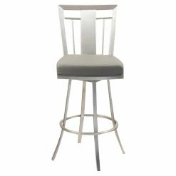 The sleek, contemporary Armen Living Cleo 26 in. Swivel Counter Stool adds style and relaxation to your kitchen island or dining room table. This elegant design flaunts a distinctive splat back and long splayed legs bound by a generous all-around footrest. The stool is crafted from a powder-coated metal frame with a densely cushioned swivel seat upholstered in soft, easy-to-clean faux leather. Best of all, multiple color options are available to blend this stool seamlessly with your existing decor.