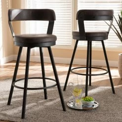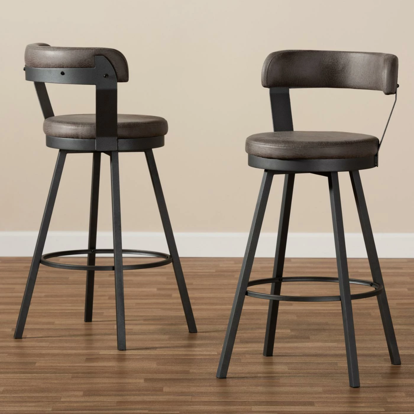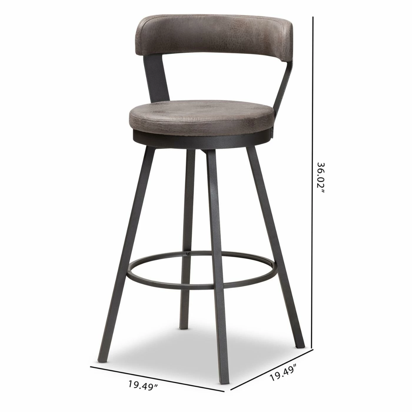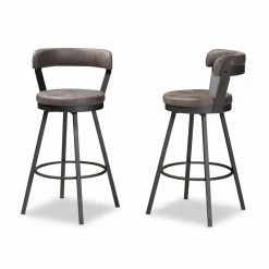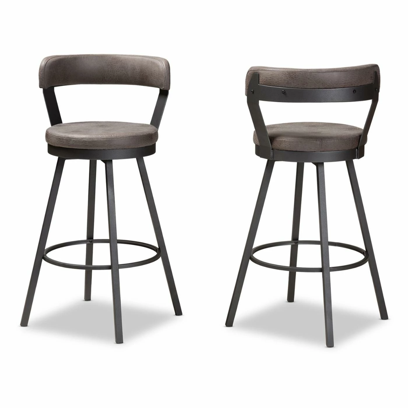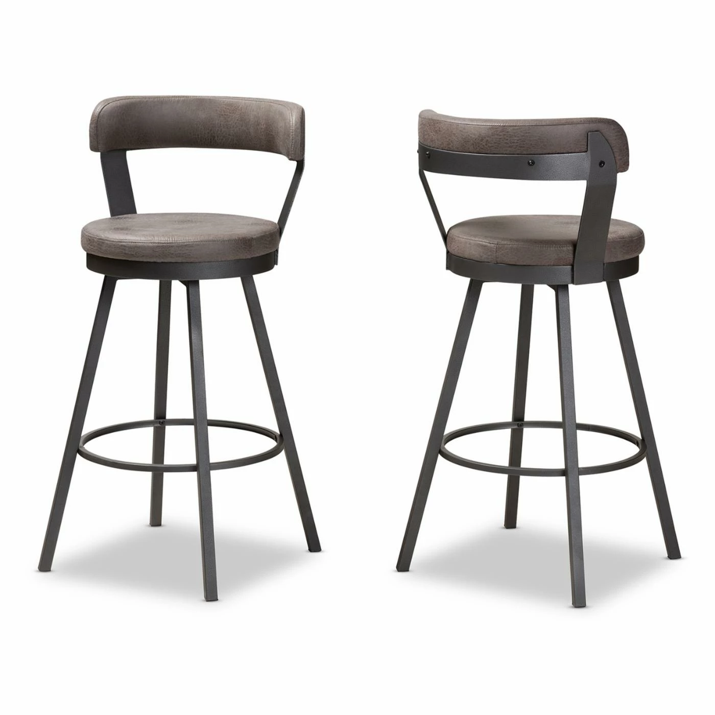 Rustic and industrial design elements on the Baxton Studio Arcene 26 in. Counter Stool – Set of 2 make a chic yet subtle style statement that’s right at home in many a dΓ©cor. The round seat and curved back are upholstered in polyester with a suede-like texture, while the metal frame is finished in an antique gray. A 360-degree swivel puts the perfect spin on things, too.