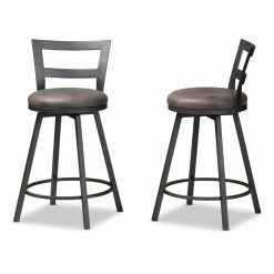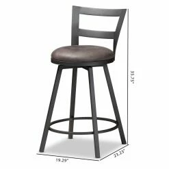 The minimalist simplicity of the Baxton Studio Arjean 26 in. Counter Stool – Set of 2 can make a bold style statement in your counter-height dining area. The design, inspired by rustic industrial style, features an open back with slightly winged corners, plus a round, foam-padded seat upholstered in suede-like polyester. The splayed legs look especially elegant thanks to the antique gray finish on the metal frame.