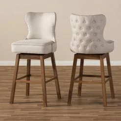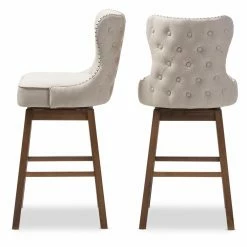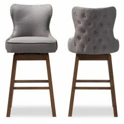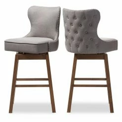 For a glamorous addition to your kitchen counter or wet bar, look no further than the Baxton Studio Gradisca Upholstered Swivel Bar Stool – Set of 2. These stools have a richly cushioned seat and back, with design elements like thick seams and button-tufted detailing on the back of the chair. The stool is armless, with an elegant curve to the back of the seat for support and style. The frame is solid wood, with an outward reverse taper. Footrests on all sides accommodate your comfort any way you swivel.
