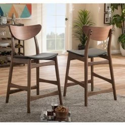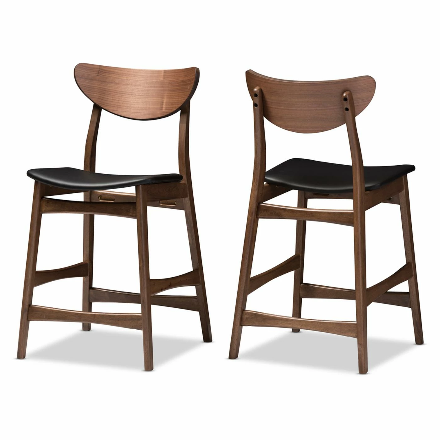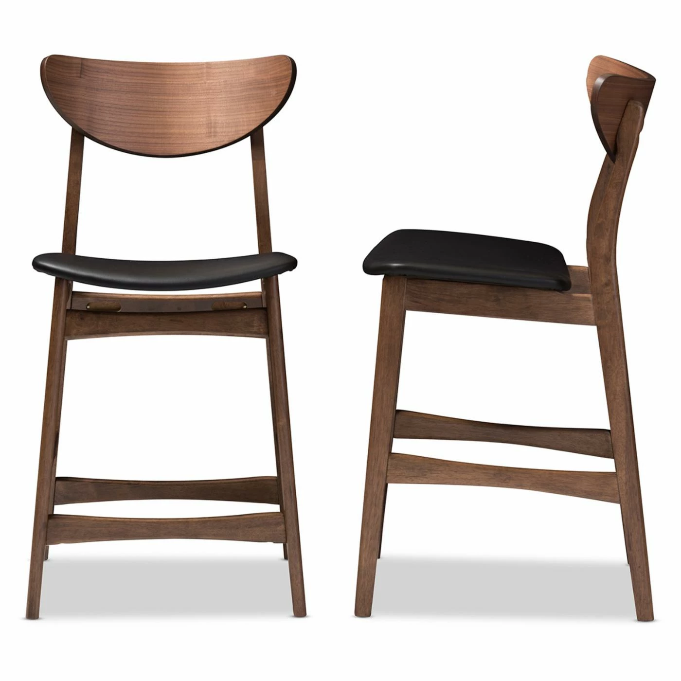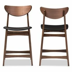 The Baxton Studio Latina 24 in. Faux Leather Counter Stool – Set of 2 exhibits organic design with a combination of solid wood and faux leather for eye-popping contrast. The curved back is elegant yet comfortable and supportive, and a padded black seat comes together to bring this pair of stools a bold presence.