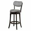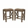 The Benzara Round Wooden Counter Height Stool with Upholstered Seat – Set of 2 offers a quaint, classical complement to round out your new dining room or kitchen room design. This set includes two matching round, backless stools. Thick block wood constructs the frames, featuring curved legs and ring stretcher. A walnut brown finish tops the wood. The seats are padded with dense foam and come upholstered in dark brown faux leather. Antique brass nailheads trim the edges of the seat.