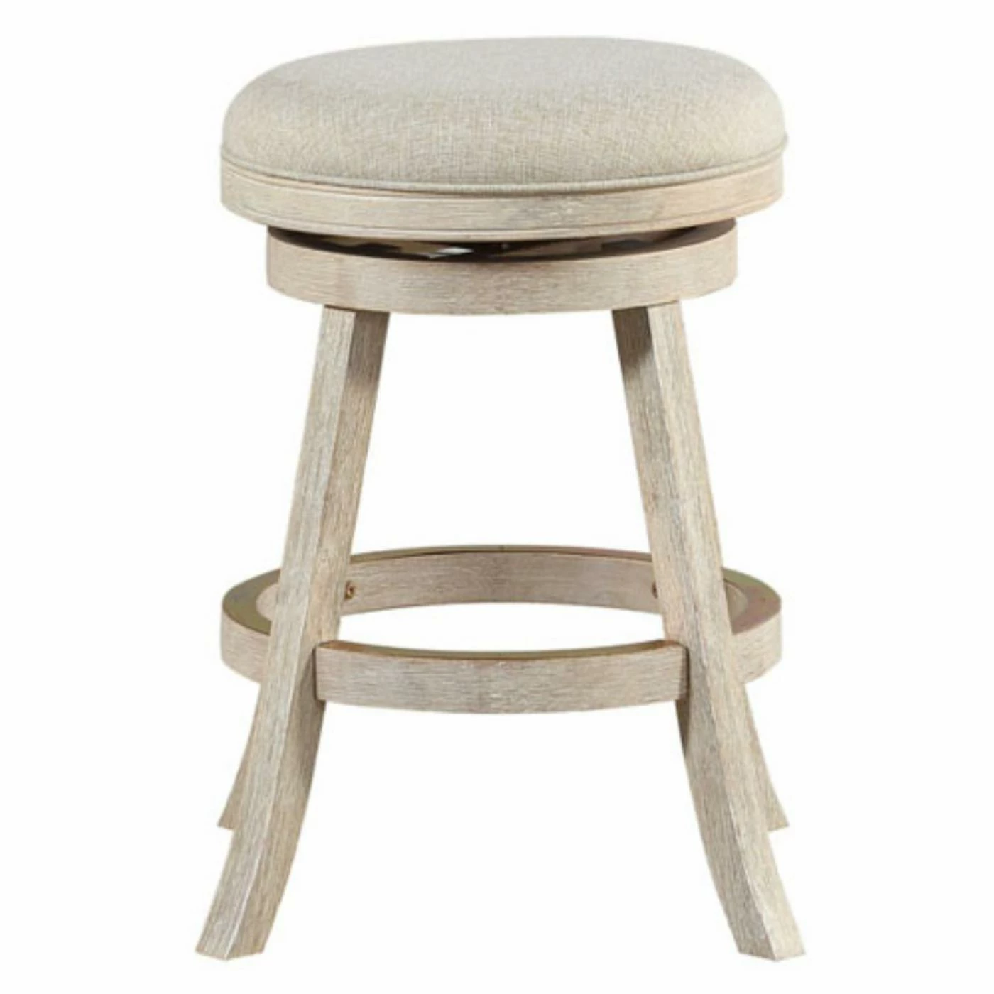 An ivory wire-brush finish adds a faded, vintage look to the Boraam Fenton 24.5 in. Swivel Backless Counter Stool. The rubberwood frame gives it a strong foundation and rustic style. Simple off-white linen upholstery completes the look and adds comfort. A swivel lets you articulate this round stool as needed.