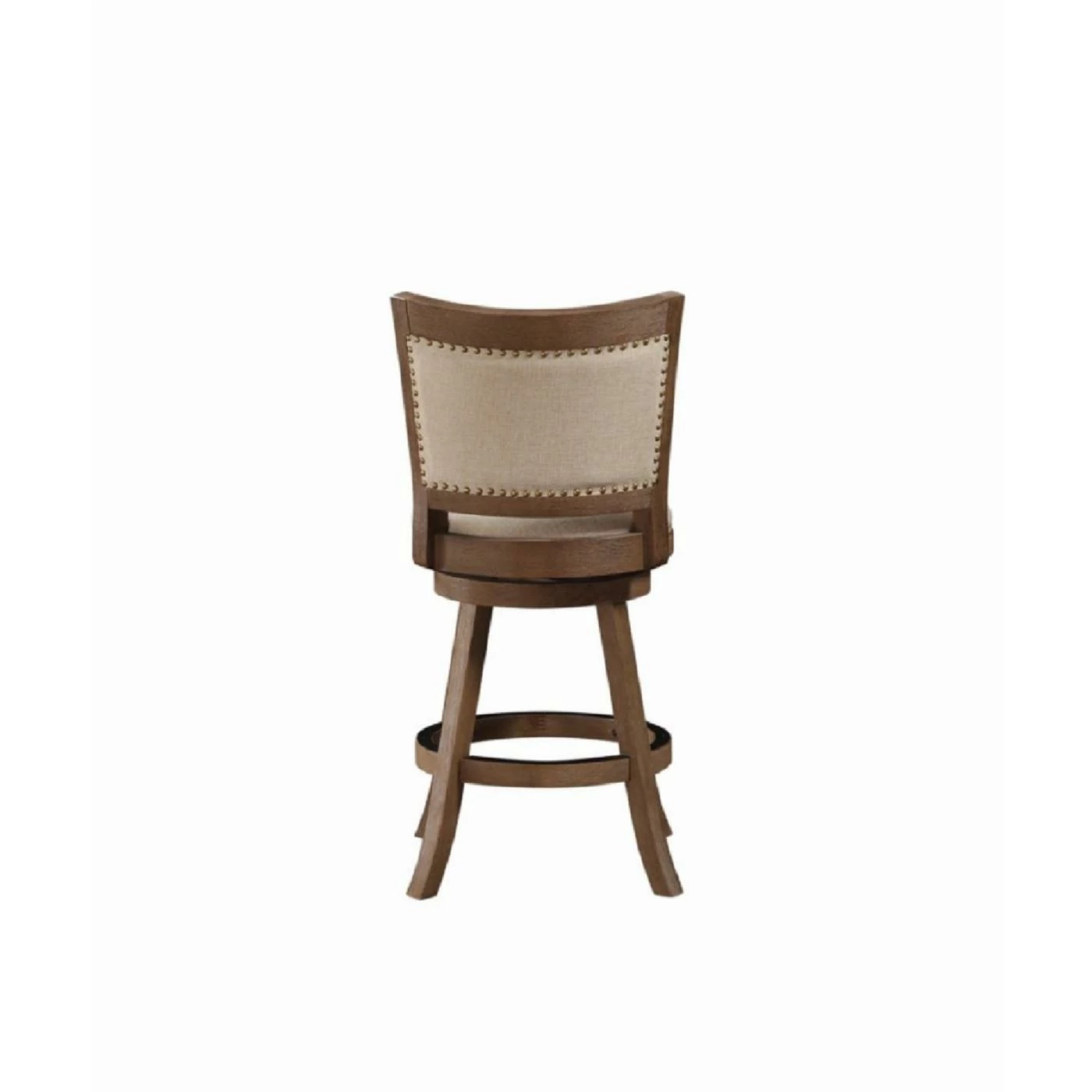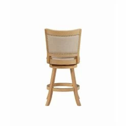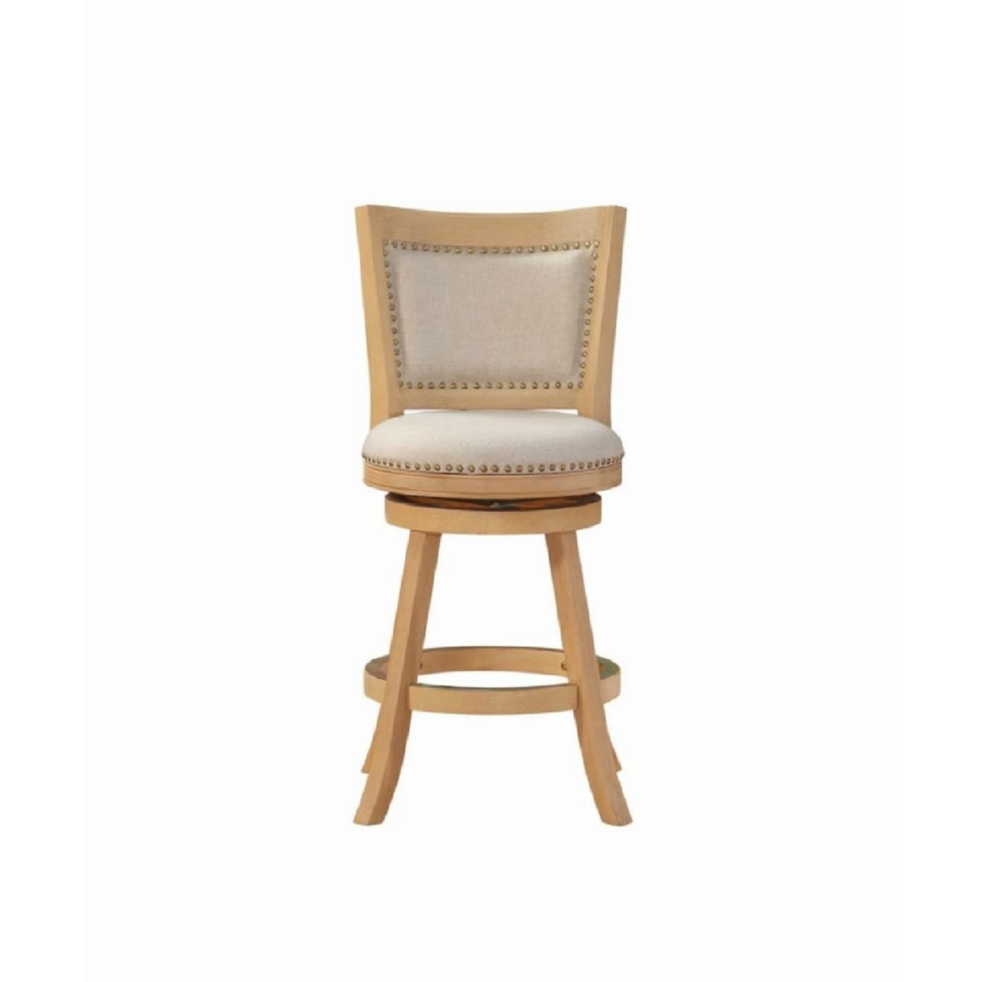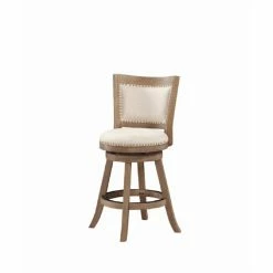 Exquisitely crafted with elegant touches, the Boraam Melrose Counter Stool raises the profile of the traditional swivel chair. This lovely stool is crafted from solid rubberwood with flared legs, a double seat apron, and a full-ring footrest protected by a metal kick plate. Its comes with the choice of cream or driftwood finish is enhanced with wire brush distressing and the generous cushioning and ivory linen upholstery is embellished with genuine brass nail heads. Some assembly is required.