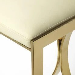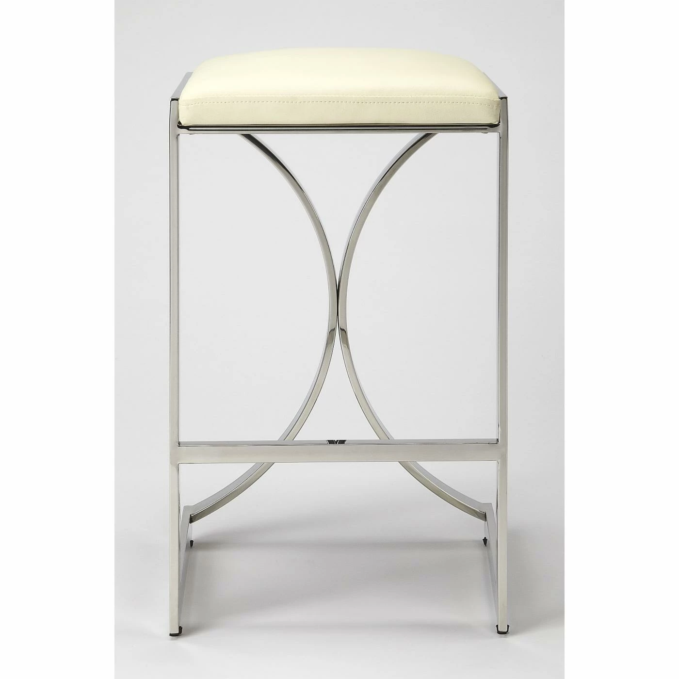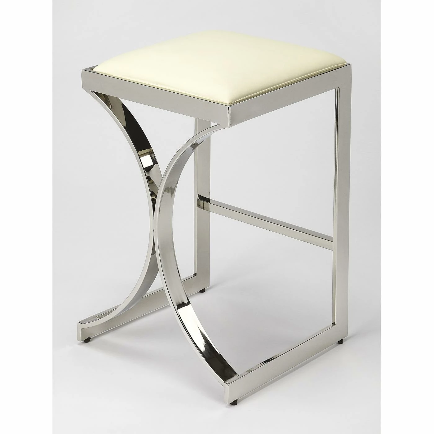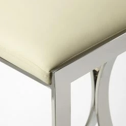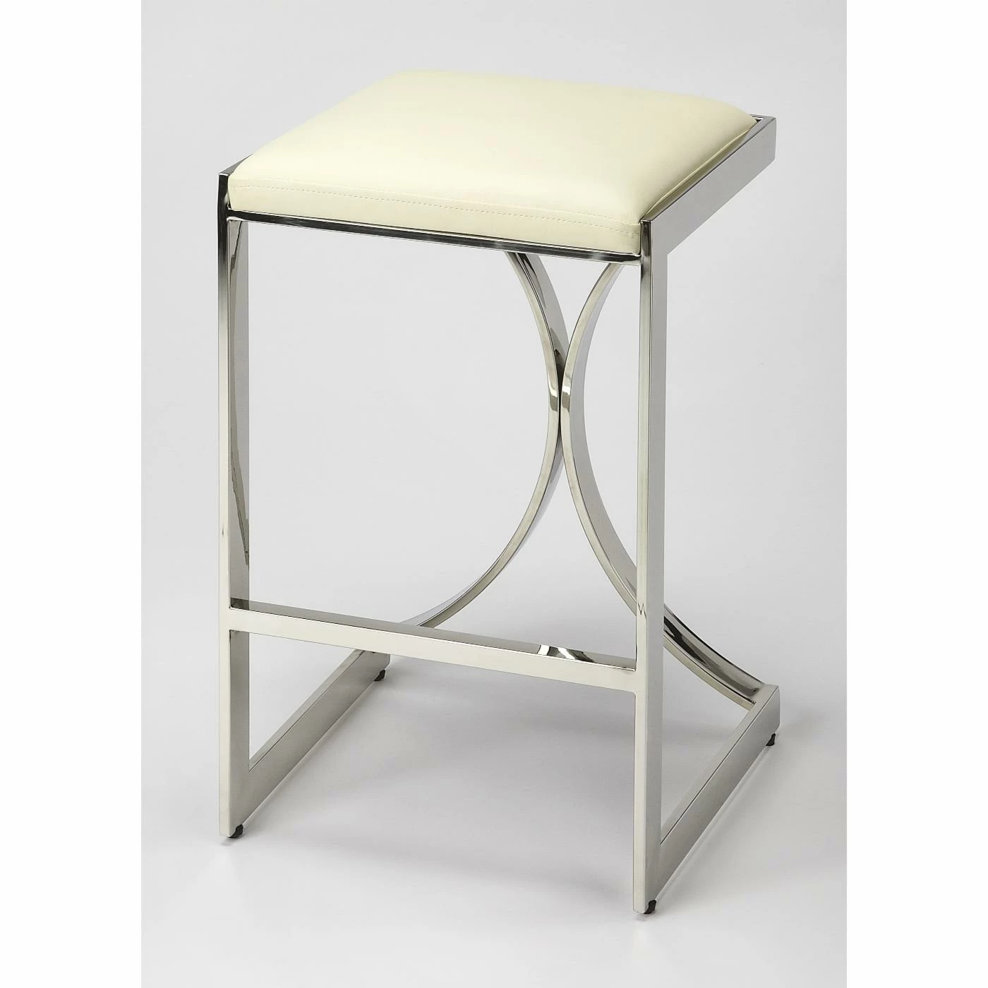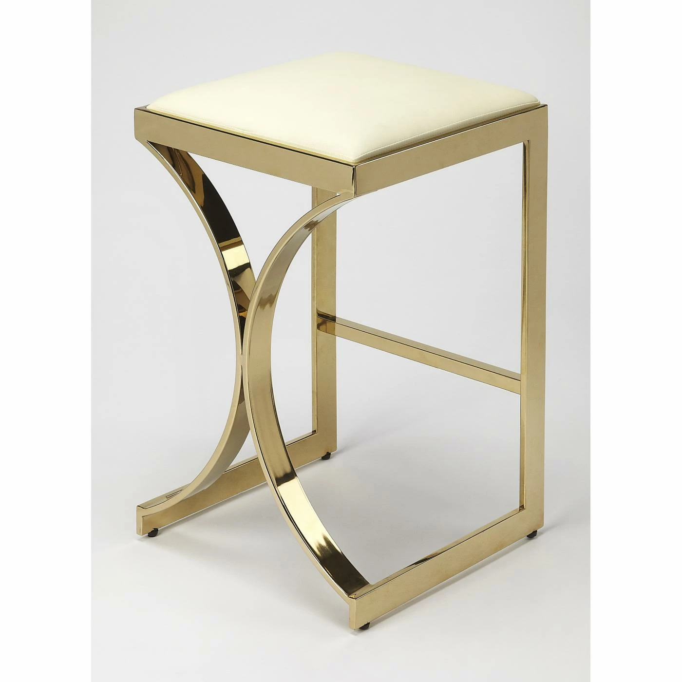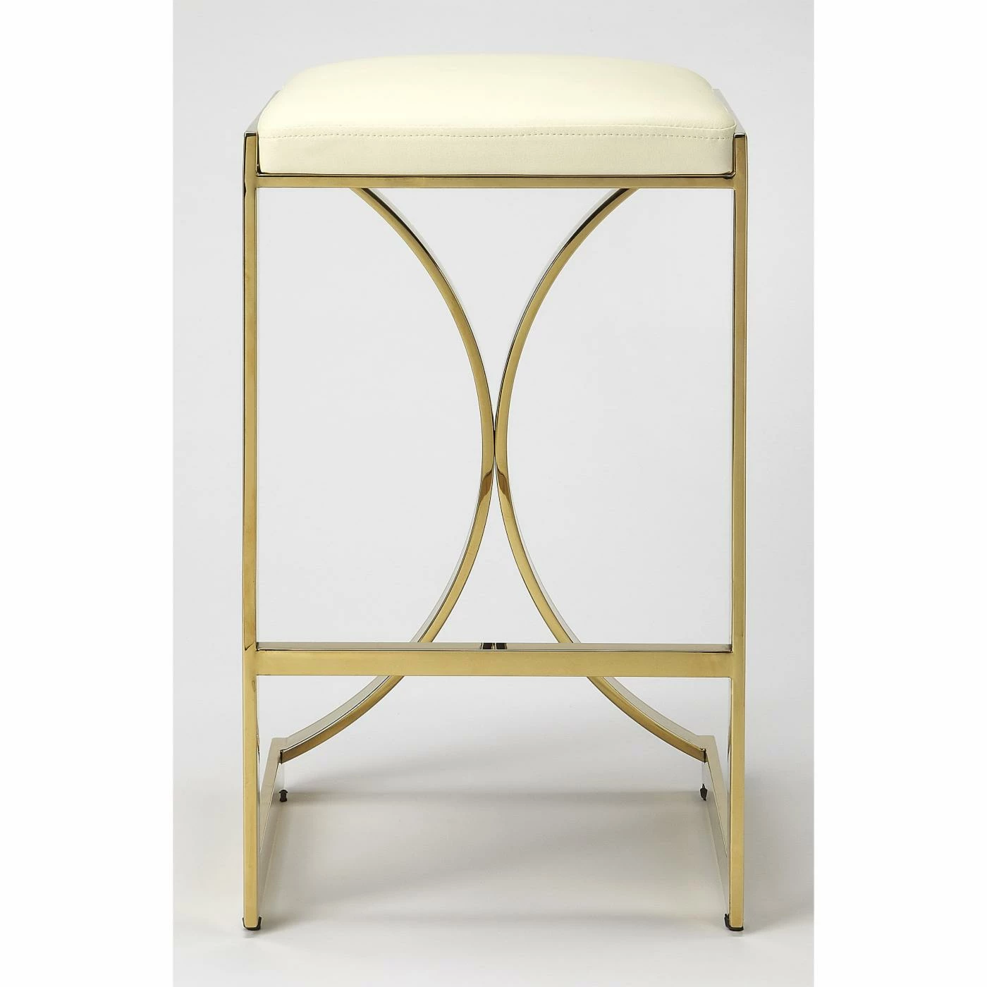 Sleek lines and luxe materials bring out the Art deco-inspired elements of the Butler Specialty Natalya 24 in. Faux Leather Counter Stool. A rectangular front emphasizes the bold curved pieces on the back of the metal frame, which comes in your choice of available metallic finish. The seat is made of white faux leather for a textural contrast and comfort while you sit. Add this counter-height stool to a modern kitchen island or mid-century counter-height table.
