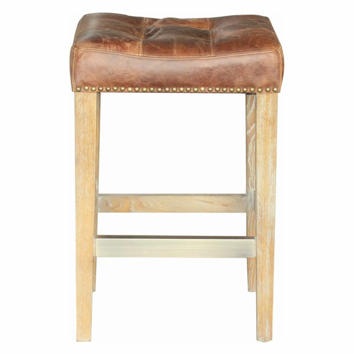 Update your rustic-style in-home eatery with the chic C2A French Nailhead Trim Elevate Leather 26 in. Counter Stool. This square, straight-legged stool is crafted from durable wood in a sturdy, long-lasting build. The luxuriously warm look of faux leather is accented by a metal footrest bar and nail head trim to easily match your current dΓ©cor. No assembly required.