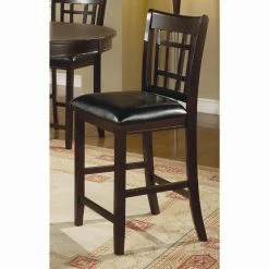 Complete your ideal room design with some classical seating thanks to the Coaster Furniture Lavon 24 in. Counter Height Chair – Set of 2. This counter-height stool is sized perfectly for kitchen counters and taller dining tables, supported by a towering block wood frame with stretcher supports. The backrest of the piece is armless and boasts an open slat checkerboard design. A handsome vintage brown finish tops the wood. High-density foam cushions the seat, upholstered with rich black leatherette.