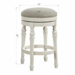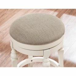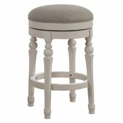 With a classic, country-chic design and durable construction, the Comfort Pointe Colebrook Backless Counter Stool has the style and structure to be a versatile seating option in your home for years to come. The backless stool has a solid birch wood frame and turned legs with a white finish. Its cushioned seat is upholstered with a cotton-polyester material that provides exceptional comfort, as well as a convenient swivel function that allows you to twist 360 degrees in comfort. The stoolβs seat is easy to adjust to your desired height, so it can easily raise or lower to your tableβs height, whether itβs the kitchen counter, dining table, home bar, or beyond. The stoolβs legs have sturdy circular footrest for added stability, plus slim foot glides on the bottom that protect your homeβs floors.