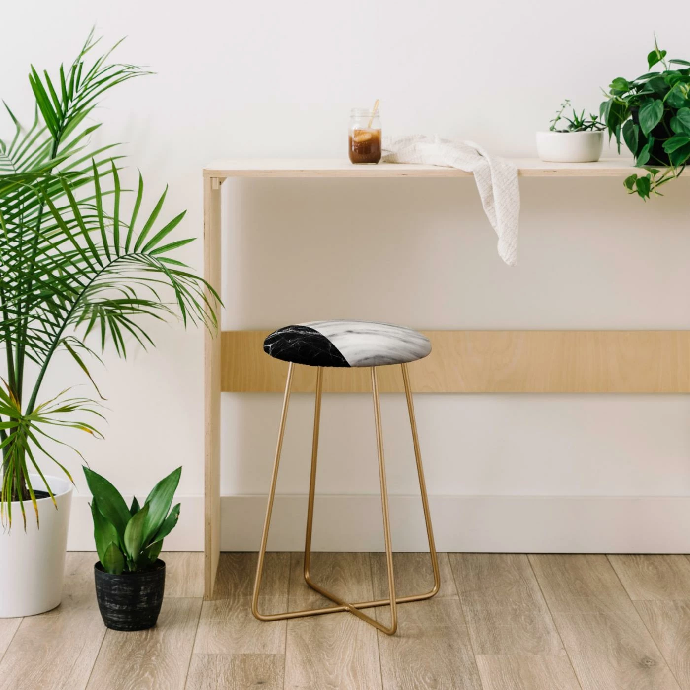 Go bold by adding the Deny Designs Emanuela Carratoni Marble Collage with Pink 25 in. Backless Counter Stool to your eat-at breakfast counter or conversation table. The faux leather seat is printed with an original marbled design by artist Emanuela Carratoni. For add glamour, it stands on slim metal legs offered in your choice of available metallic finish. This counter stool is custom-made in Denver, Colorado.
