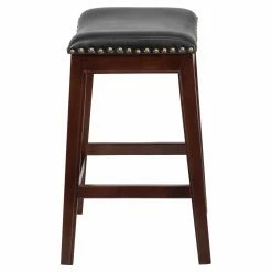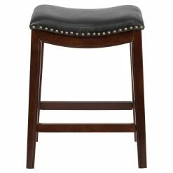 Lend a sleek, traditional style to your kitchen, tall table, or game room with the Flash Furniture 26 in. Backless Wood Counter Height Stool with Black Leather Saddle Seat. This backless, counter-height stool boasts a comfortably cushioned, black faux leather upholstered saddle seat trimmed with nailheads. The rubberwood frame comes in your choice of available finish and includes a wrap-around footrest and protective floor gliders.