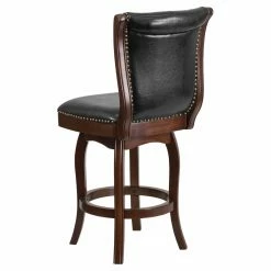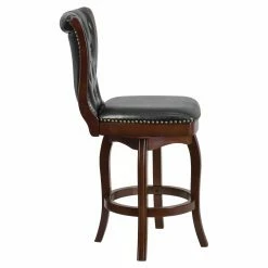 The Flash Furniture 26 in. Square Cappuccino Wood Counter Height Stool with Black Leather Swivel Seat elevates your decor with a refined silhouette, durable construction, and luxurious comfort. This counter-height, swivel stool is an ideal addition to your kitchen, dining room, bar, or game room. It boasts a thickly cushioned, black faux leather square seat and back with nailhead trim and button tufting. The cappuccino-finished, rubberwood frame delivers strength and durability to this gracefully curved stool that includes a ring-style footrest and protective floor glides.