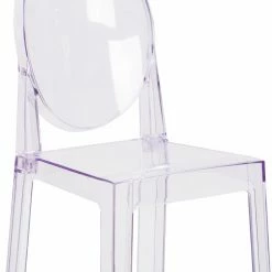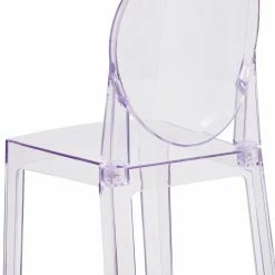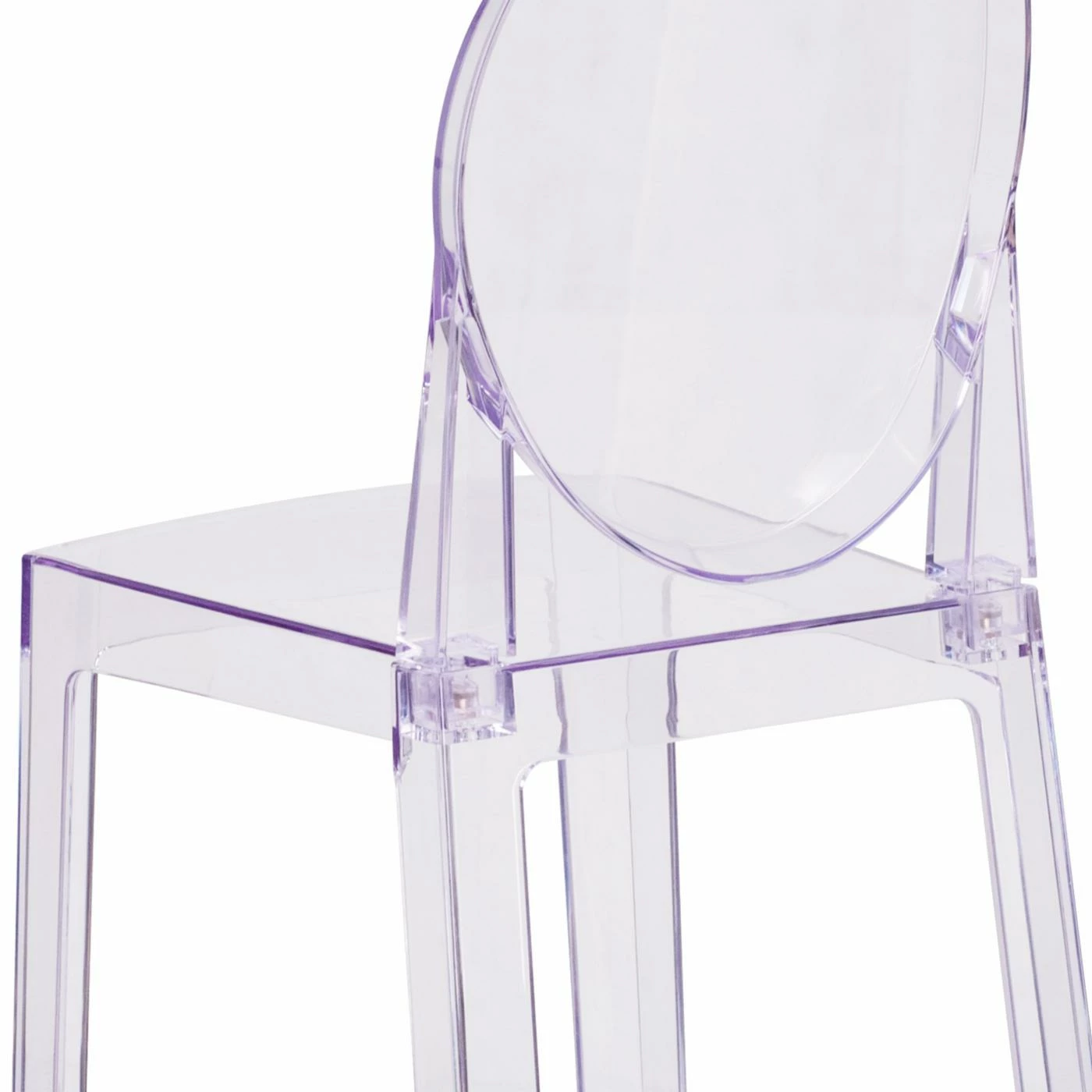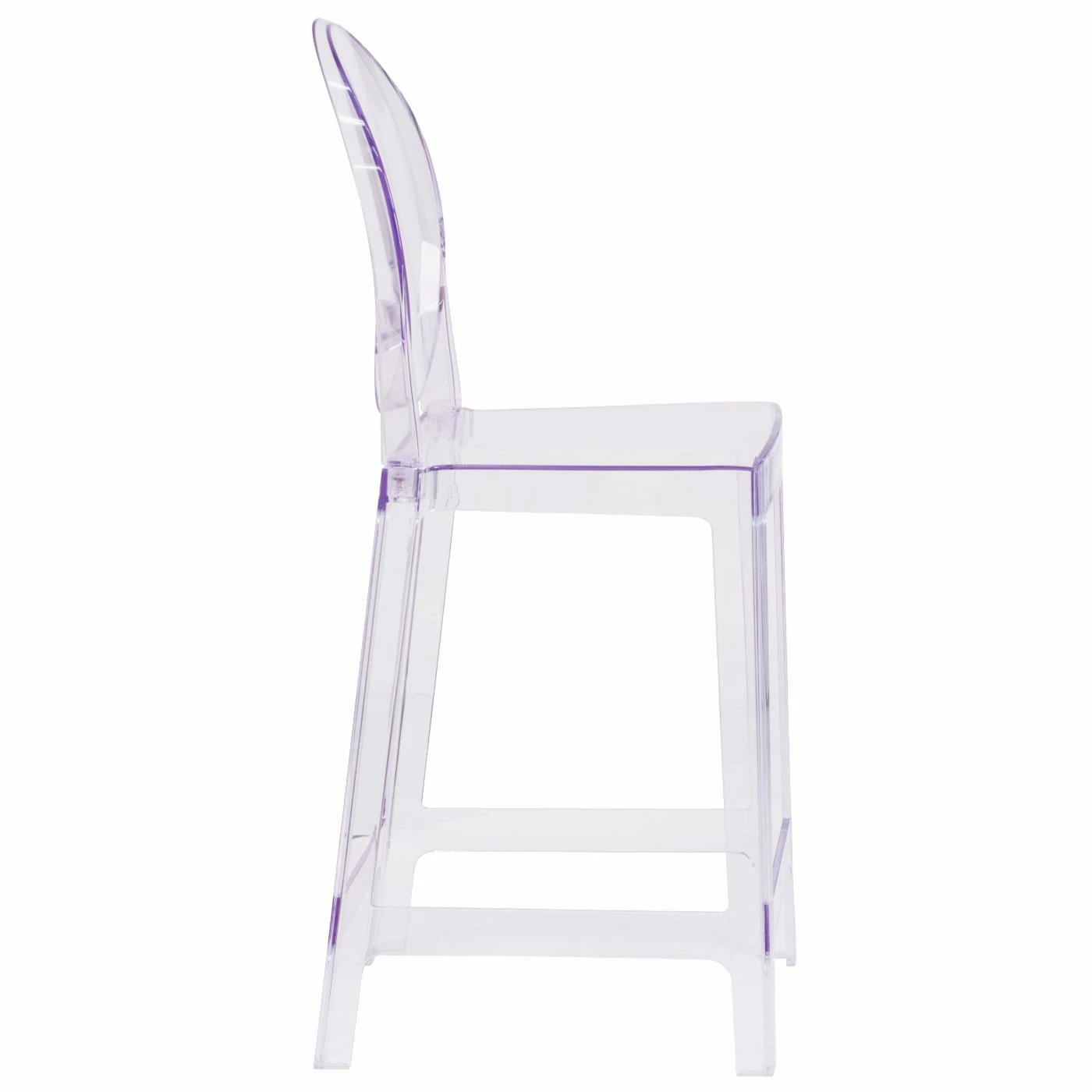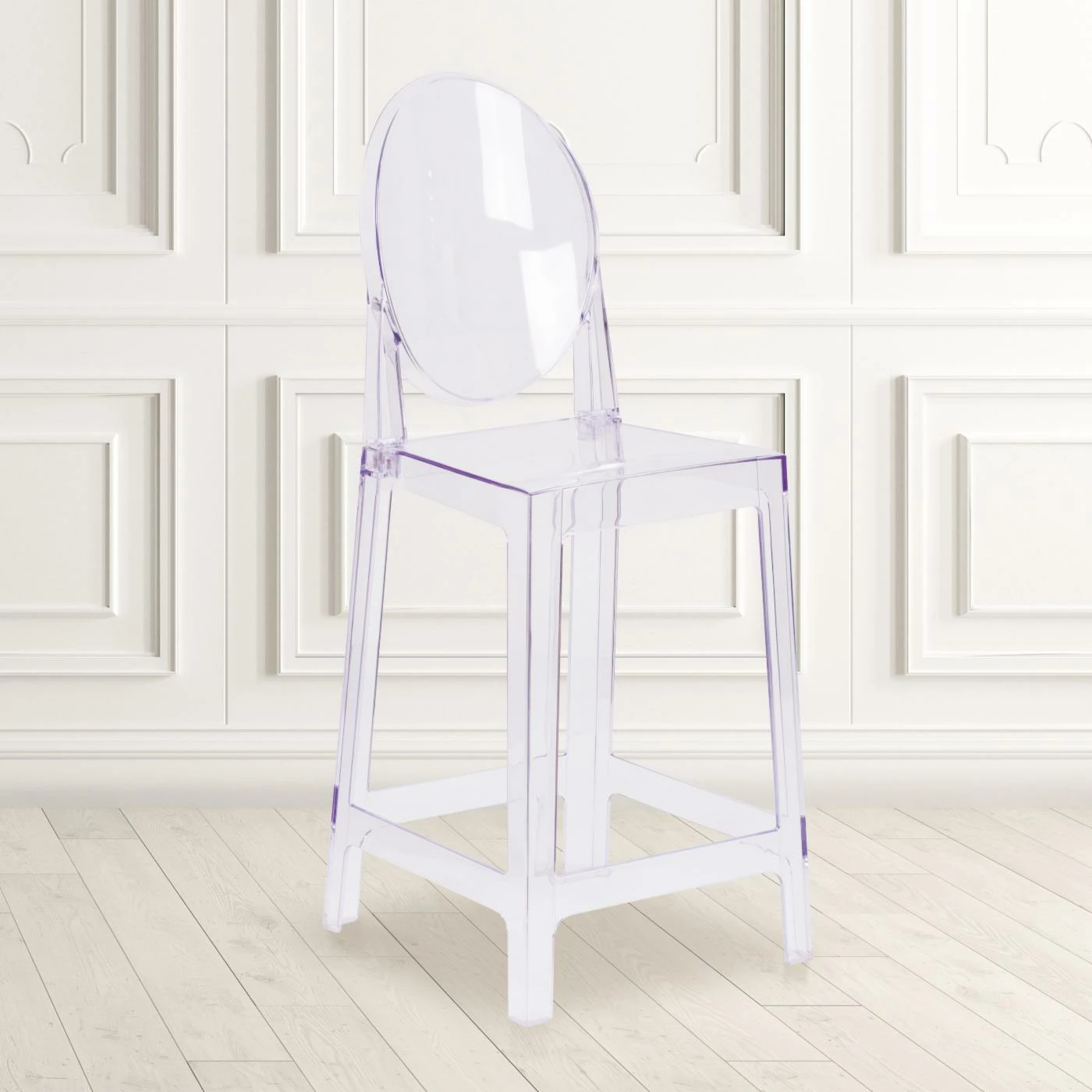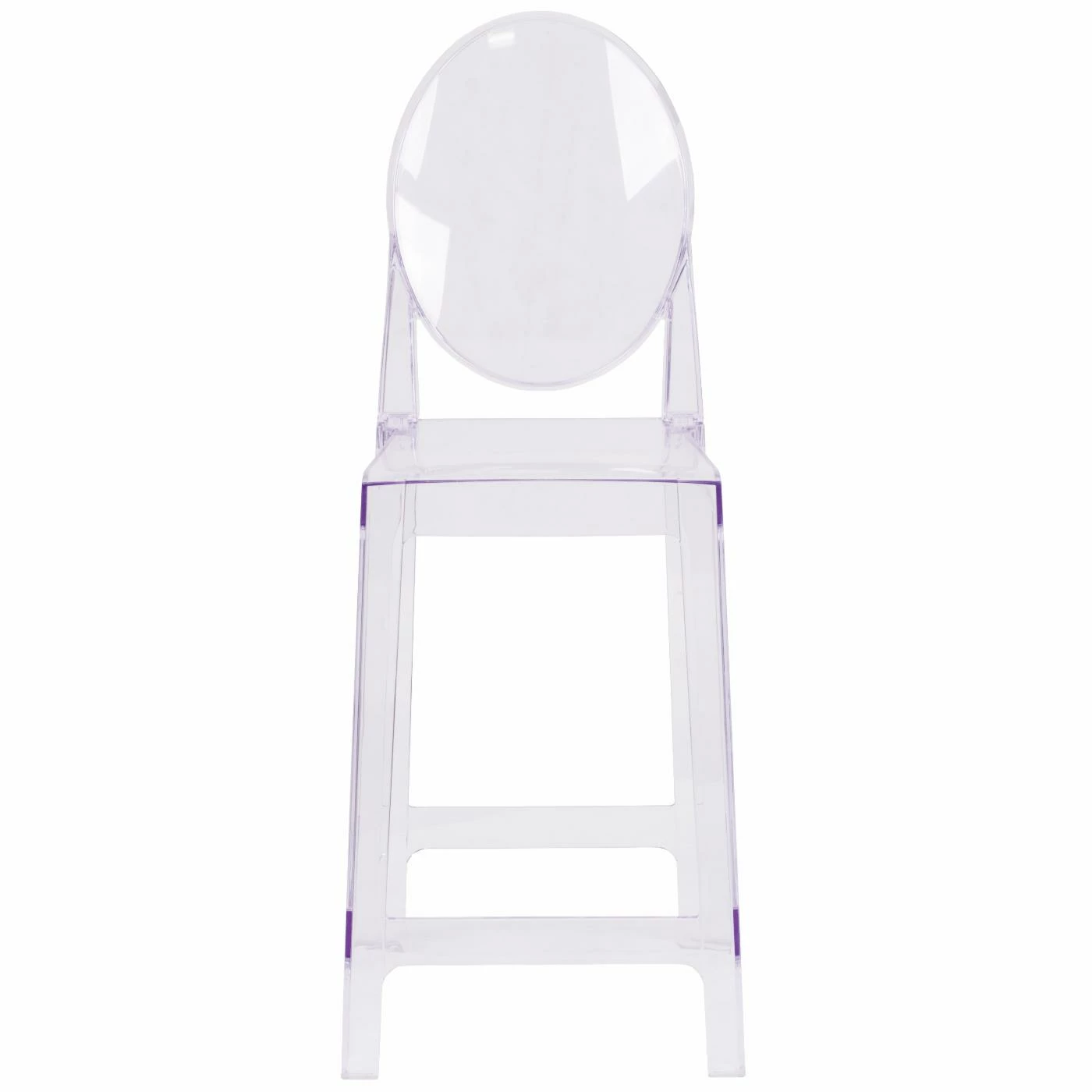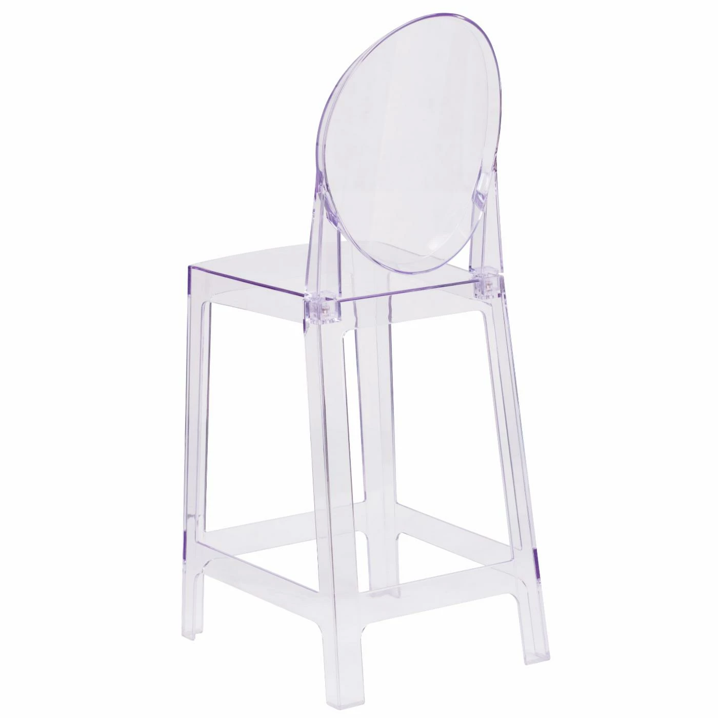 With its barely-there design, the Flash Furniture Ghost Counter Stool in Transparent Crystal with Oval Back is perfect for lightening a crowded space or making a small room appear larger. The counter stool is crafted of clear molded polycarbonate that’s built tough to resist shock, scratches, and water. The contoured seat ups the comfort factor, while protective feet guard against floor damage. Plus, this commercial-grade counter stool can be used indoors or out.
