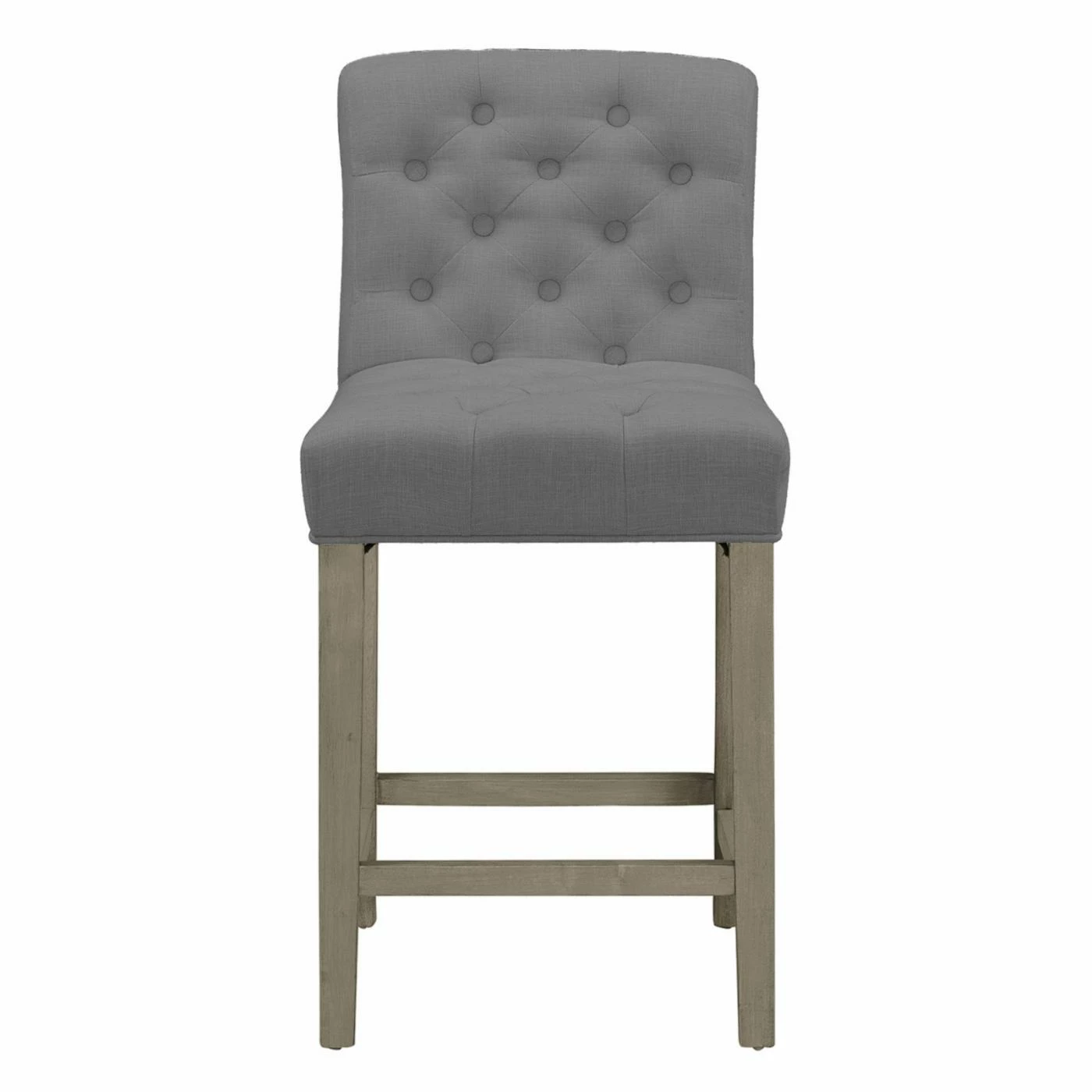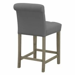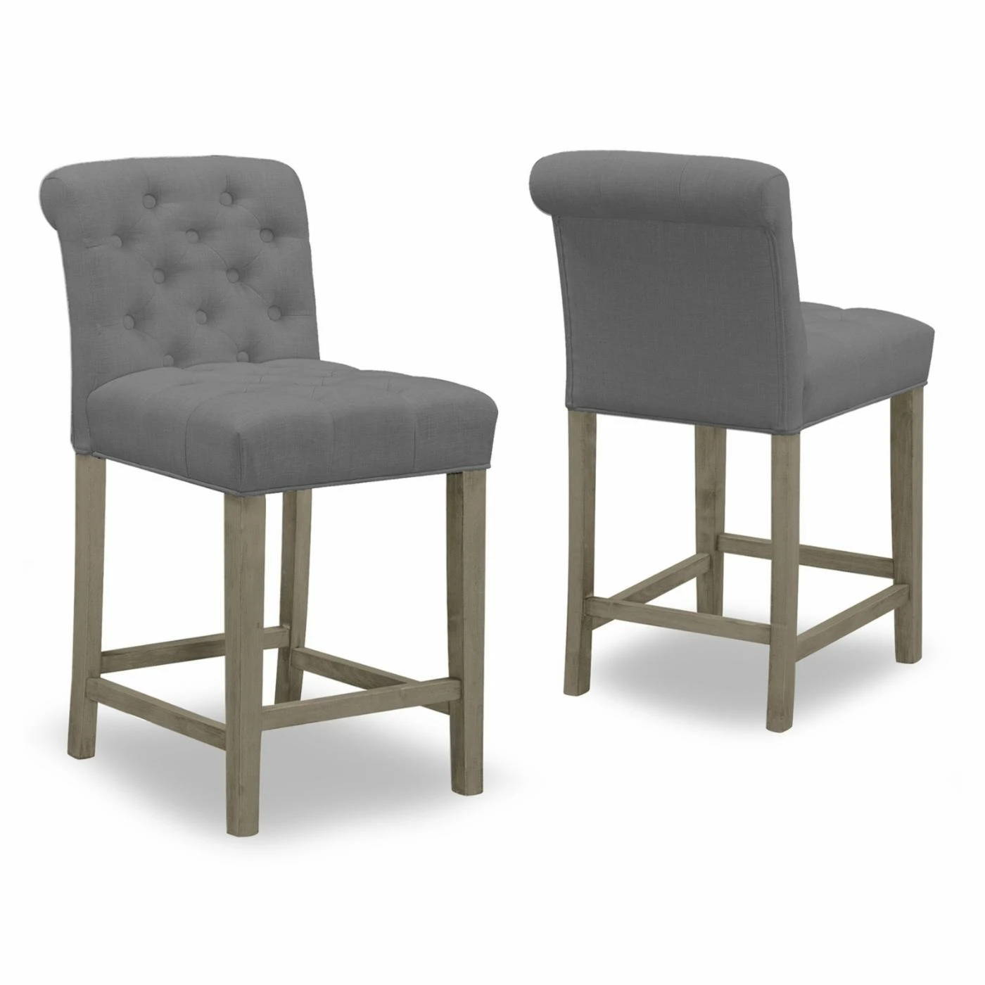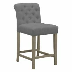 The clean lines and transitional style of the Glamour Home Alee 29 in. Upholstered Tufted Bar Stool – Set of 2 make these stools the perfect addition to any dining or entertaining space. High-density foam cushions are covered in gray fabric upholstery and boast tufted details for added interest. Natural wood legs feature an antique finish to complement the neutral hue of the fabric, allowing you to coordinate this charming set with a wide variety of decors.