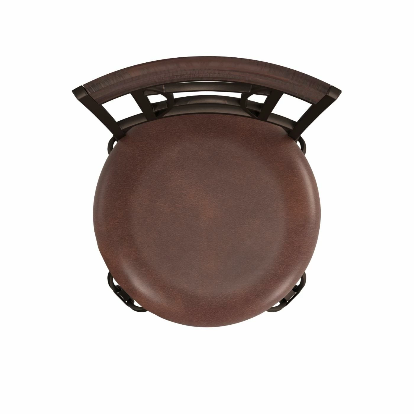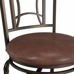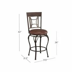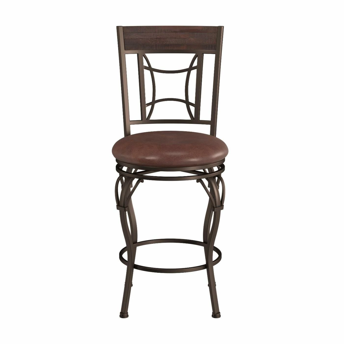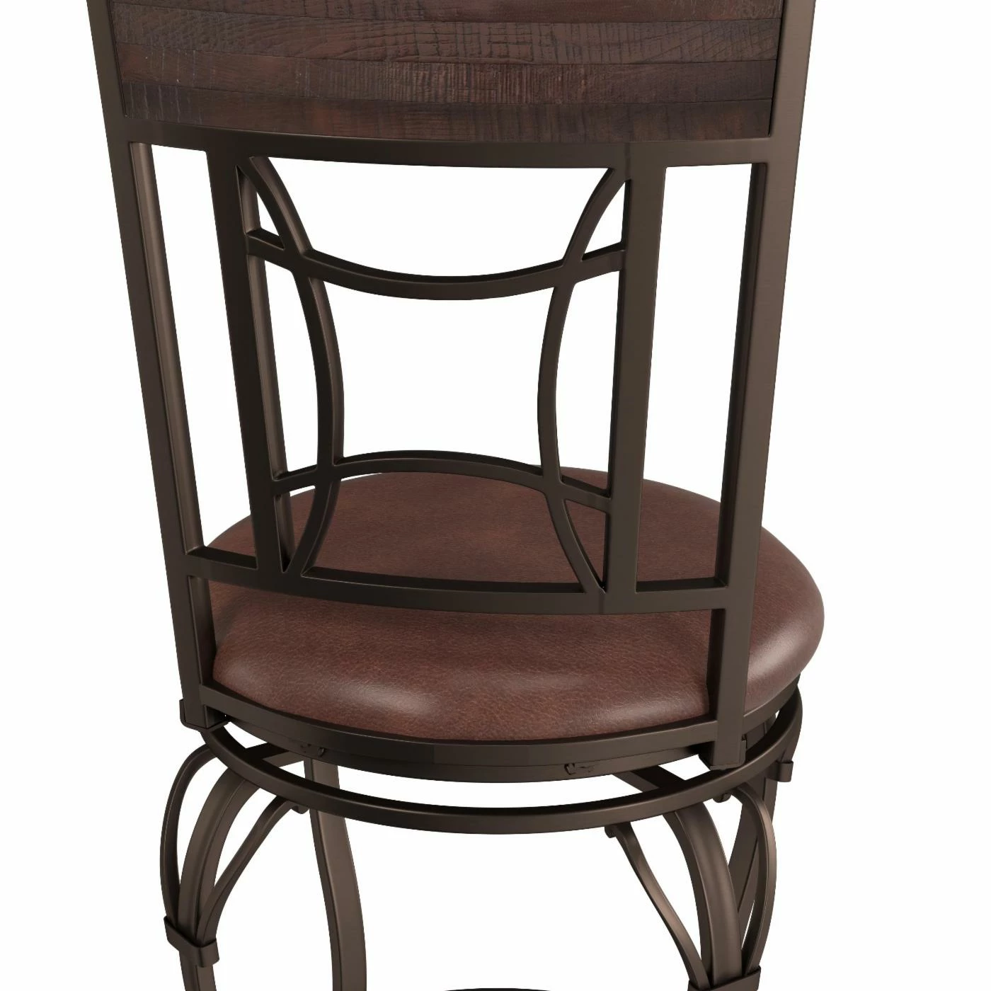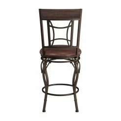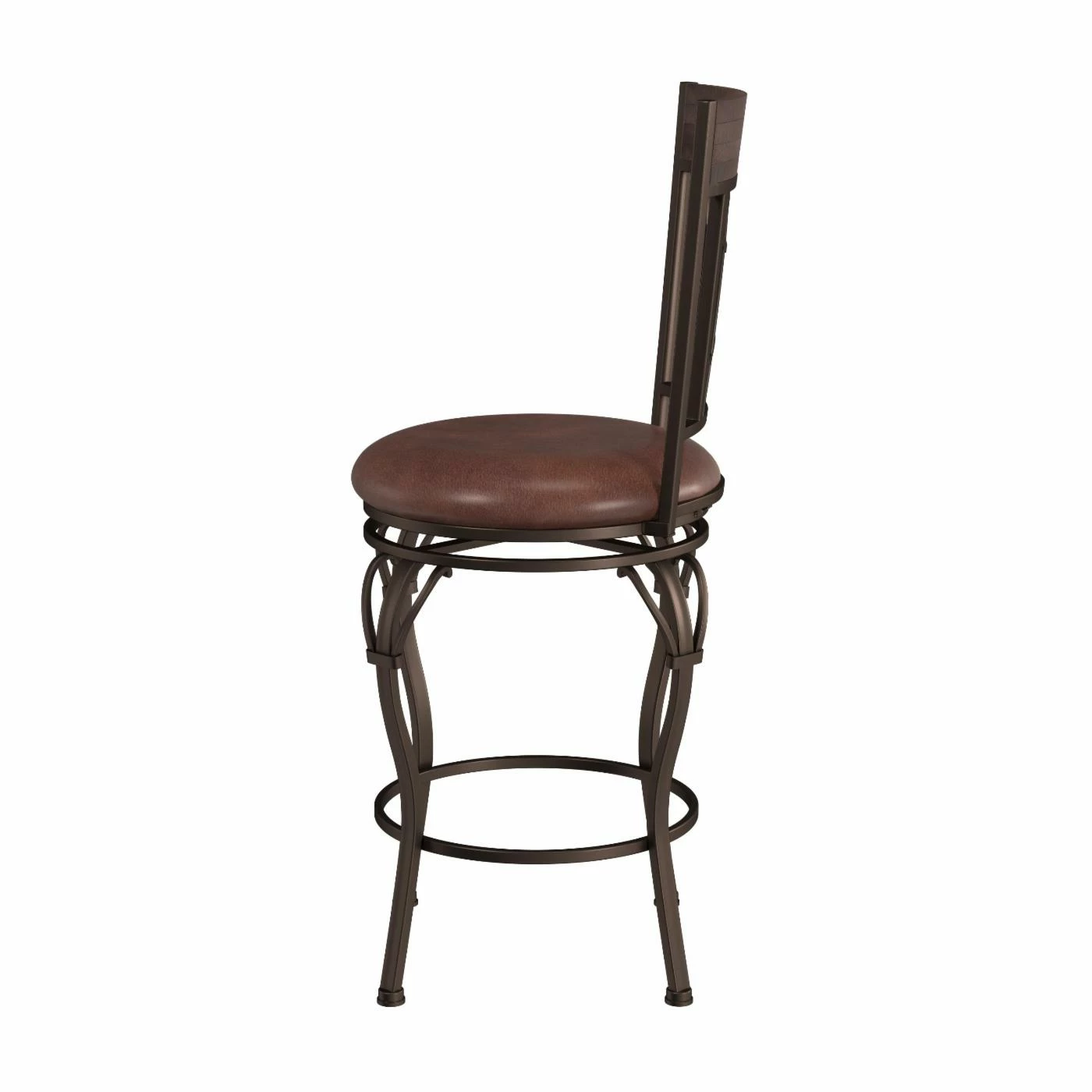 Rich color and an elegant framework define the Hillsdale Furniture Granada Swivel Counter Stool. This distinctive seating option is far from an ordinary stool. For one, it has a back and quite the decorative one. Supporting your lumbar region are graceful metal arches that rise to a bamboo-inspired wooden top rail all in a dark brown finish that coordinates well with any dΓ©cor from the traditional to the contemporary. The lighter tone of its wood accent pairs nicely with the antique russet color of a plump vinyl seat that spins a full 360 degrees so you can easily exit a table or turn to face a friend. Completing the look is a shapely foundation comprised of cabriole-inspired legs braced with an all-around foot ring. Some light assembly is required.