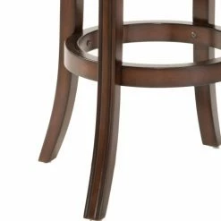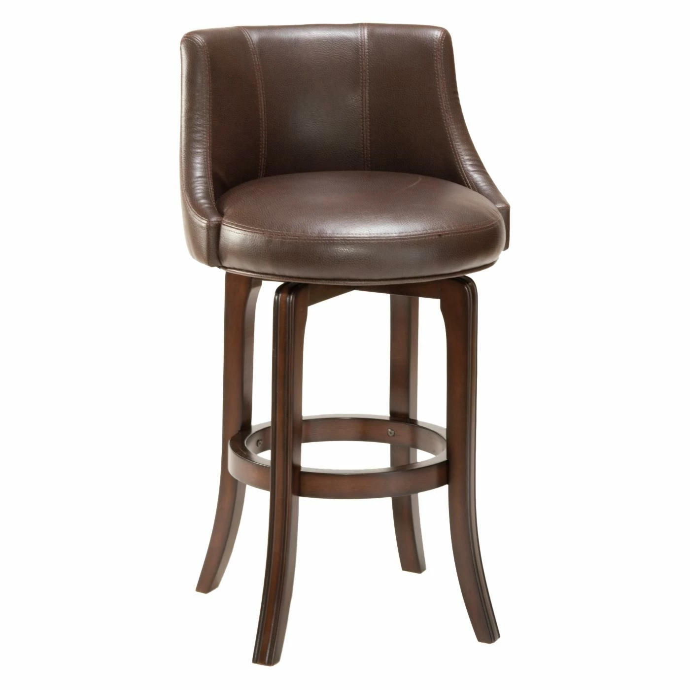 The transitional Hillsdale Furniture Napa Valley Swivel Counter Stool is an immensely comfortable seating option ideally suited for a kitchen island, cocktail lounge, or dinner table. Constructed of solid wood and dark brown cherry veneer, the stool is definitely built to last, and the rich hue complements nearly any dΓ©cor. Its expertly crafted base is comprised of four tapered legs connected by a ringed brace that doubles as an all-around footrest for your 360-degree swivel. The spinning seat is generously padded and upholstered in brown bonded leather that continues throughout the cushioned barrel back. The contoured backrest is made all the more visually interesting with detailed stitching effects. Some light assembly is required.