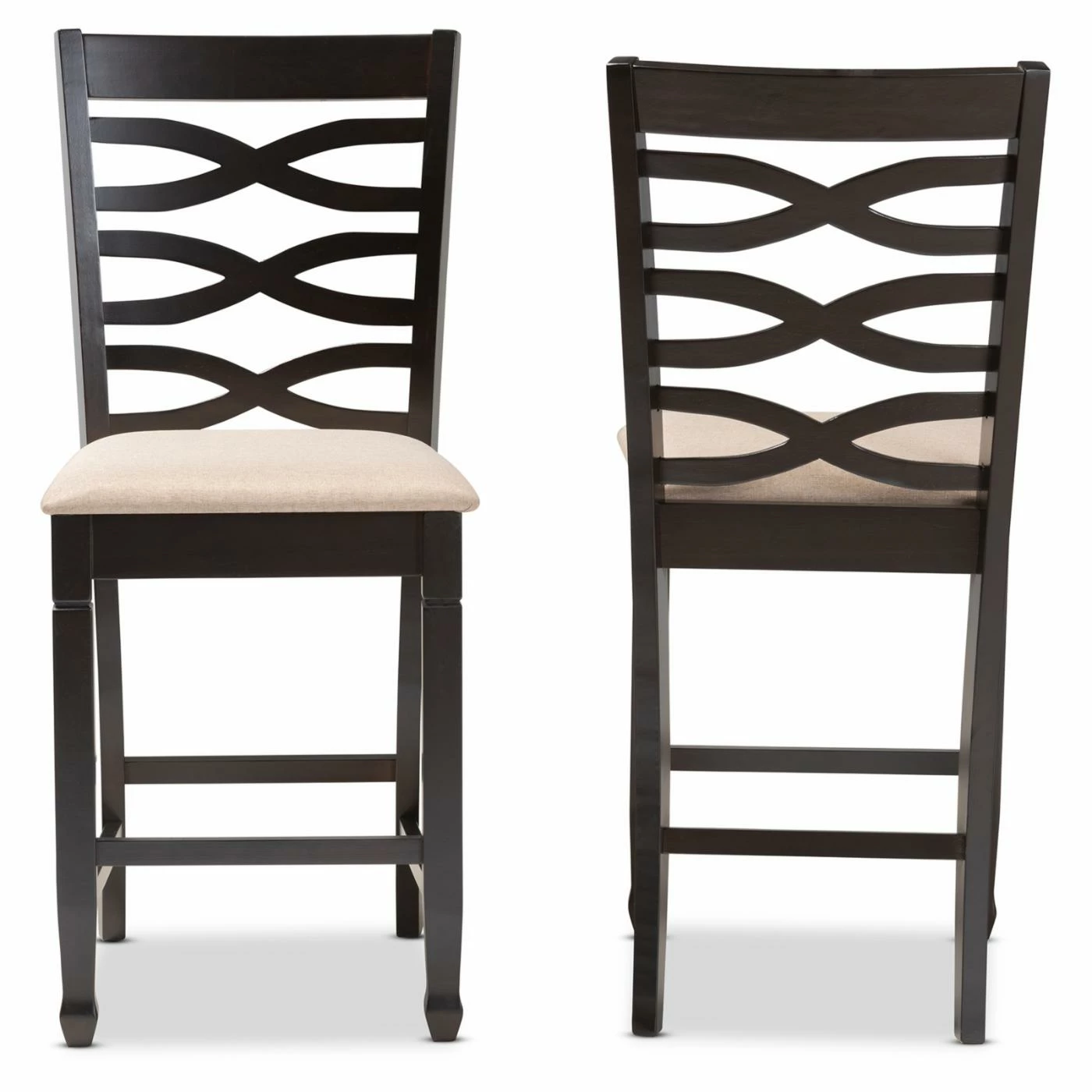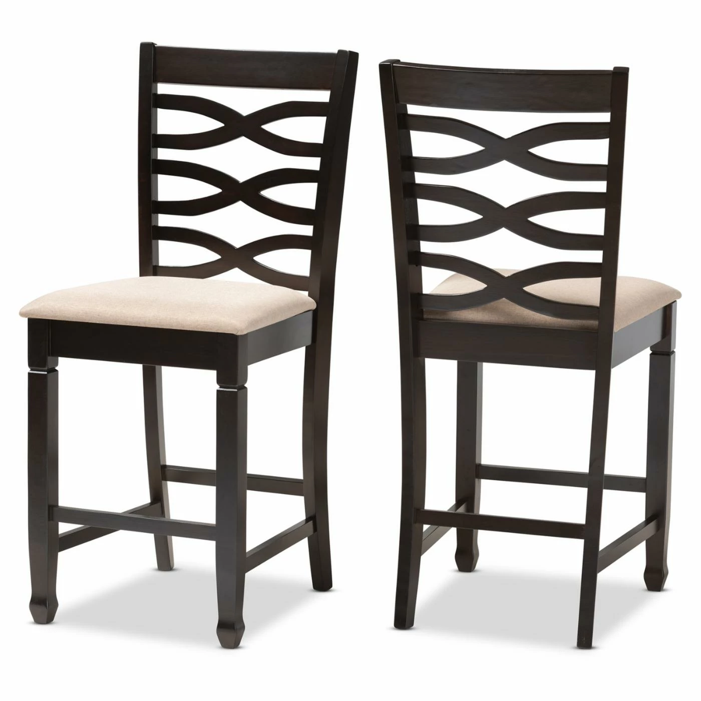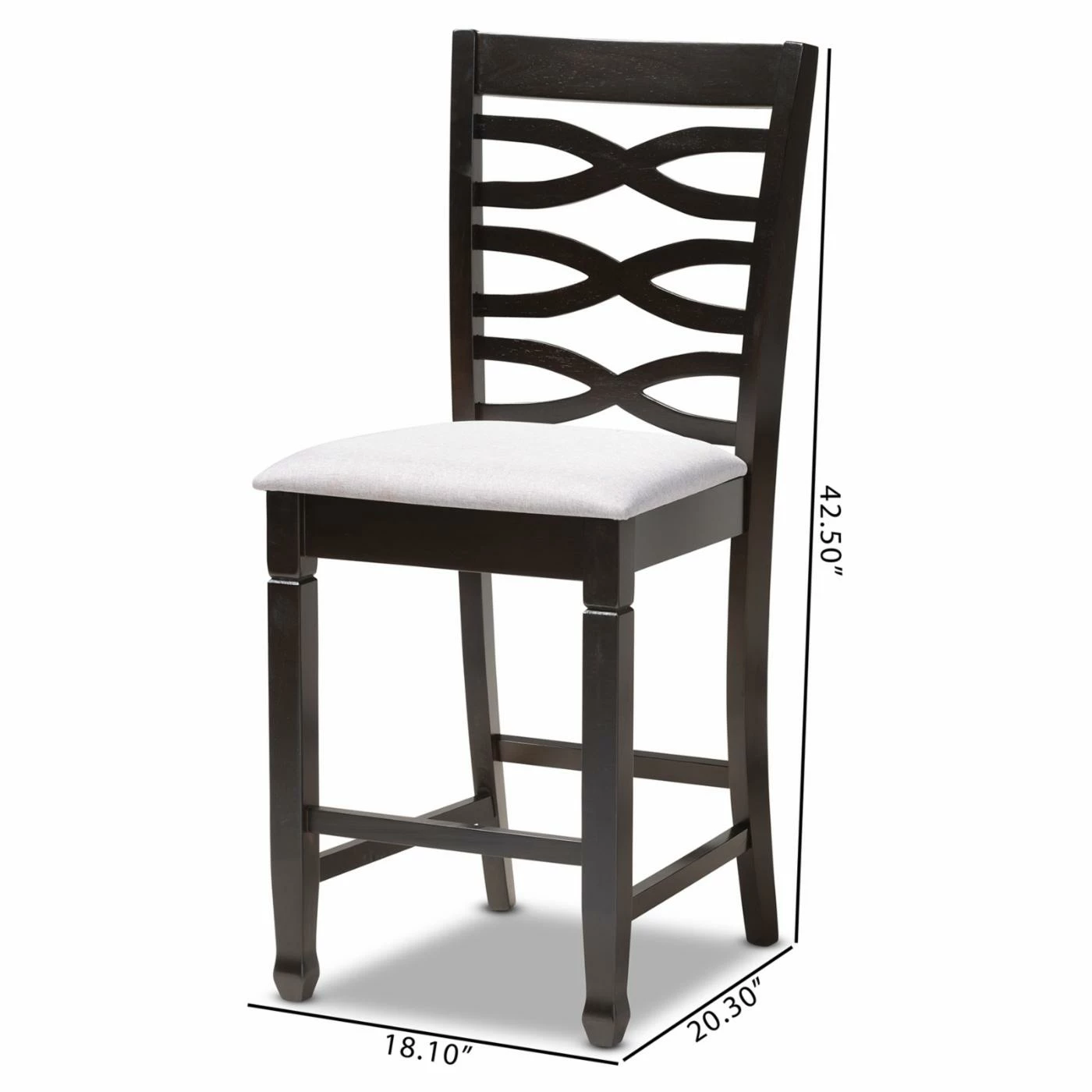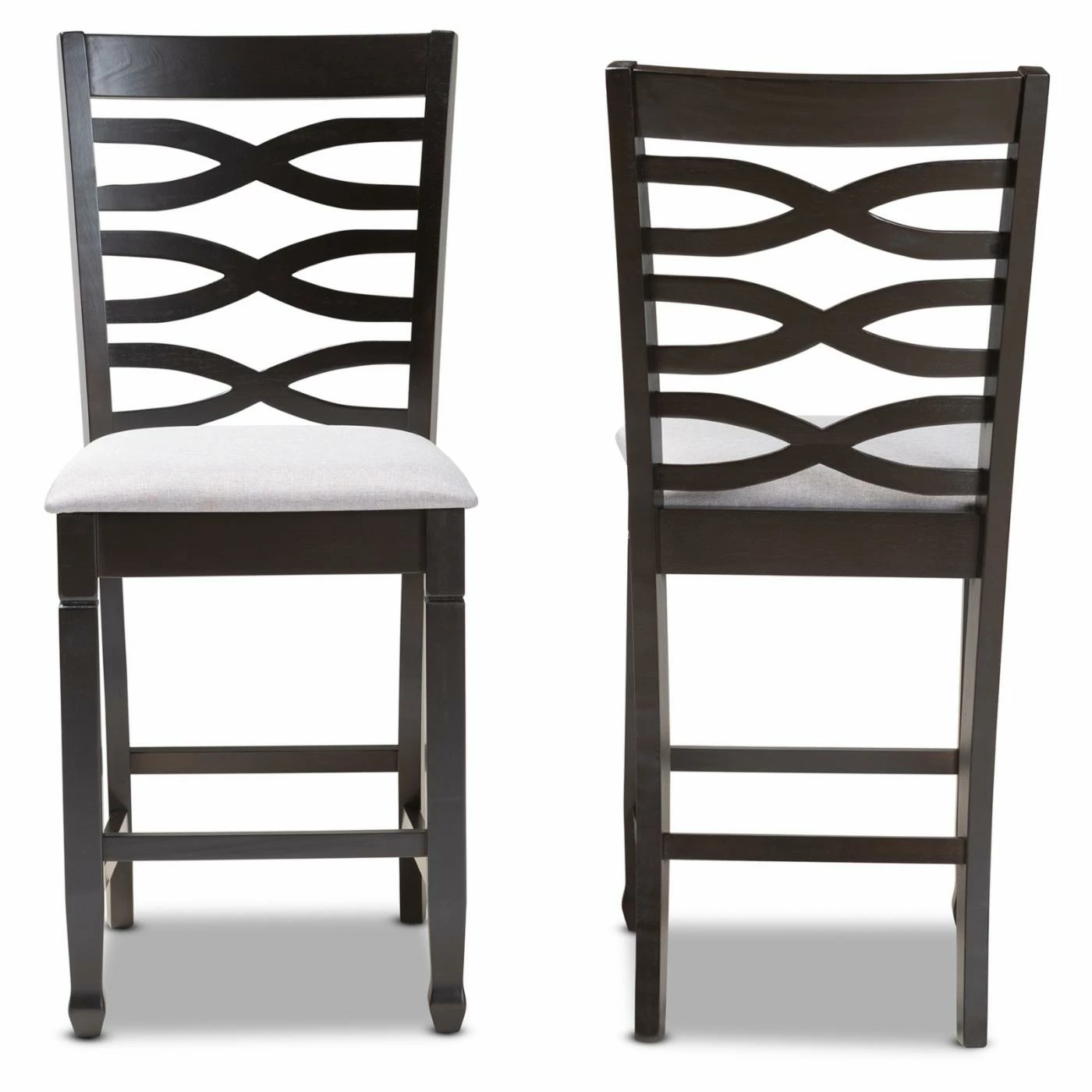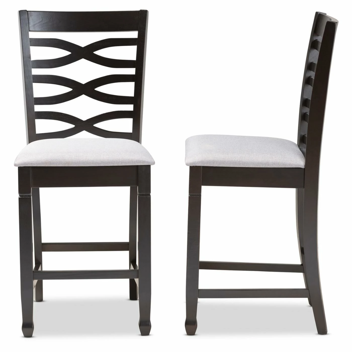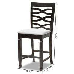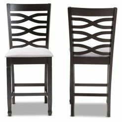 The HN Home Burbank Transitional 25 in. Upholstered Counter Height Chair – Set of 2 add a touch of contemporary style to any kitchen or dining room. Each armless chair has a rubberwood frame in finish options, and the foam cushions are upholstered in comfortable polyester fabric. Choose from available fabric colors to find the one that works best for your home. The chairs also include bars to rest your feet on, and the chair backs have an intricate, horizontal cut-out design that adds visual interest to the piece. Some assembly required.