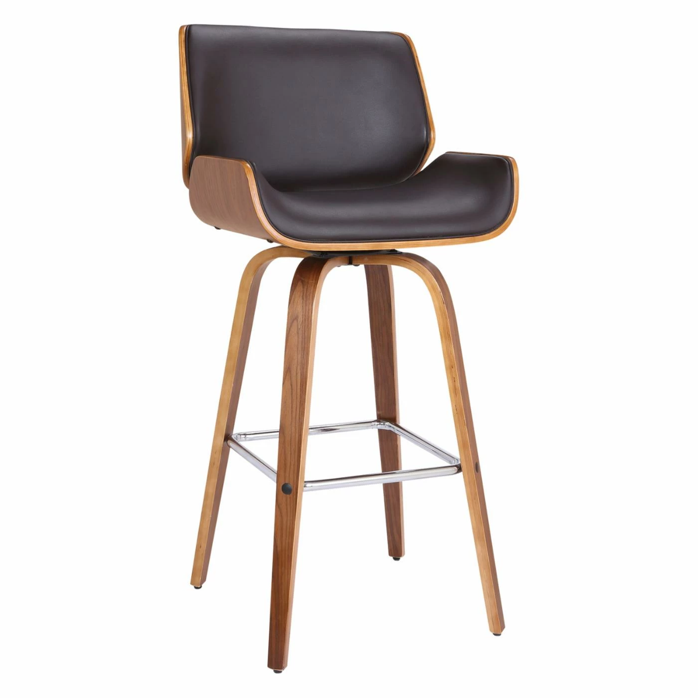 Talk about curve appeal! The curved seat on the Home Chic Reed 26 in. Swivel Counter Stool makes it a great pick for mid-century modern spaces. You’ll find similar curves on the poplar wood legs, and you’ll love how their brown finish complements the black faux leather upholstery. A metal footrest in a chrome finish adds a hint of shine, and the 360-degree swivel on the seat puts the perfect spin on it all.