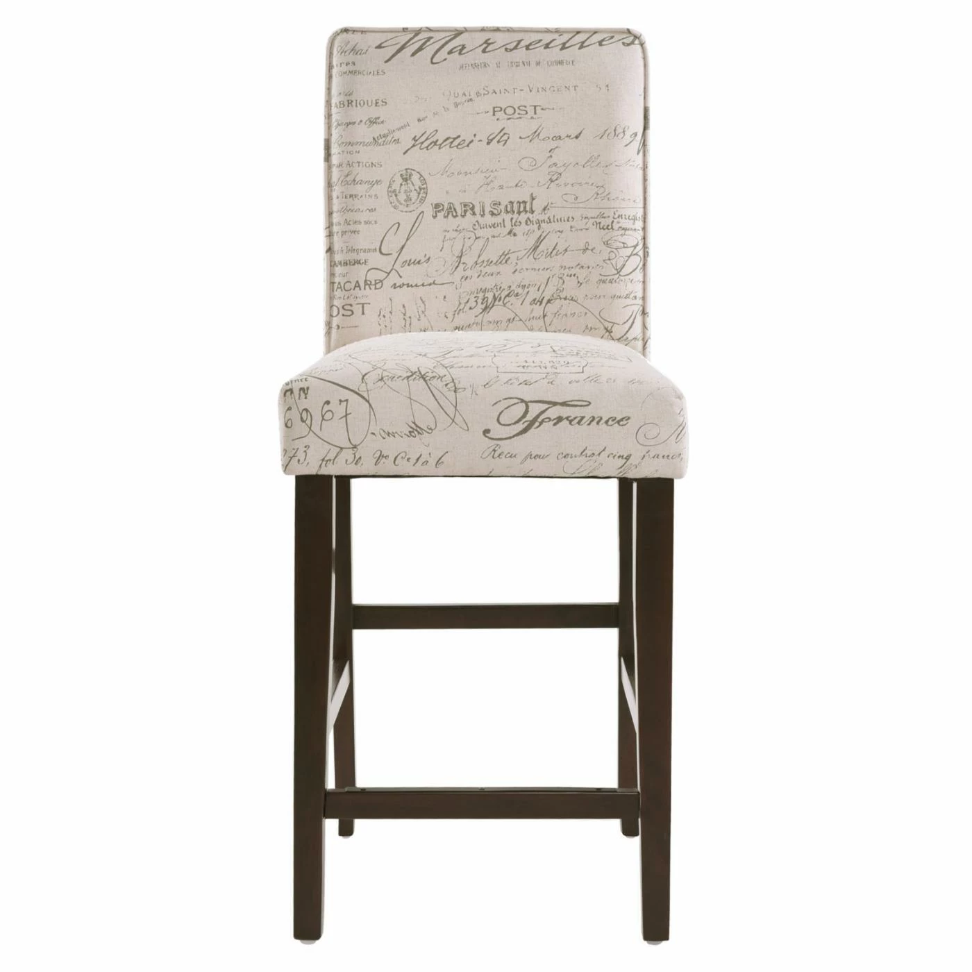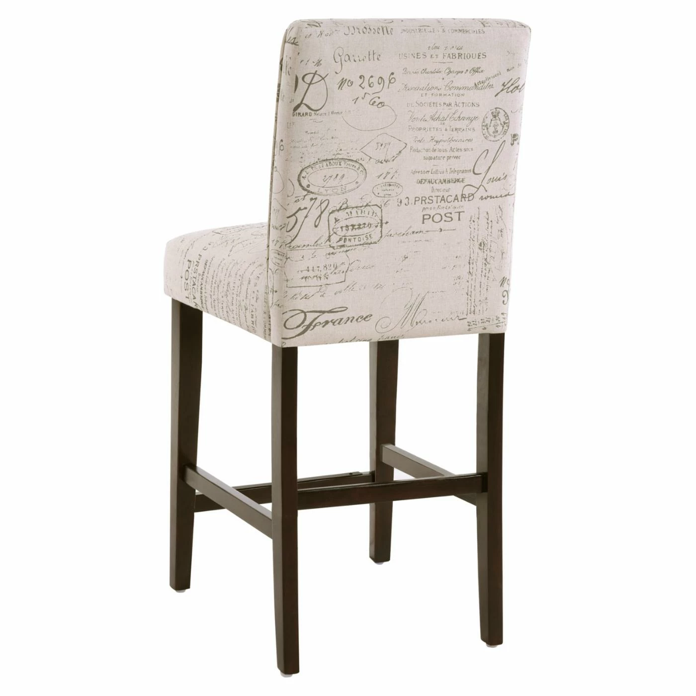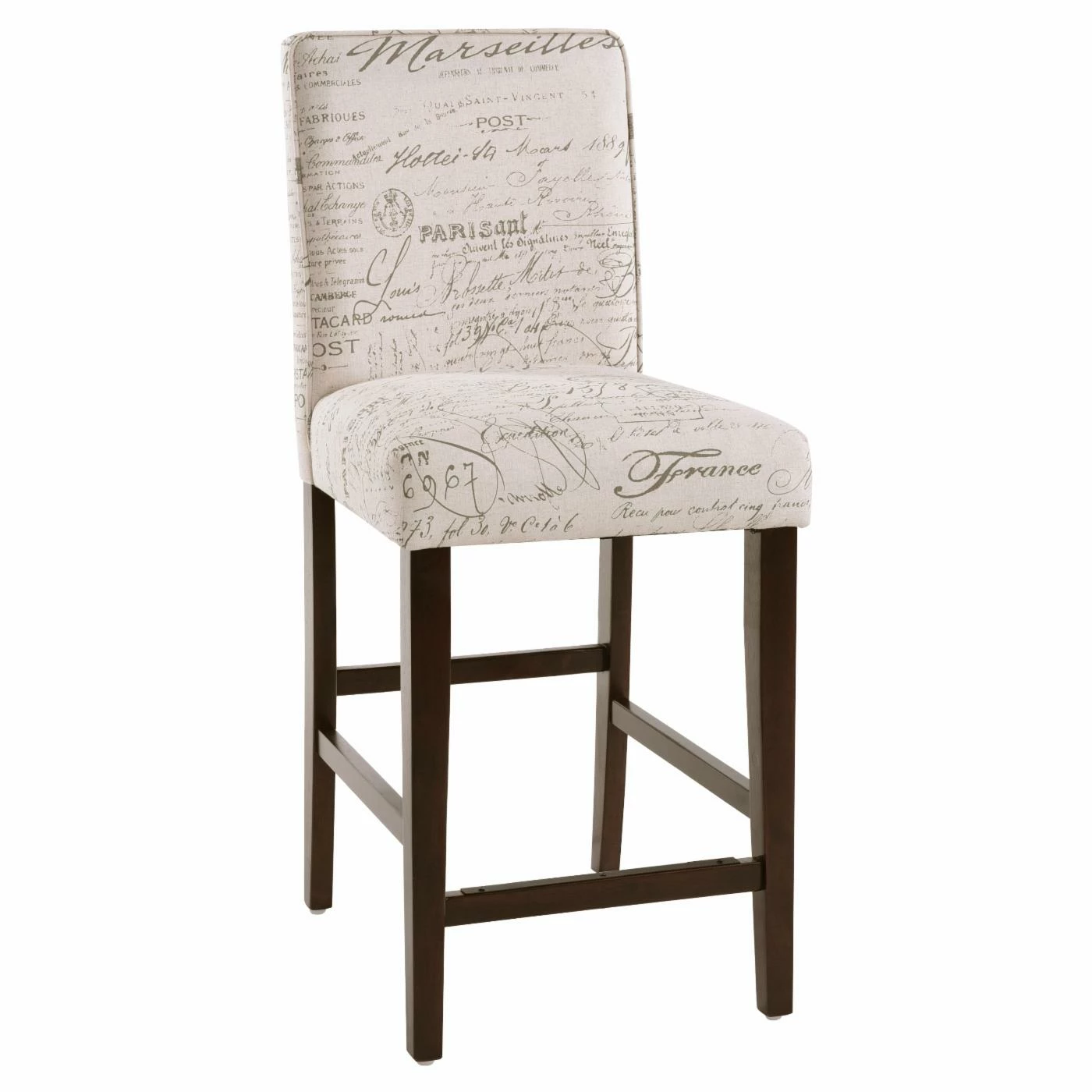 Transform your kitchen into a casual, country-style escape from the rest of the world with the HomeFare Club Projects Paris Script 24 in. Upholstered Counter Stool. This armless stool fits right into your countertop or counter-height table. The frame is crafted from hardwoods with block tapered legs and a decadent cherry-brown finish. The wide seat and tall back come padded with plush foam, upholstered in creamy polyester with a flourishing pattern of calligraphic script.