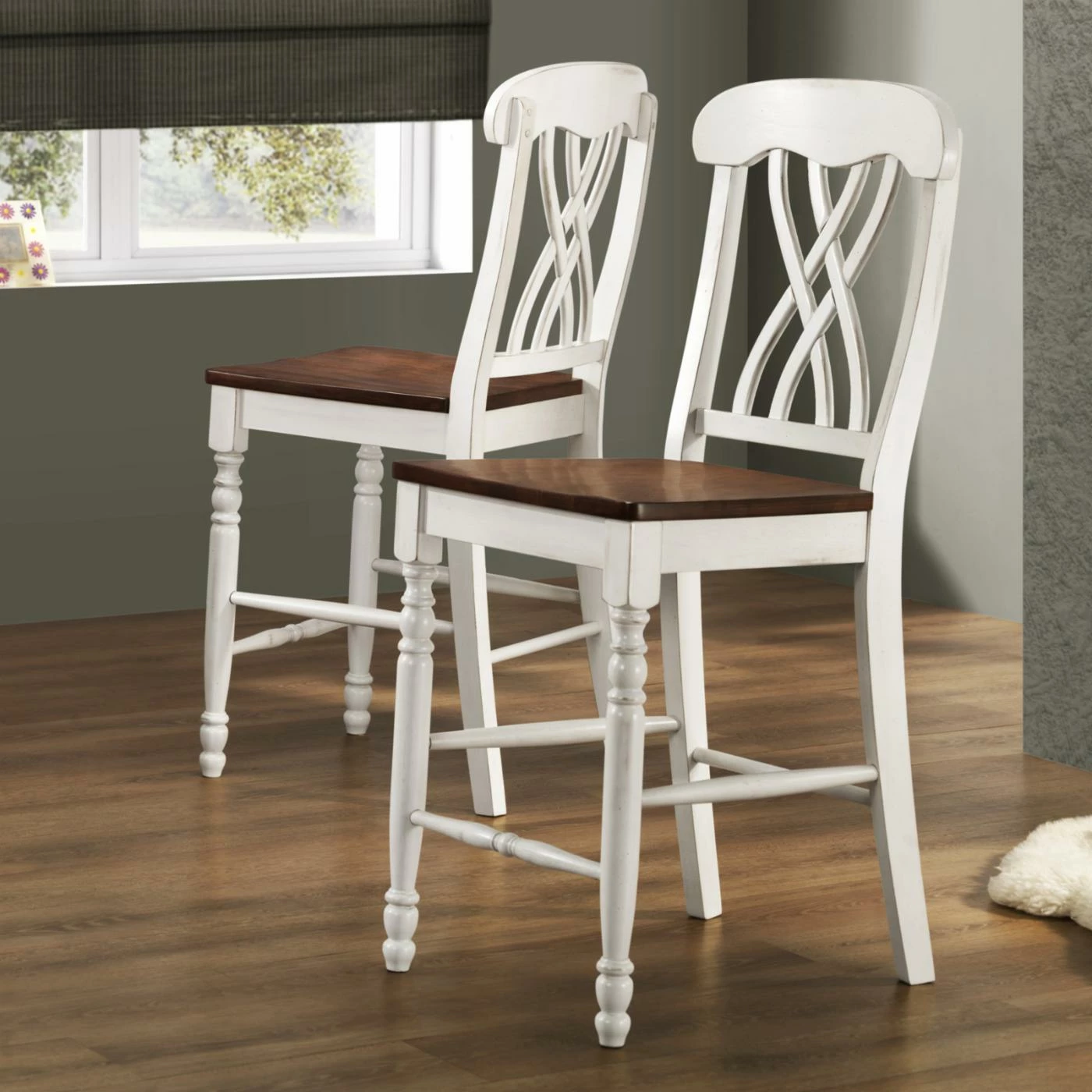 The HumbleNest Homestead Two Tone Counter Height Chair – Antique White & Cherry – Set of 2 embodies all that’s great about cottage style. First, take a look at the craftsmanship evident in the turned legs and curving, open back. The attention to detail extends all the way to the solid wood used in constructing each chair. And of course, let’s not forget the classic (and compelling) two-tone combo of antique white frames with deep cherry brown seats.