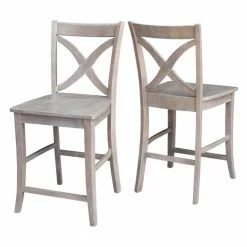 The curvy cross back design and washed gray taupe finish of the International Concepts Cosmo X-Back Counter Stool bring sophistication into your breakfast nook. This counter height stool is made of solid wood and includes footrests and a generous seat for comfort.