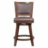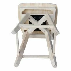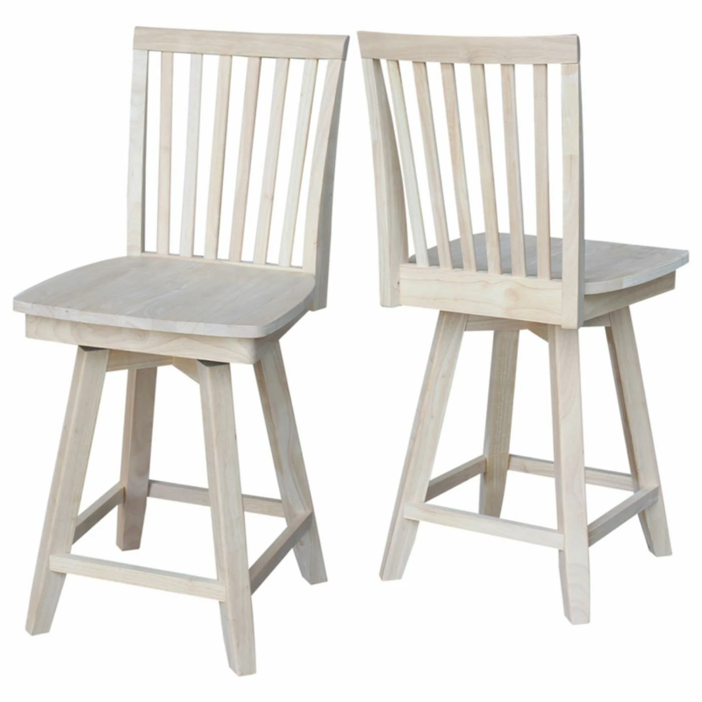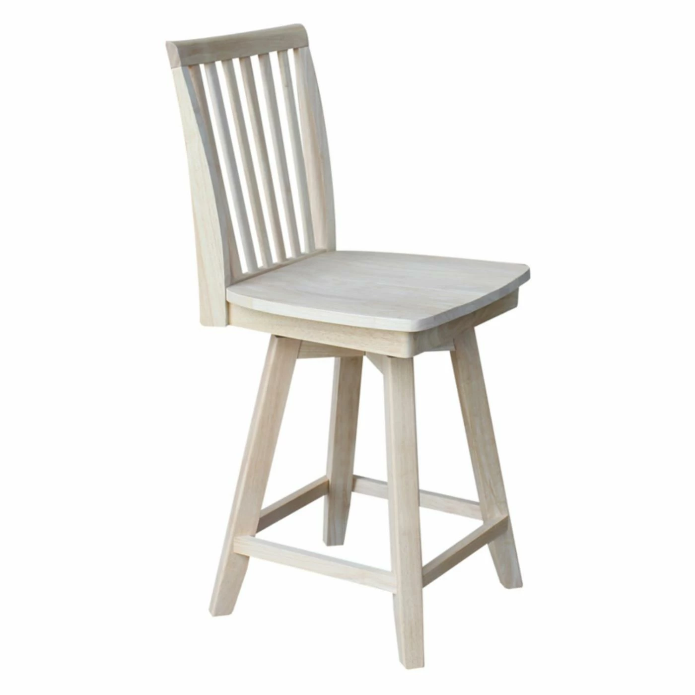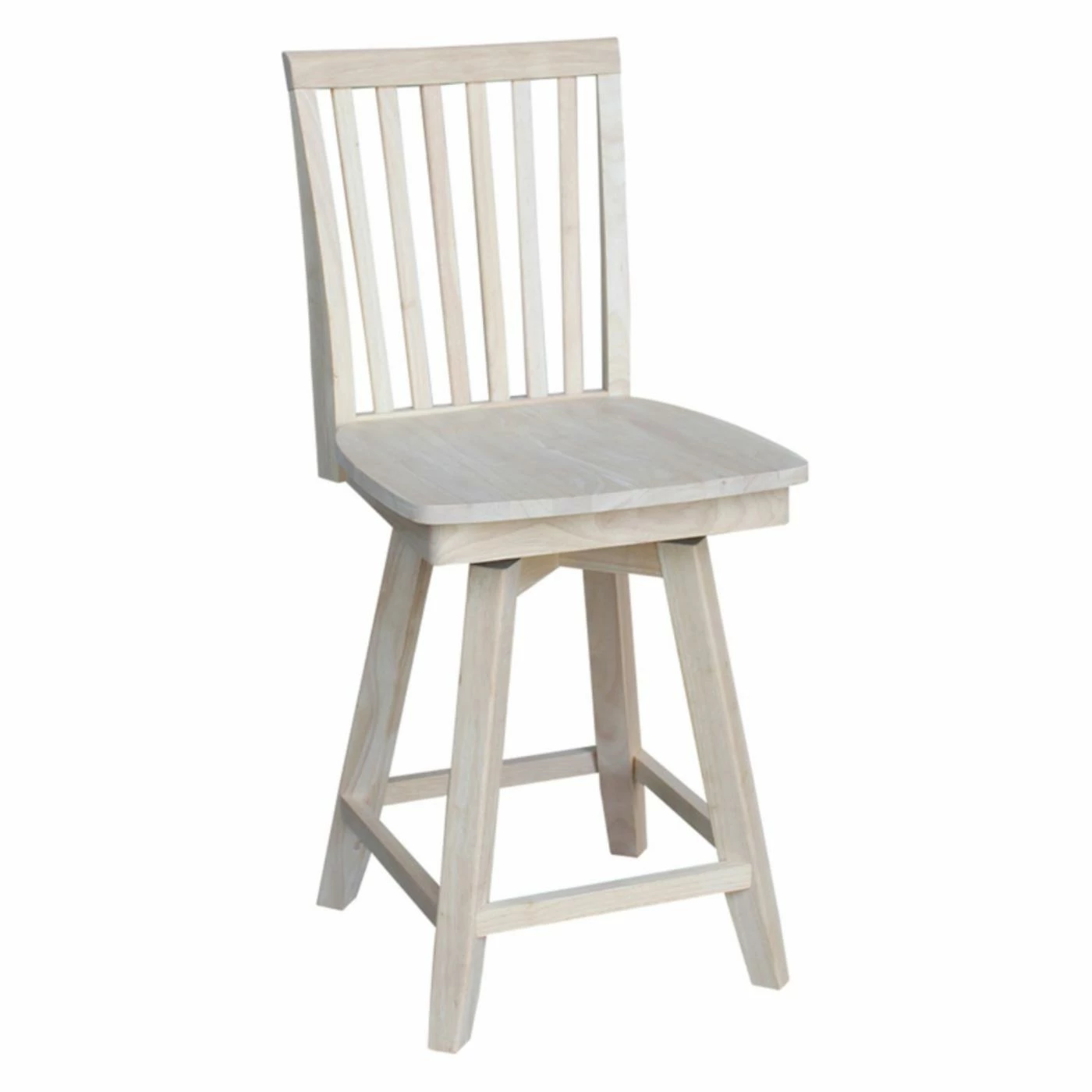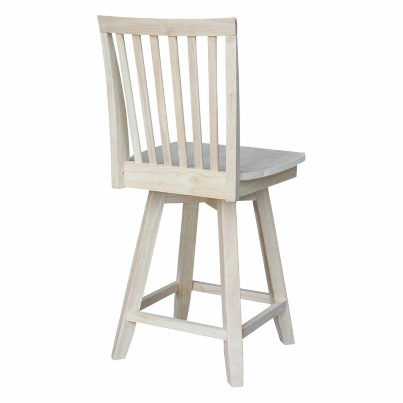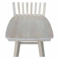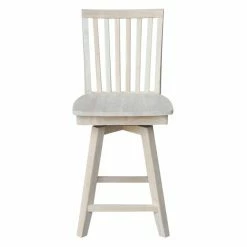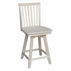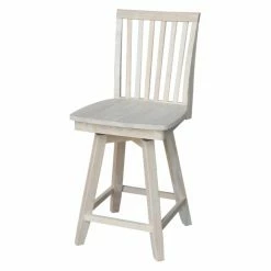 The traditional slat back design and your choice of available finish make the International Concepts Mission Swivel Counter Stool perfect for your farmhouse kitchen. Its 360-degree swiveling seat and handy footrests make this counter height stool comfortable.