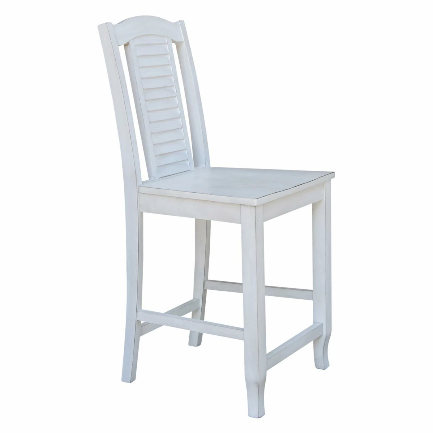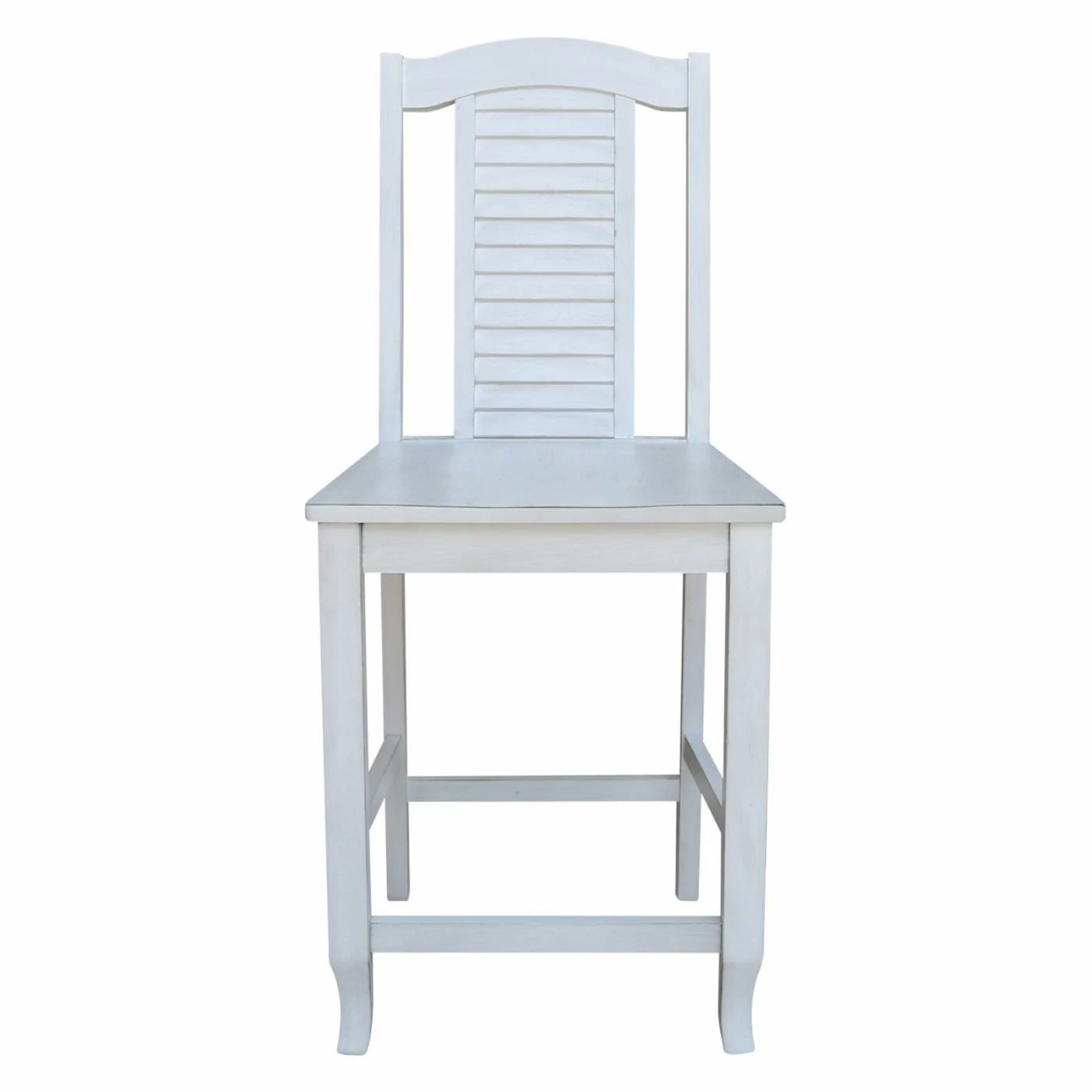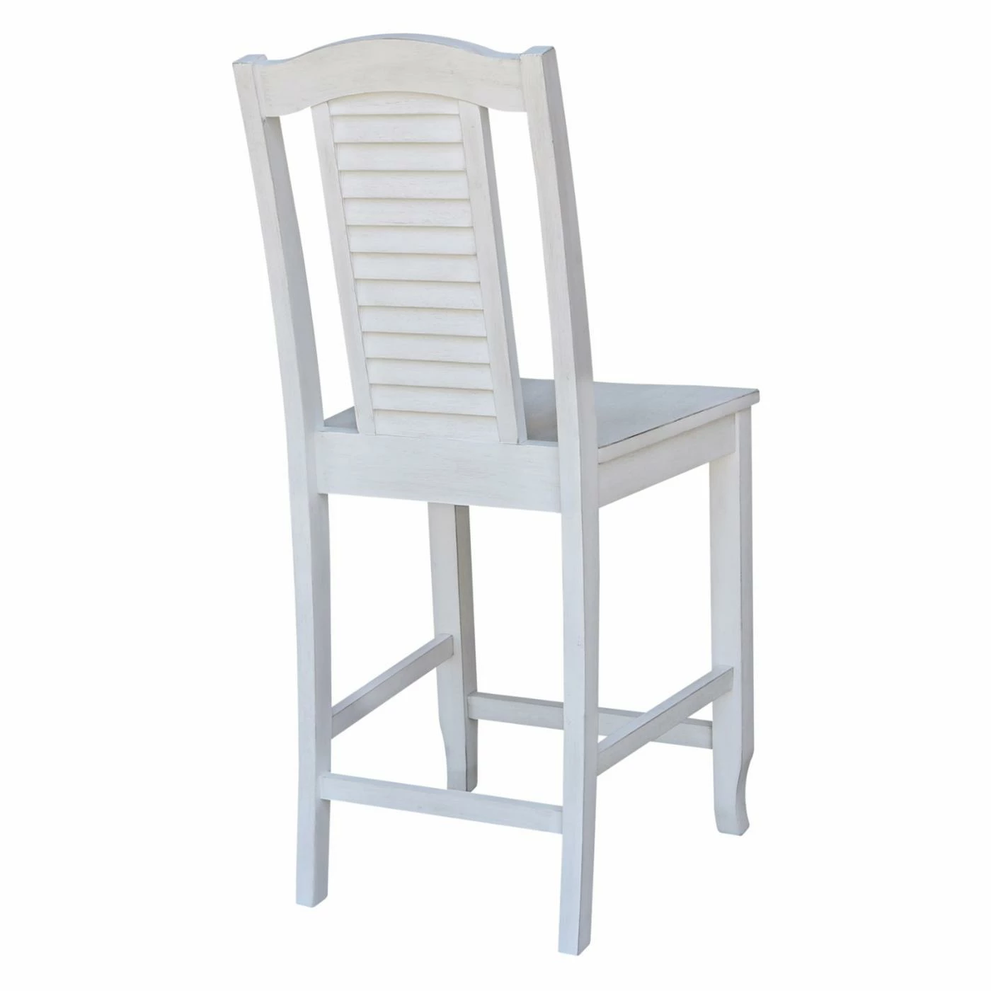 Update your coastal or cottage style space with the International Concepts Seaside 24 in. Counter Height Stool. This counter height stool is crafted from hardwood with a splat back design featuring a shutter-style insert. The antique chalk finish gives it a rustic yet refined vibe.