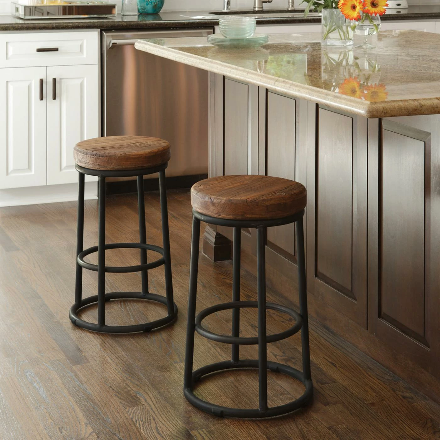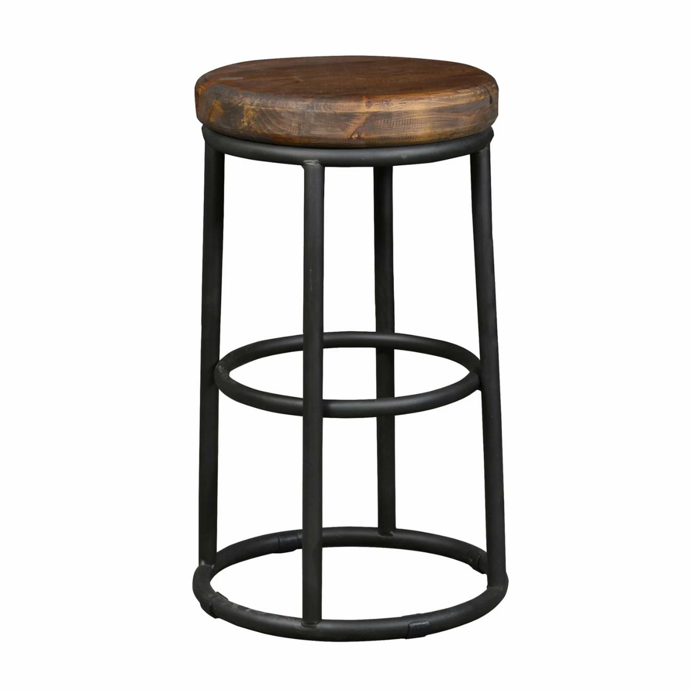 Whether you want to furnish your chat table or breakfast counter with more seating, the Kosas Home Kendall Backless Counter Stool saves space and offers guests a comfortable seat. This counter stool features a reclaimed pine wood top and circular metal base in black. For added comfort, it includes a built-in footrest.