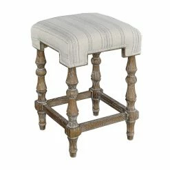 Your French country dining space craves the Linon Shelly 24 in. Backless Counter Stool. Its square seat and notched, self-welted apron are dressed in a pale gray French laundry stripe on ivory fabric. Spindle style legs and a box stretcher are built of elm wood and finished in rustic brown.