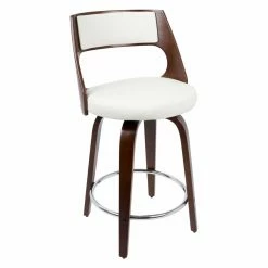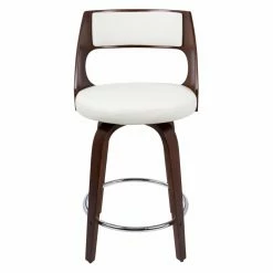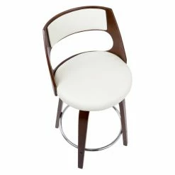 Customize the LumiSource Cecina 24 in. Keyhole Swivel Counter Stool – Set of 2 with your choice of available finish and upholstery colors. These counter-height stools are constructed of bent wood and equipped with chromed steel footrests. The seats and keyhole backrests are padded with foam and upholstered with polyurethane leather. A 360Β° swivel feature adds motion.