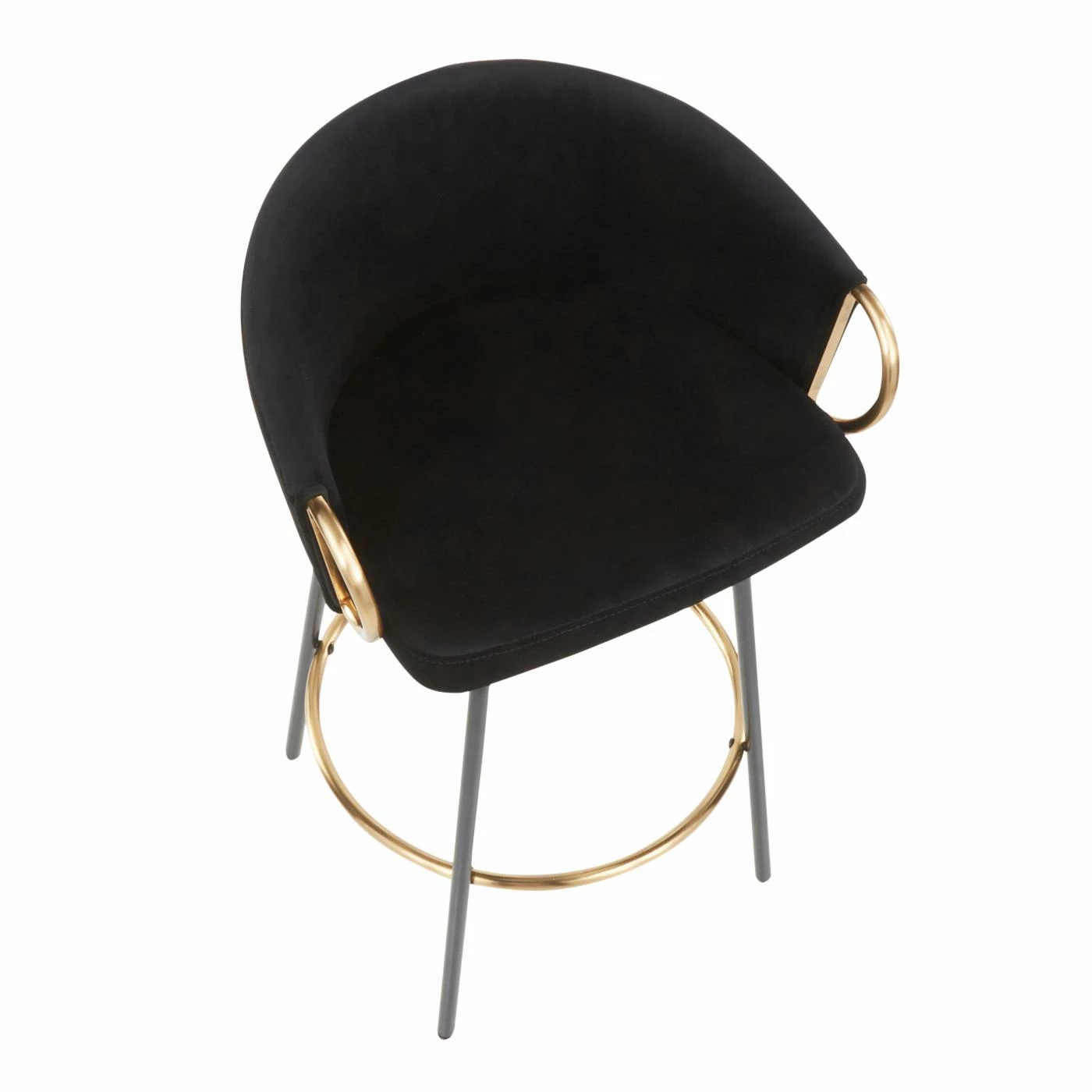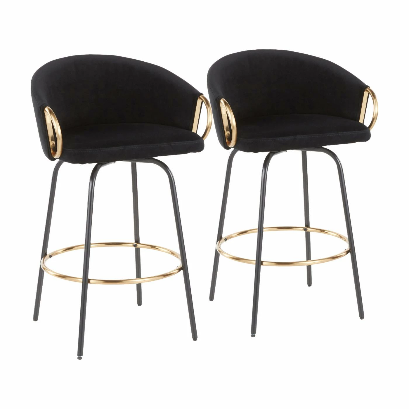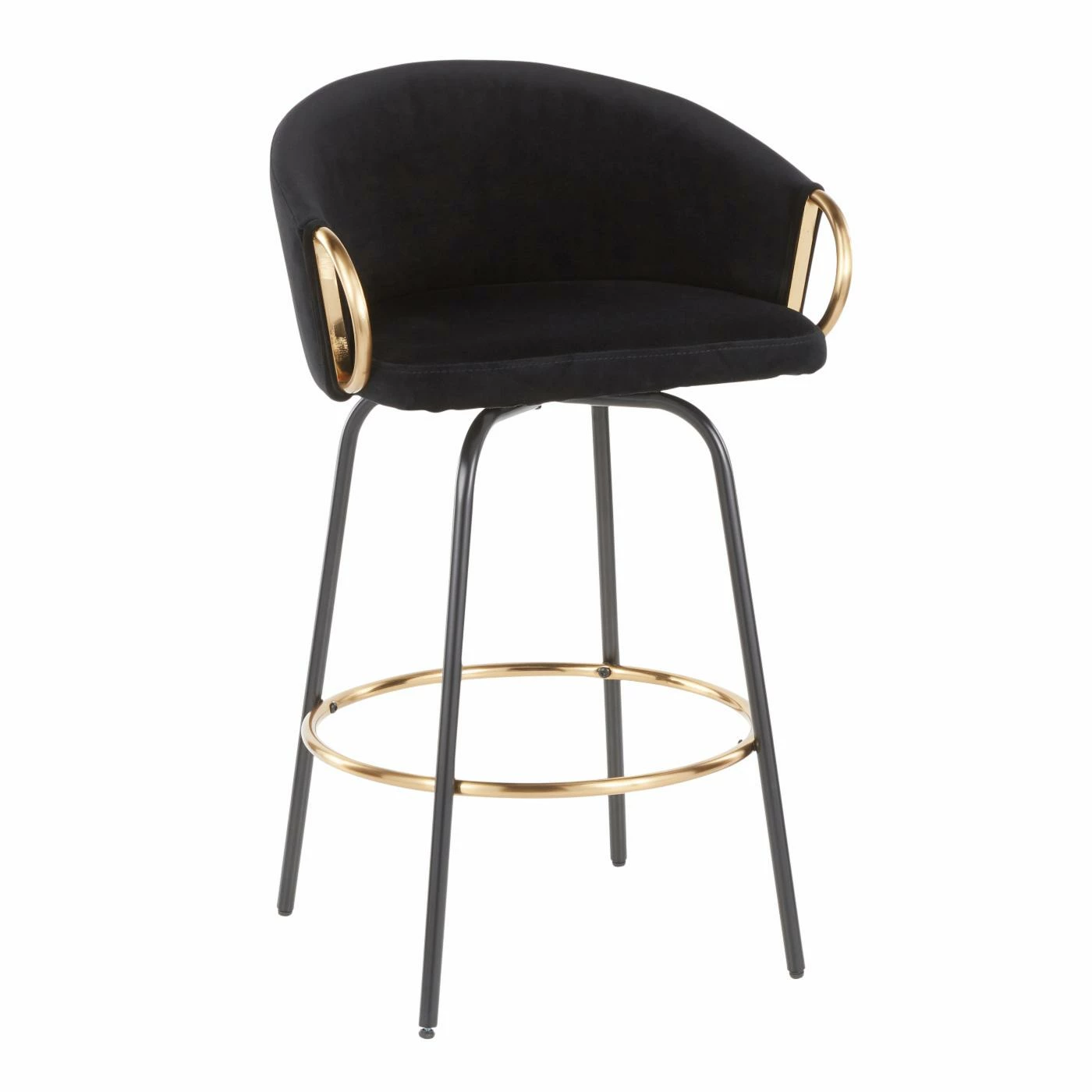 Bring luxurious style to your dining room or kitchen with the LumiSource Claire 26.25 in. Contemporary/Glam Counter Stool – Set of 2. Each stool is upholstered in plush velvet. The steel frame is in a black finish, while the arms and ring-shaped footrest are in a glam gold finish.