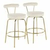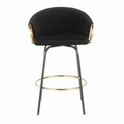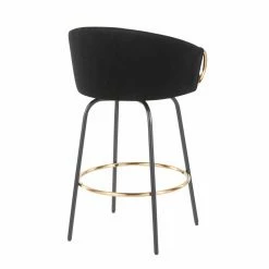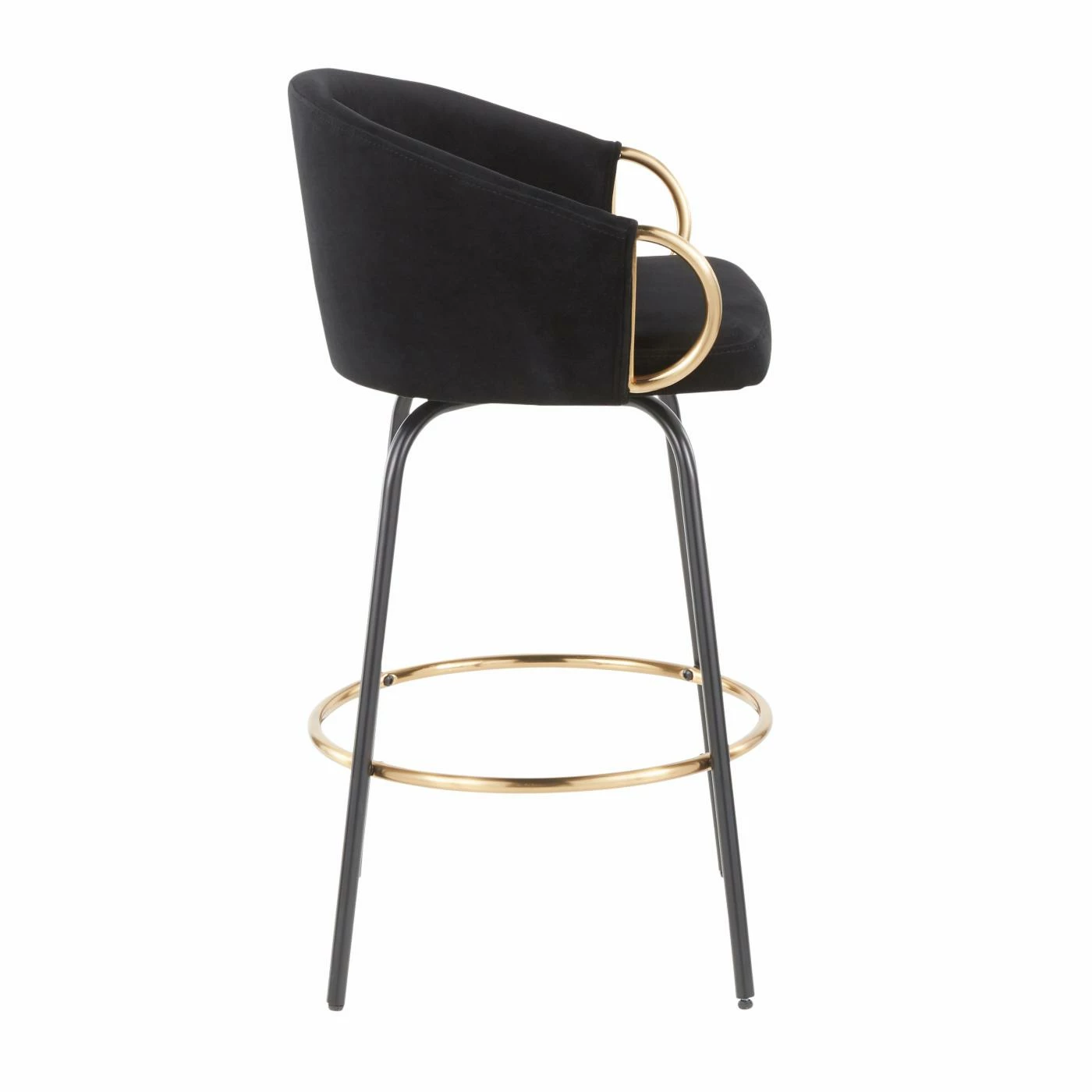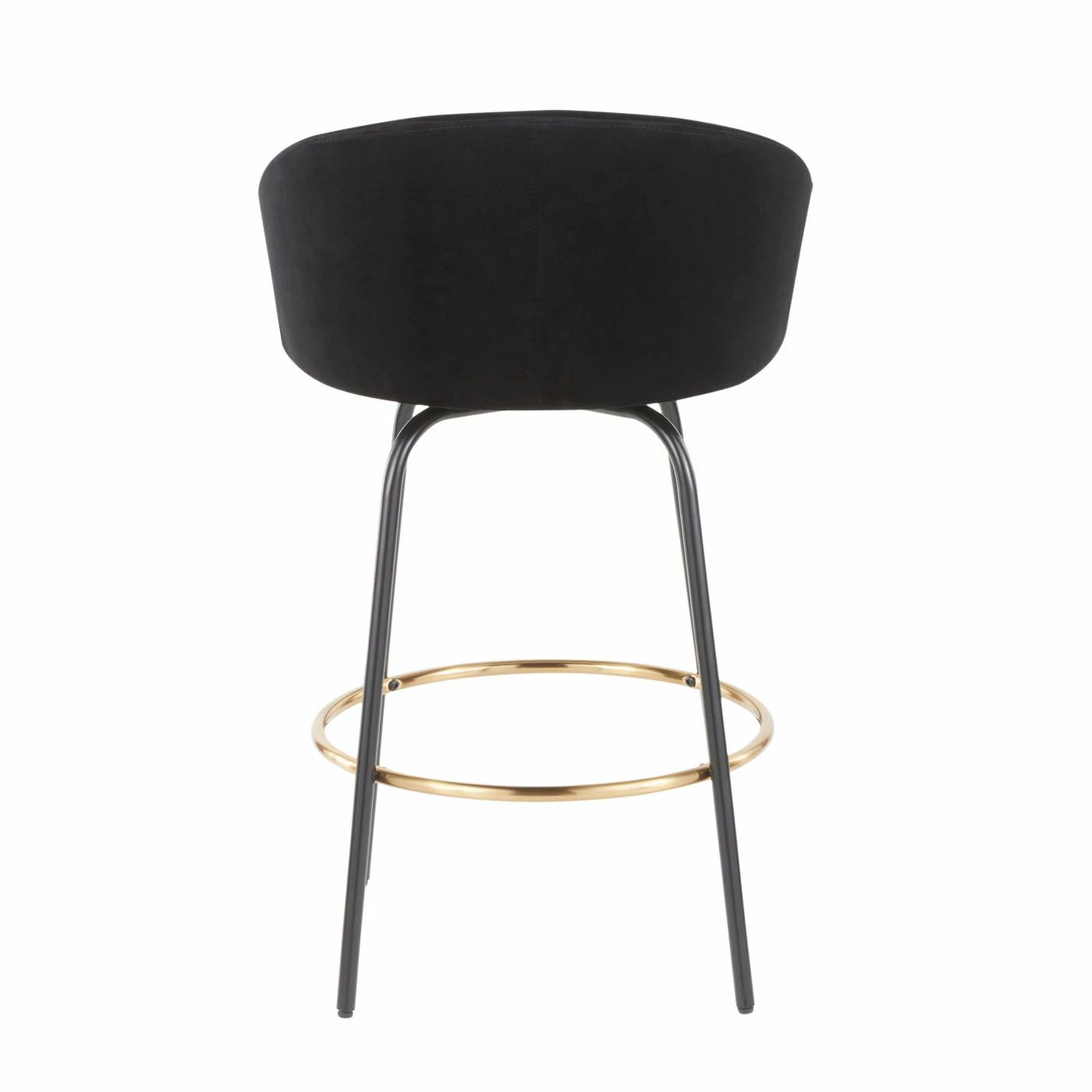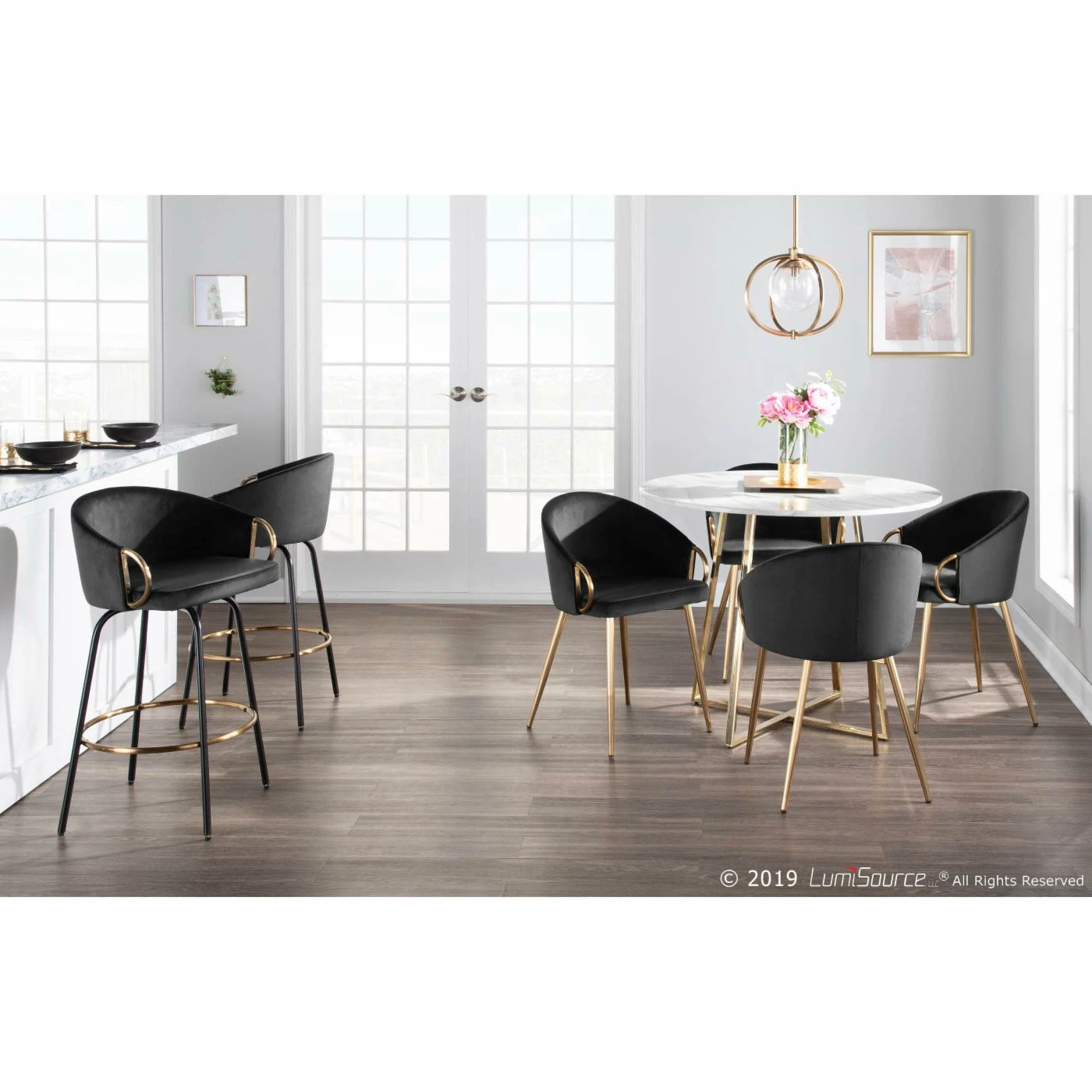 Bring luxurious style to your dining room or kitchen with the LumiSource Claire 26.25 in. Contemporary/Glam Counter Stool – Set of 2. Each stool is upholstered in plush velvet. The steel frame is in a black finish, while the arms and ring-shaped footrest are in a glam gold finish.