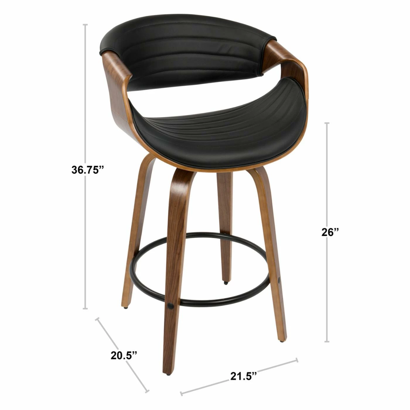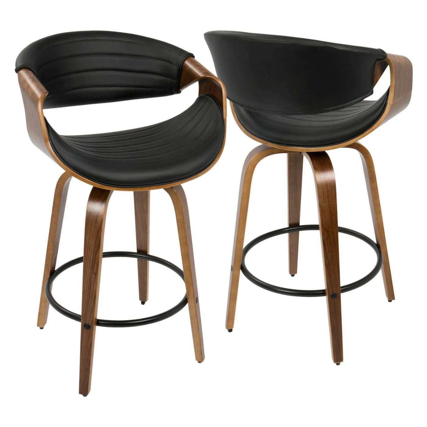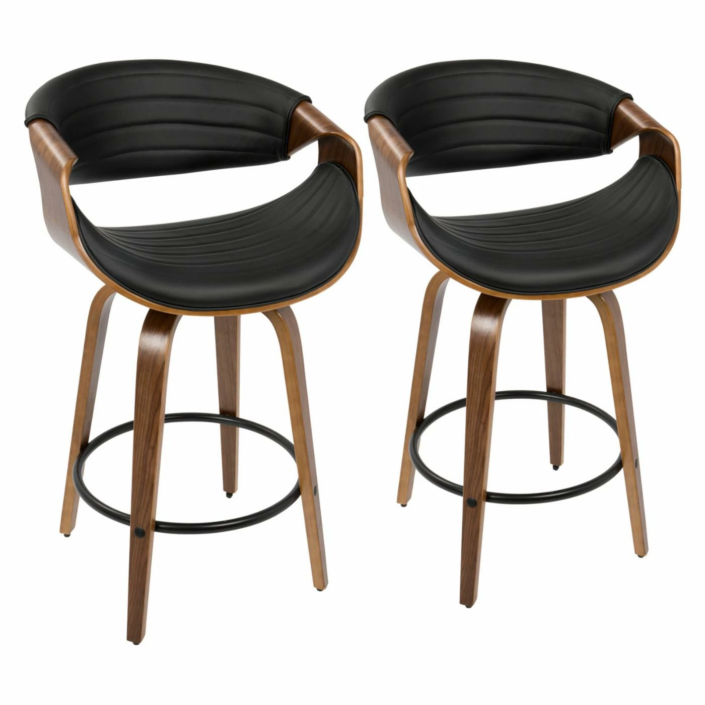 Add some mid-century panache to your new casual kitchen with the LumiSource Symphony 26 in. Solid Back Counter Stool – Set of 2. Two matching stools are included in the set, each crafted from bent wood. Black metal rings serve as combination footrests/stretchers. Plump foam pads the scooped seats and curved backs, upholstered in channeled polyurethane leather. Choose from the available faux leather colors.