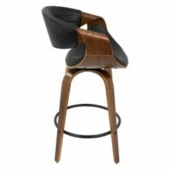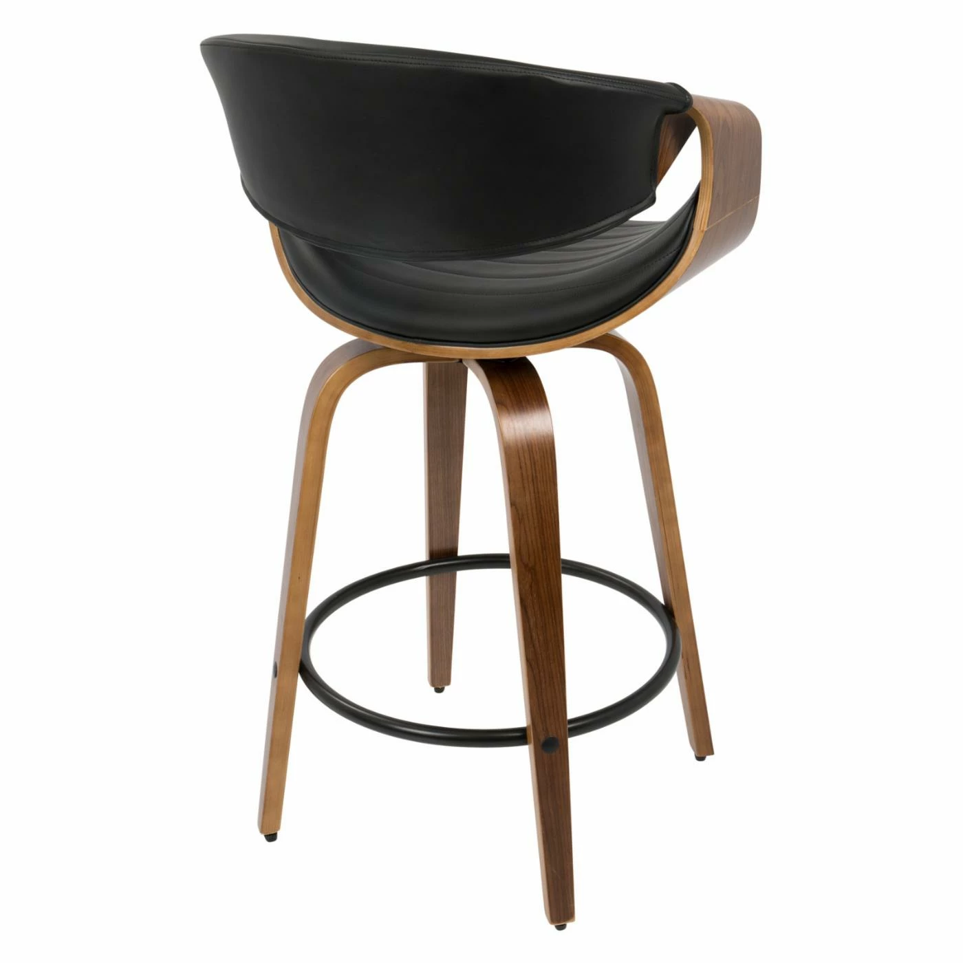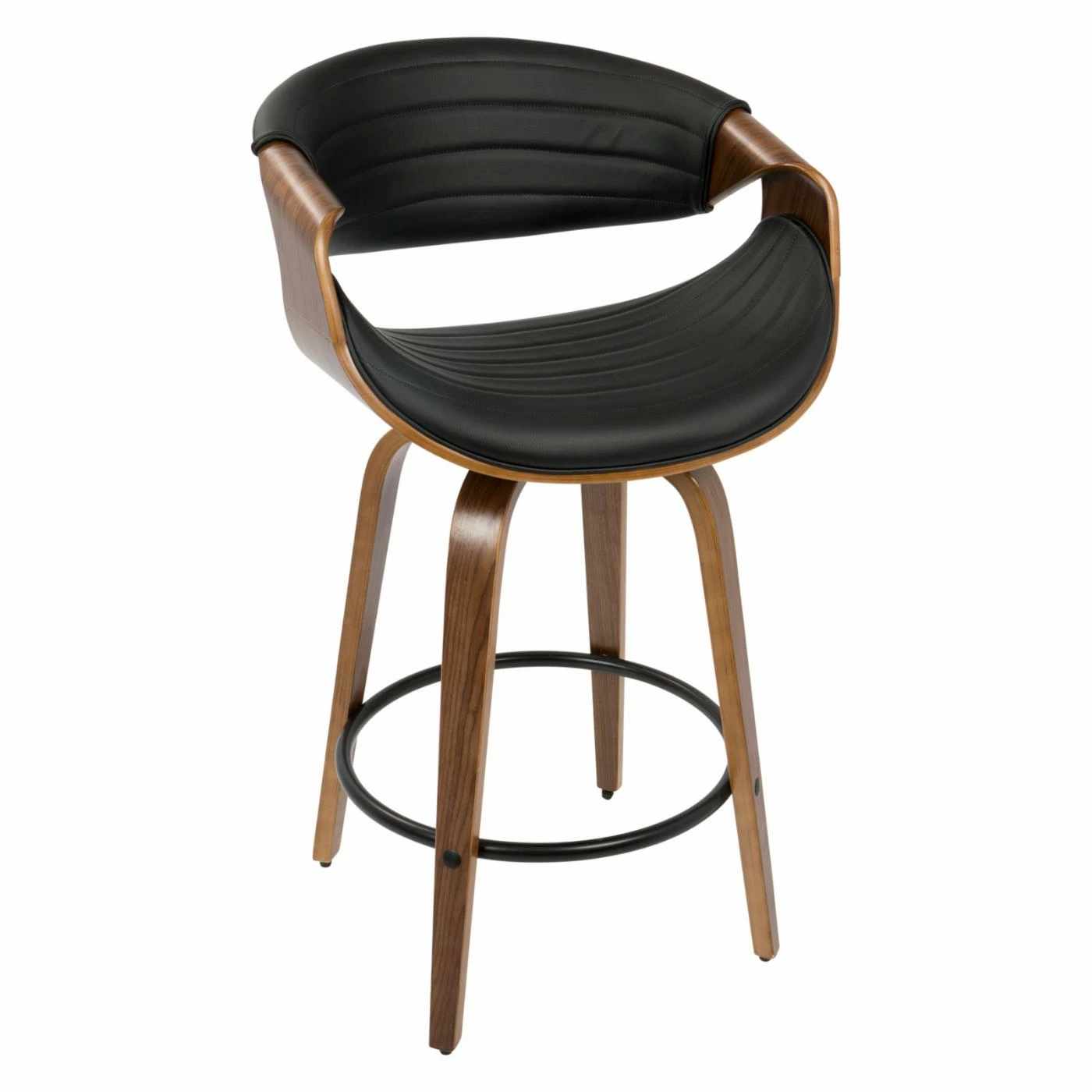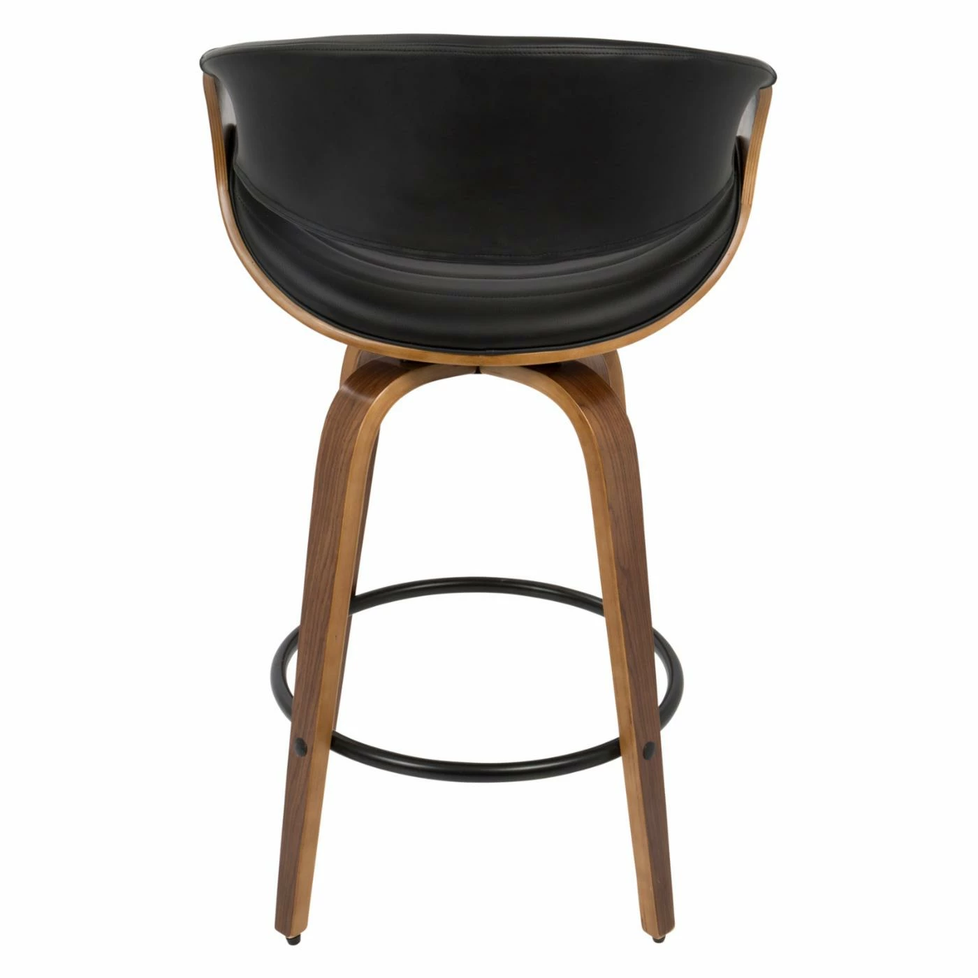 Add some mid-century panache to your new casual kitchen with the LumiSource Symphony 26 in. Solid Back Counter Stool – Set of 2. Two matching stools are included in the set, each crafted from bent wood. Black metal rings serve as combination footrests/stretchers. Plump foam pads the scooped seats and curved backs, upholstered in channeled polyurethane leather. Choose from the available faux leather colors.