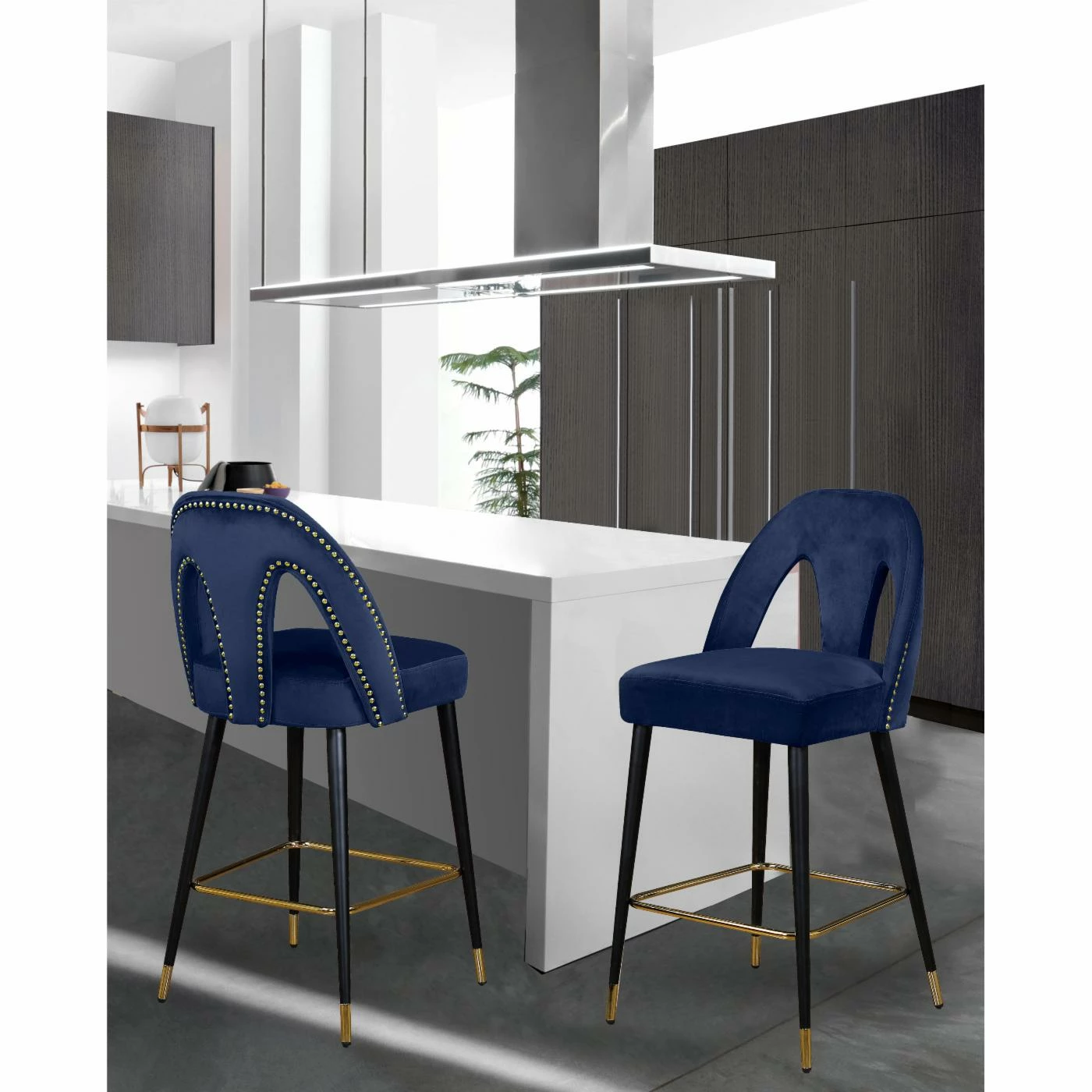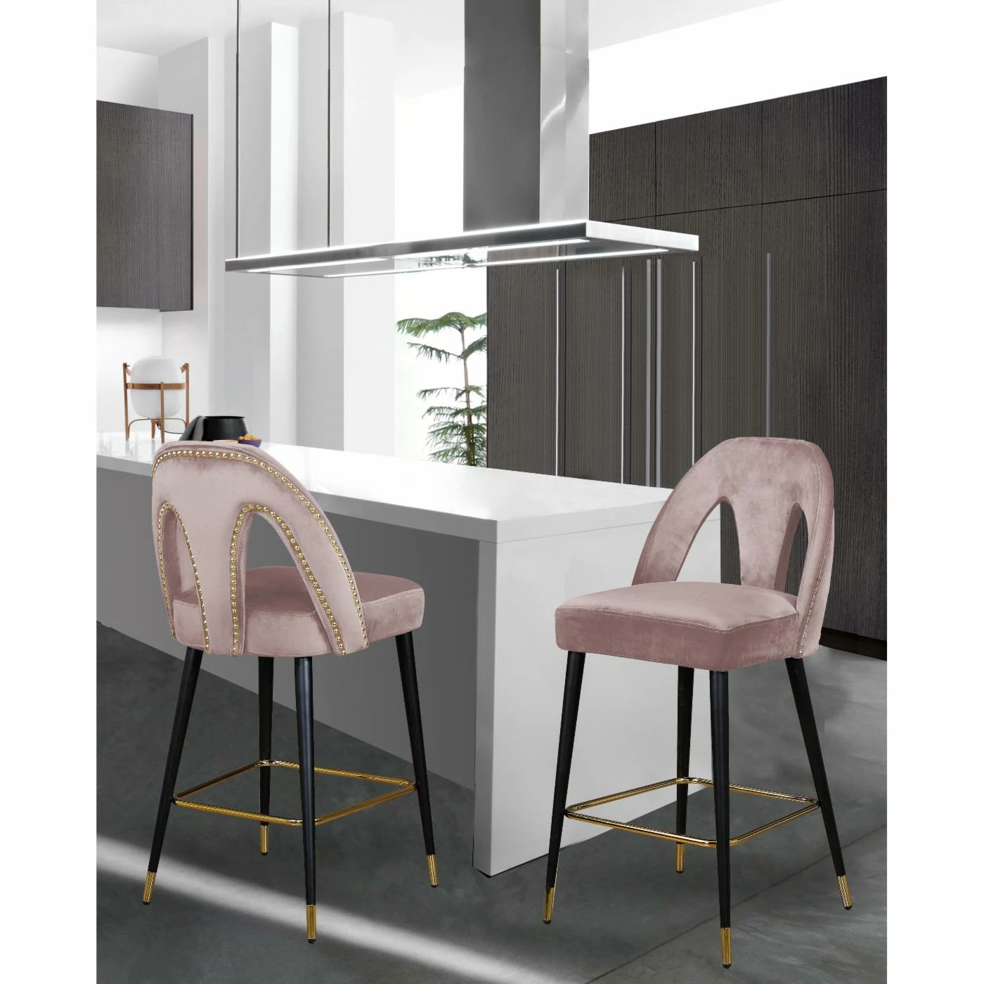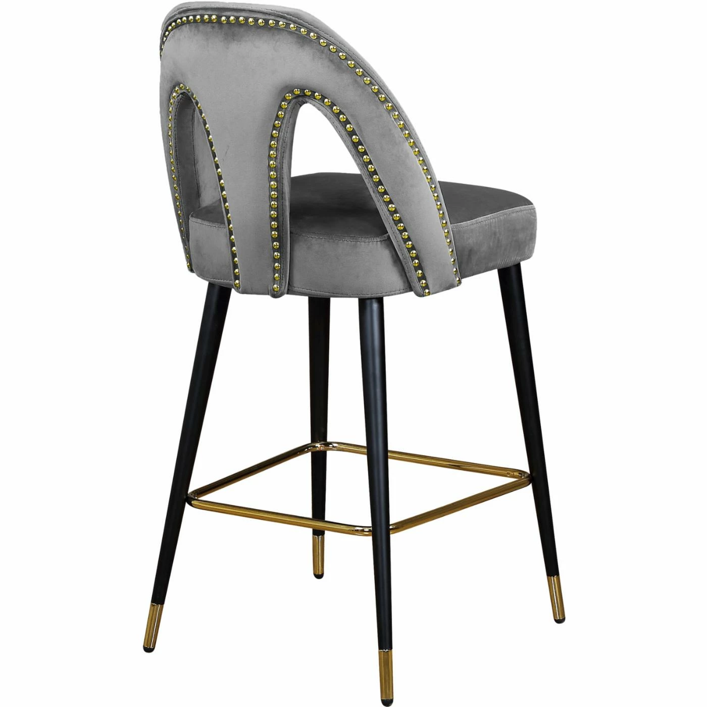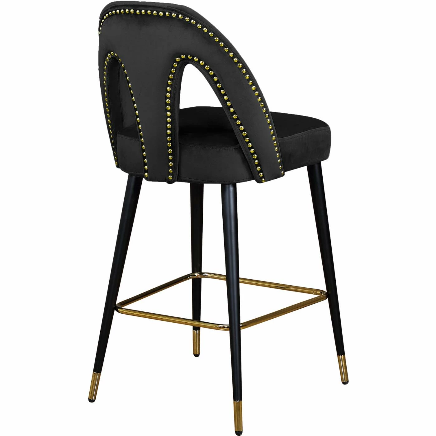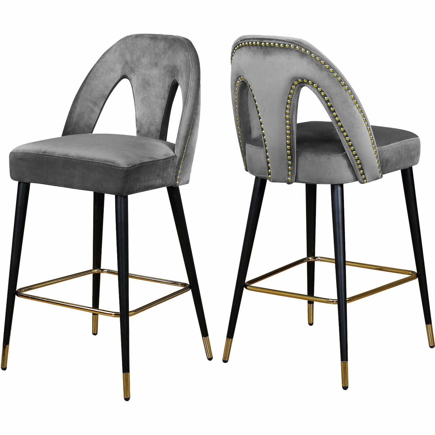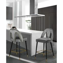 Go glam around your tall dining table by offering the Meridian Furniture Inc Akoya 28 in. Upholstered Counter Stool with Nailhead Trim – Set of 2. The set includes two counter height stools with keyhole backs and velvet upholstery. Designer gold-finished details include nail head trim along the back, box stretcher, and ferrules of these counter stools. For a custom look, choose from available velvet color options.