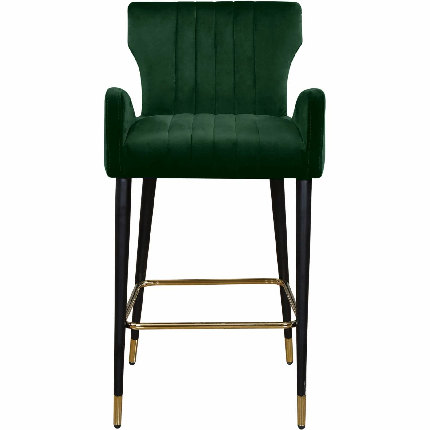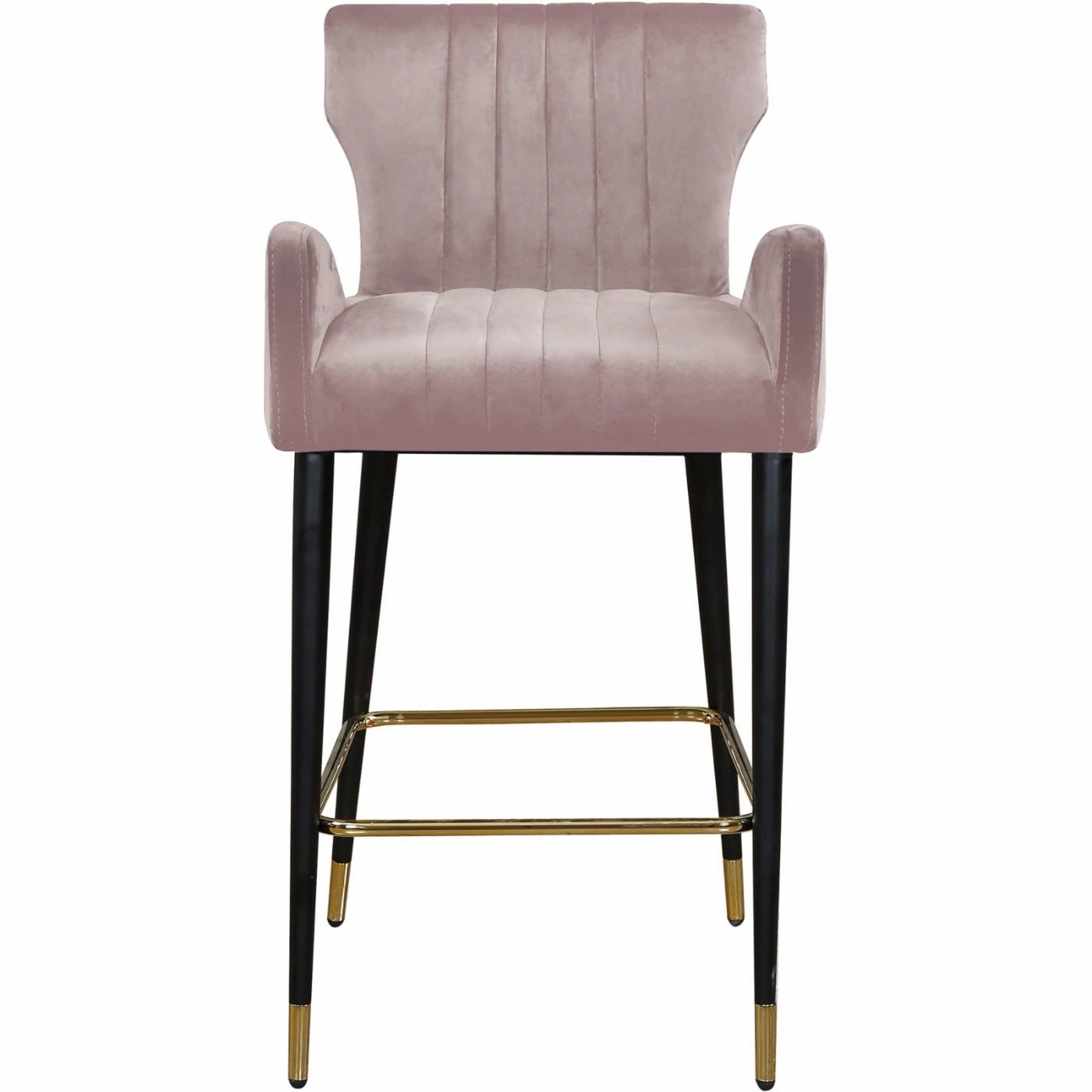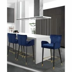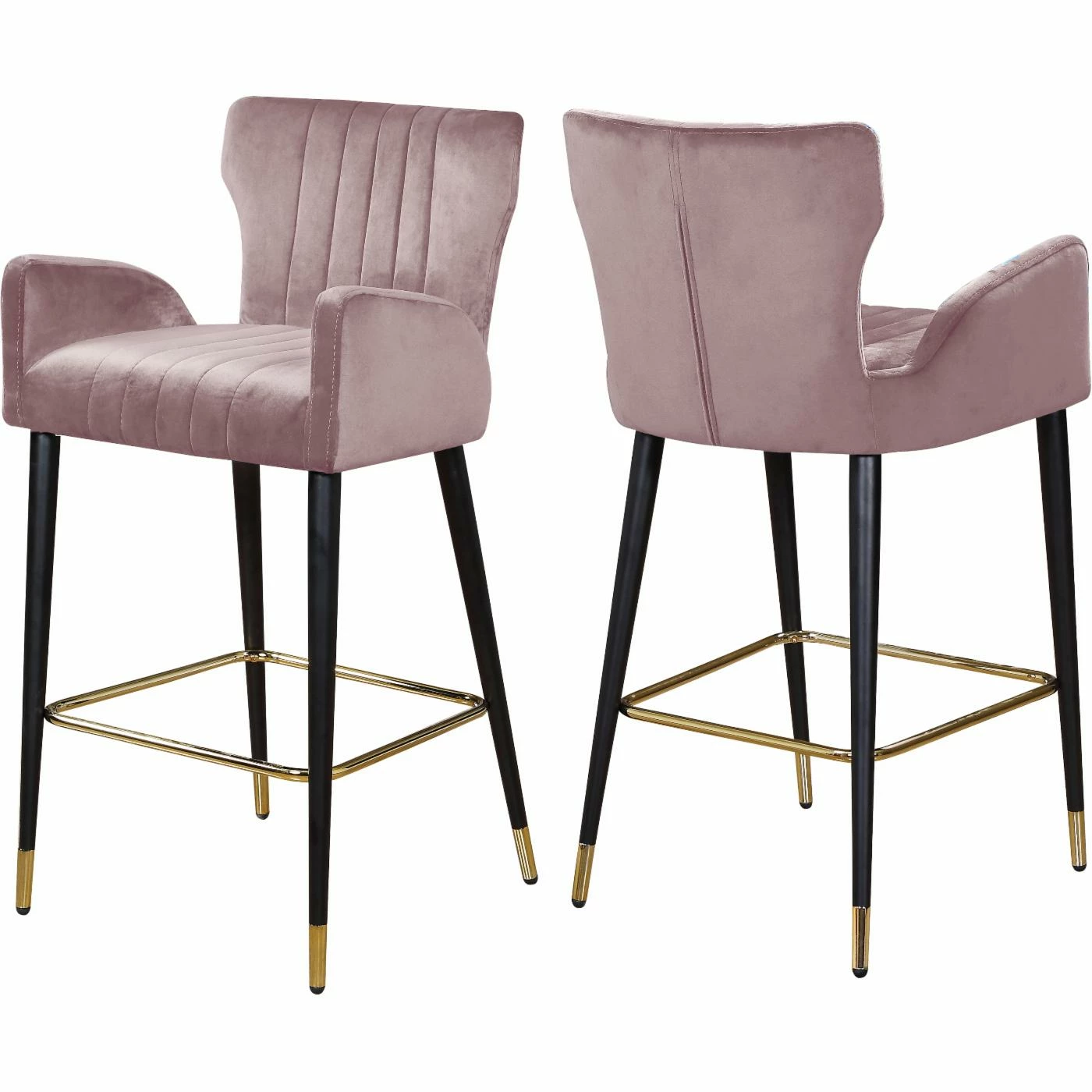 For a sumptuous seating option, invite the Meridian Furniture Inc Luxe 28 in. Upholstered Counter Stool – Set of 2 to dine. Notched backrests and generous seats are channel tufted for detail. Stylish comfort features include slim, angled arms and tapered wood dowel legs with gold-finished box stretcher and ferrules. This set includes two stools that fit neatly with your modern glam counter height dining table or breakfast bar.