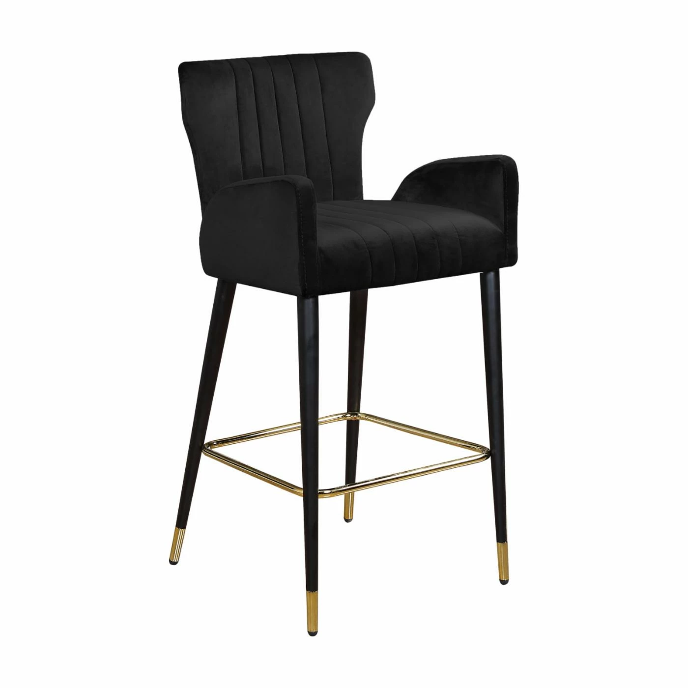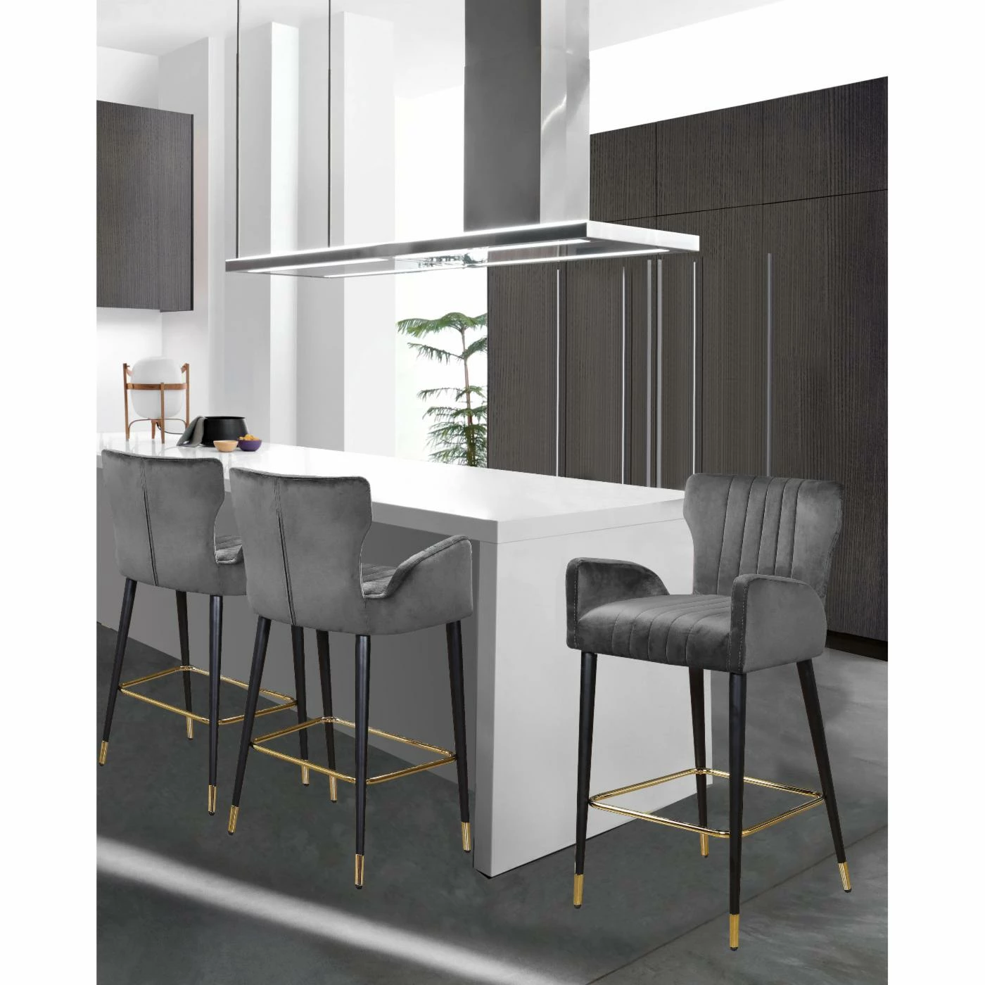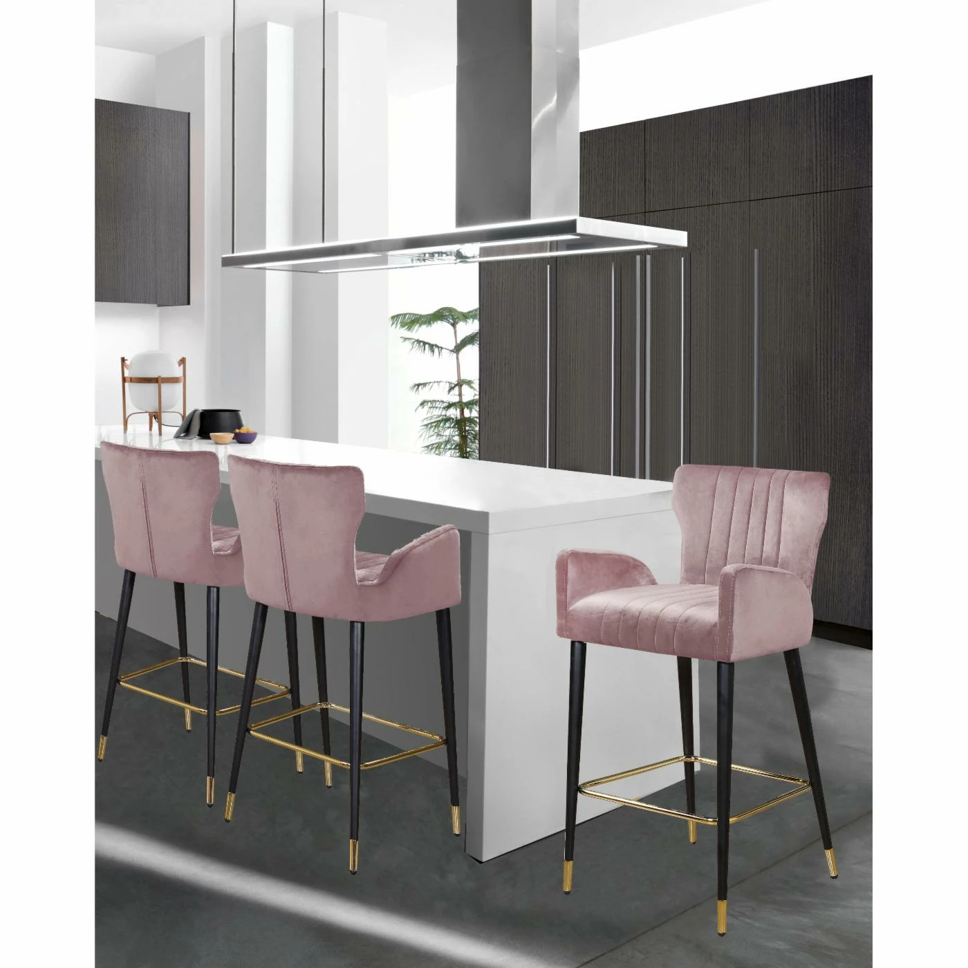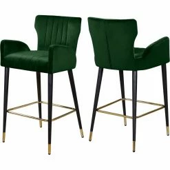 For a sumptuous seating option, invite the Meridian Furniture Inc Luxe 28 in. Upholstered Counter Stool – Set of 2 to dine. Notched backrests and generous seats are channel tufted for detail. Stylish comfort features include slim, angled arms and tapered wood dowel legs with gold-finished box stretcher and ferrules. This set includes two stools that fit neatly with your modern glam counter height dining table or breakfast bar.
