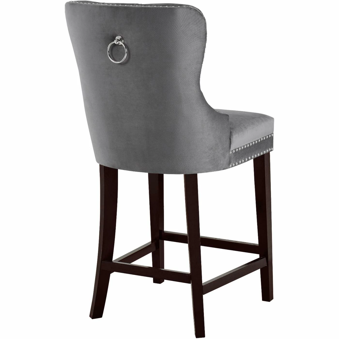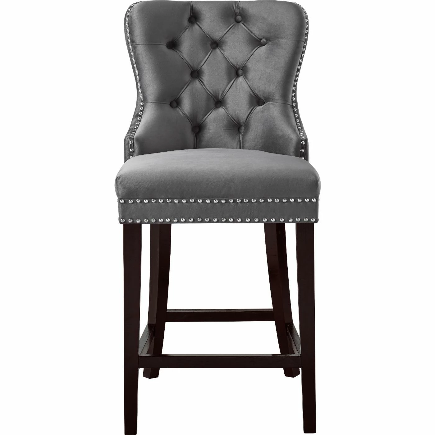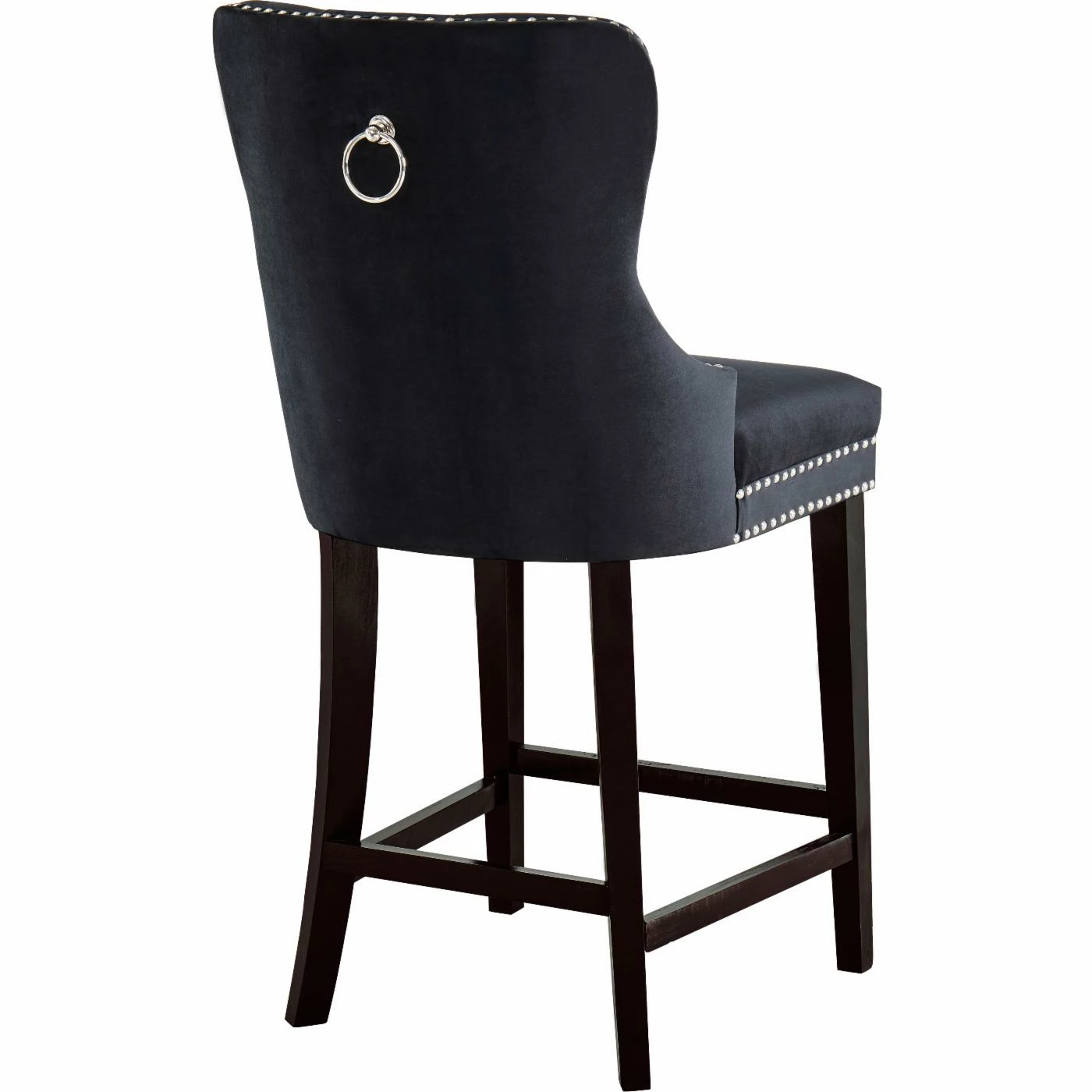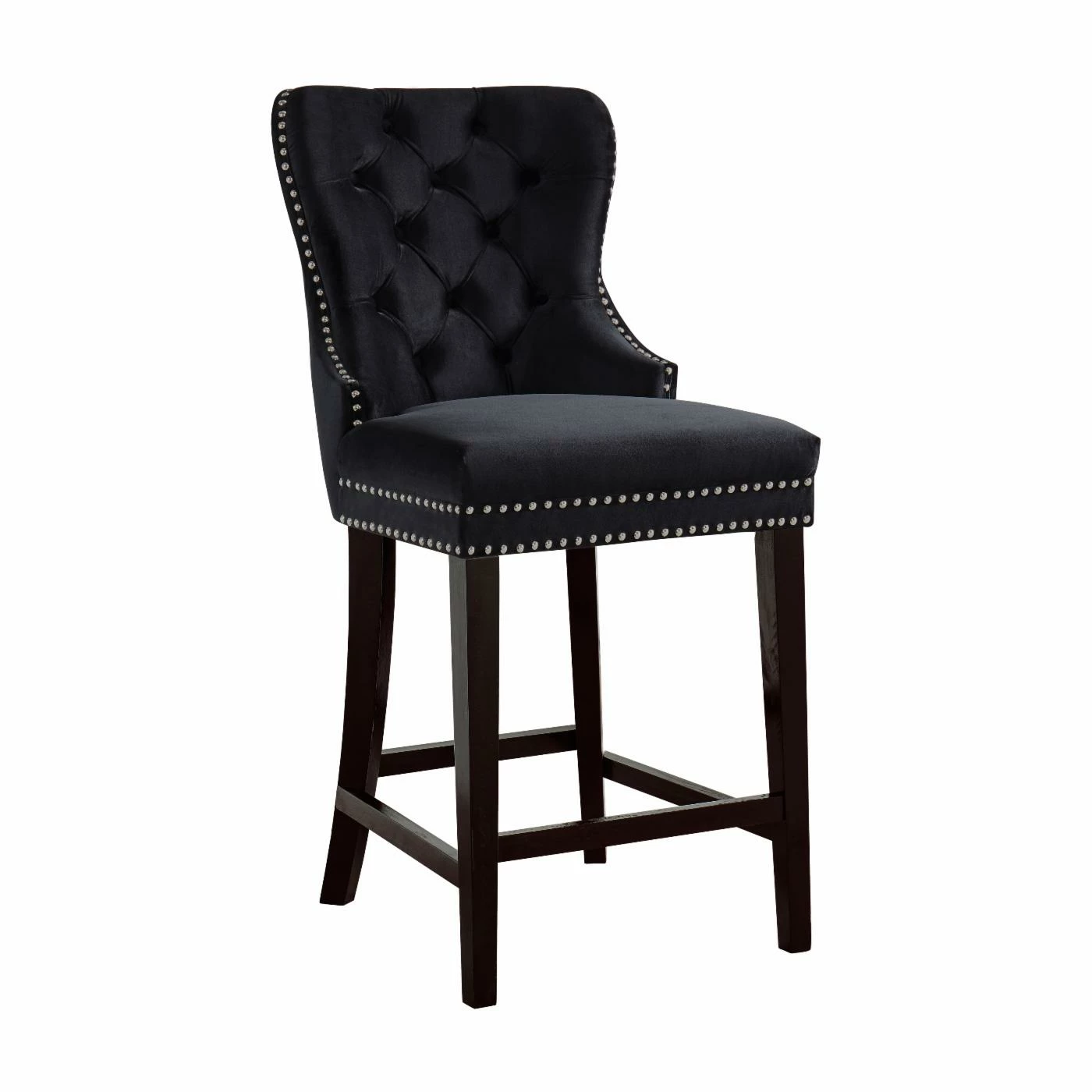 Dine in modern luxury by offering the Meridian Furniture Inc Nikki 26 in. Upholstered Counter Stool with Nailhead Trim – Set of 2. For an updated twist on a traditional silhouette, these stools feature tall, curved backs with button tufting and tapered wood legs in black. Bright nail head trim and a large ring detail at the back add polished finishing touches to these two velvet-upholstered stools. They’re designed to fit your counter height dining table. Choose from available colors.