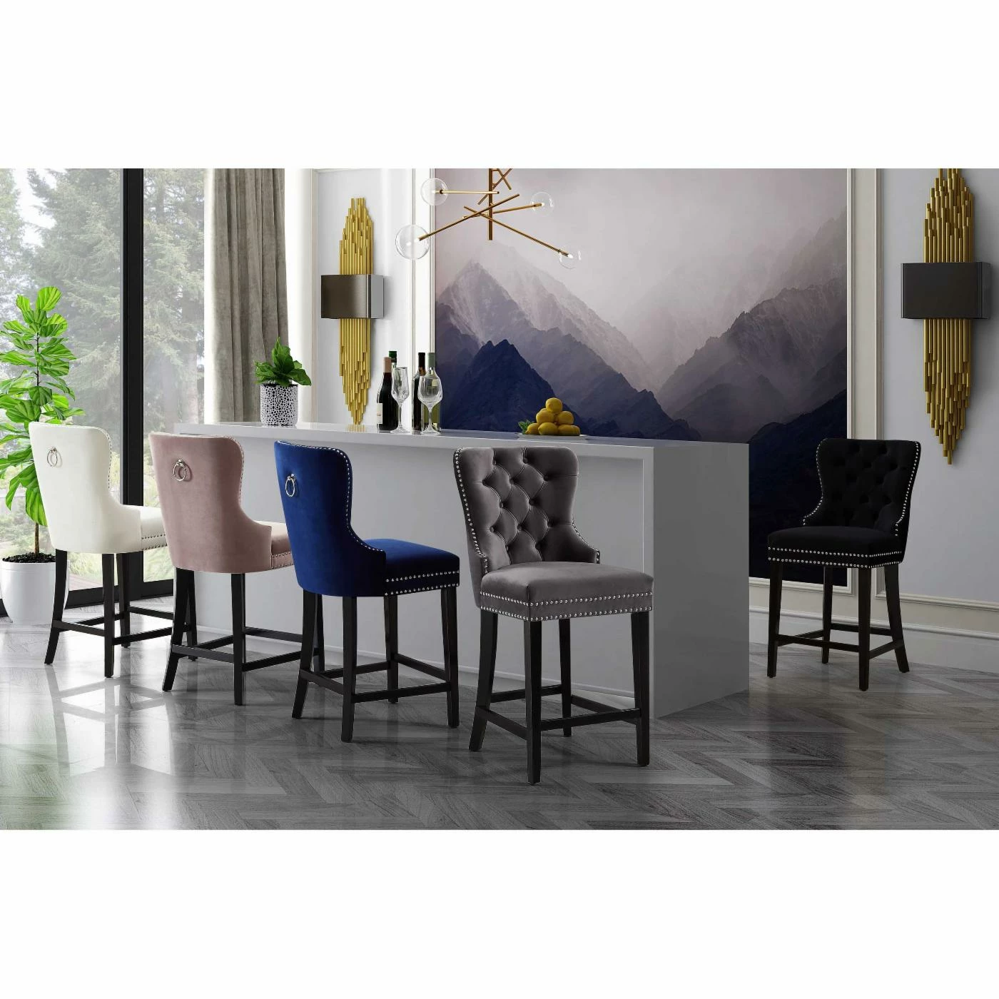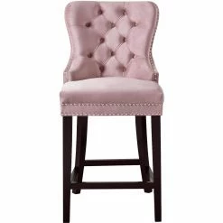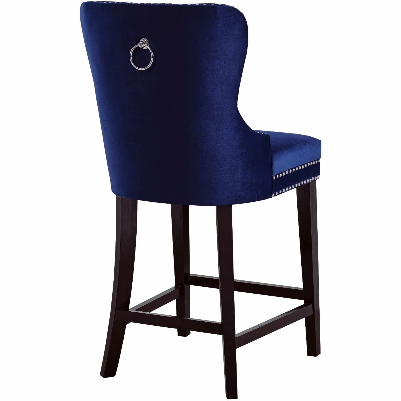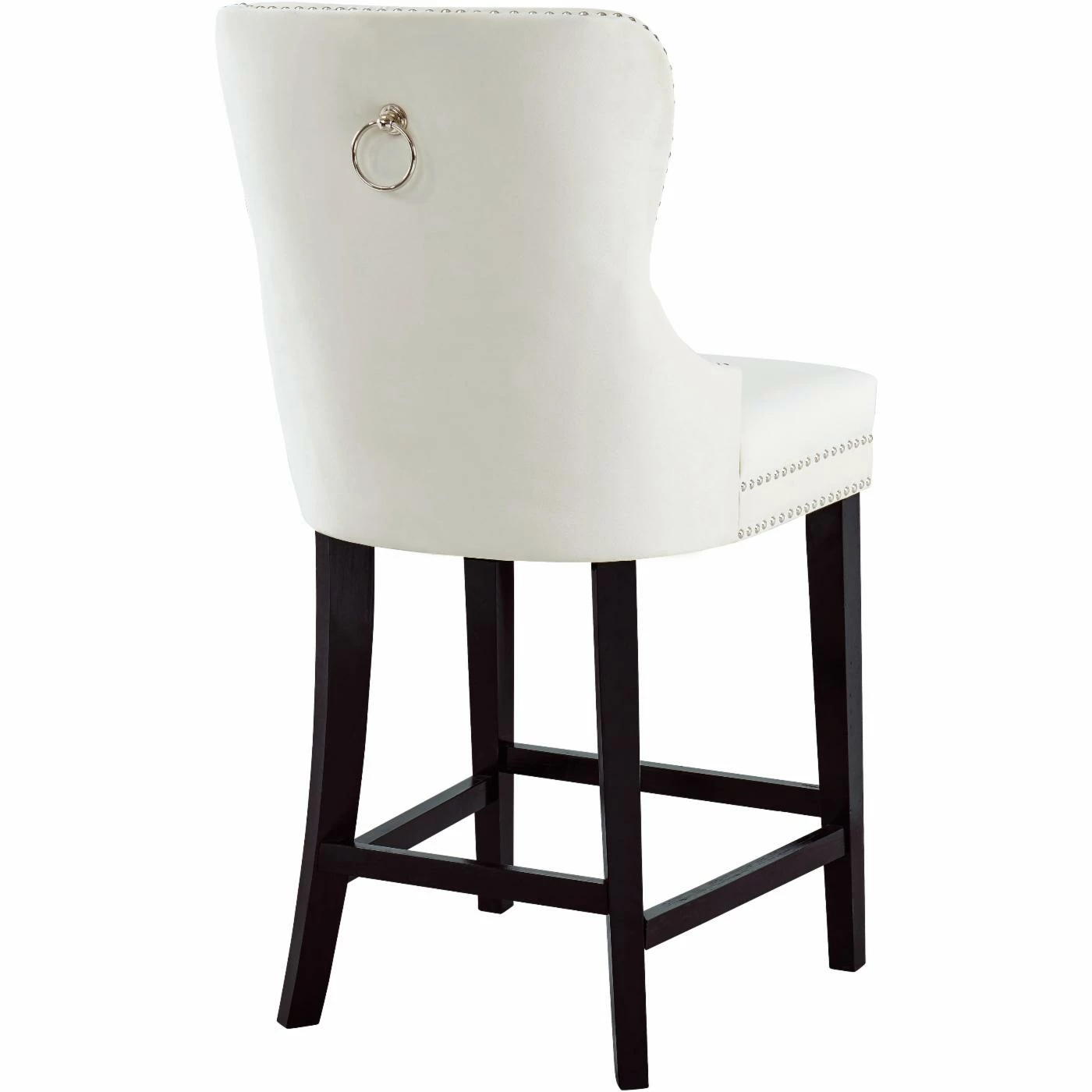 Dine in modern luxury by offering the Meridian Furniture Inc Nikki 26 in. Upholstered Counter Stool with Nailhead Trim – Set of 2. For an updated twist on a traditional silhouette, these stools feature tall, curved backs with button tufting and tapered wood legs in black. Bright nail head trim and a large ring detail at the back add polished finishing touches to these two velvet-upholstered stools. They’re designed to fit your counter height dining table. Choose from available colors.