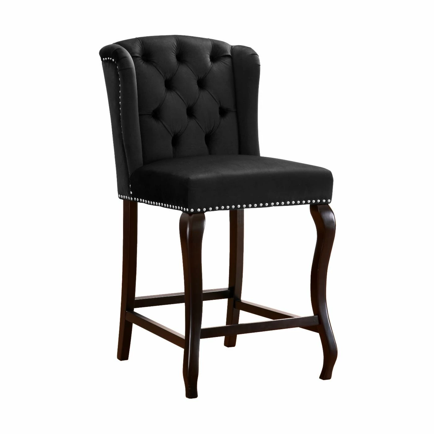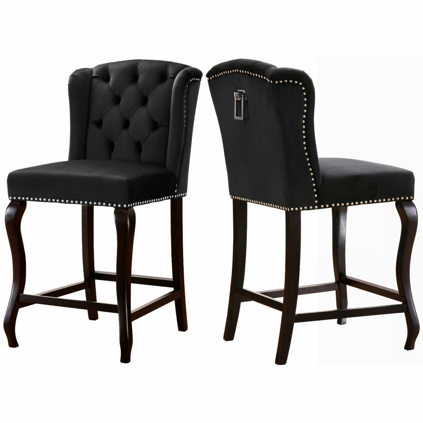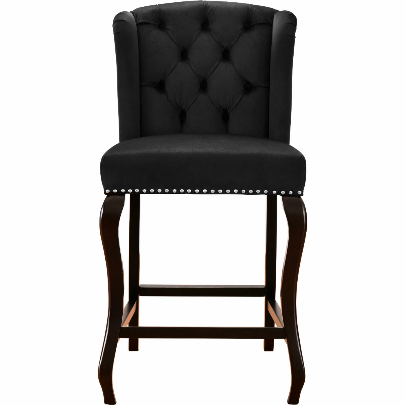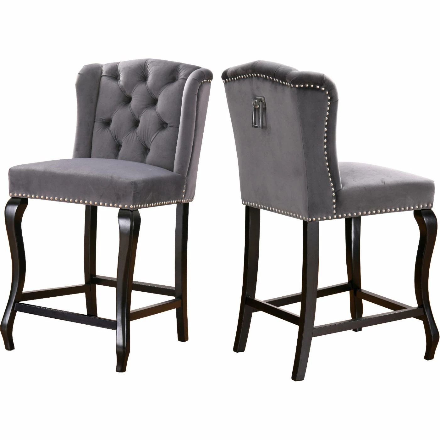 Polished nail head trim and distinctive jewelry at the back make the Meridian Furniture Inc Suri 27 in. Upholstered Counter Stool with Nailhead Trim – Set of 2 a glamorous twist on tradition. Deeply button tufted wingbacks and generous seats are upholstered in your choice of available velvet color, making these stools a sensory delight. The sit on cabriole legs with stretchers that double as footrests. The stools are sized to fit your counter height dining table.