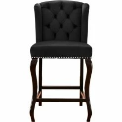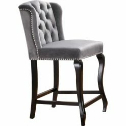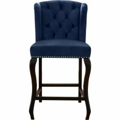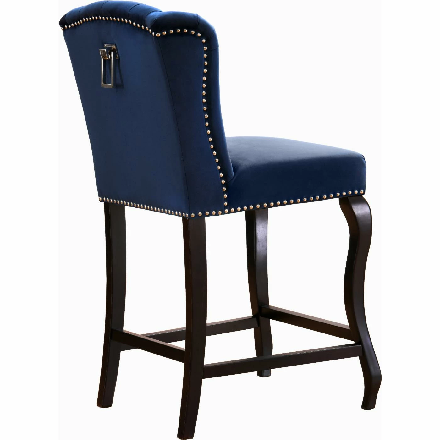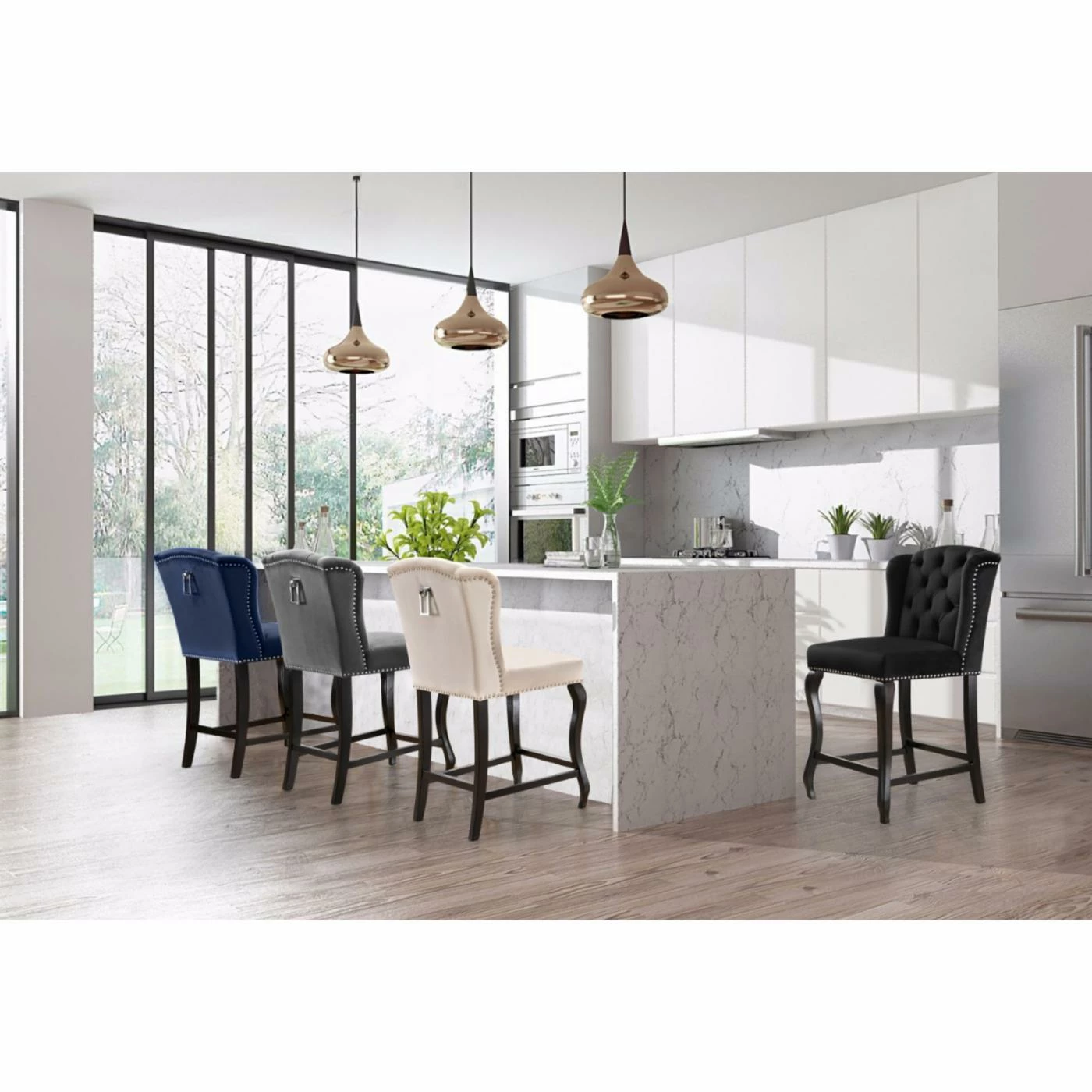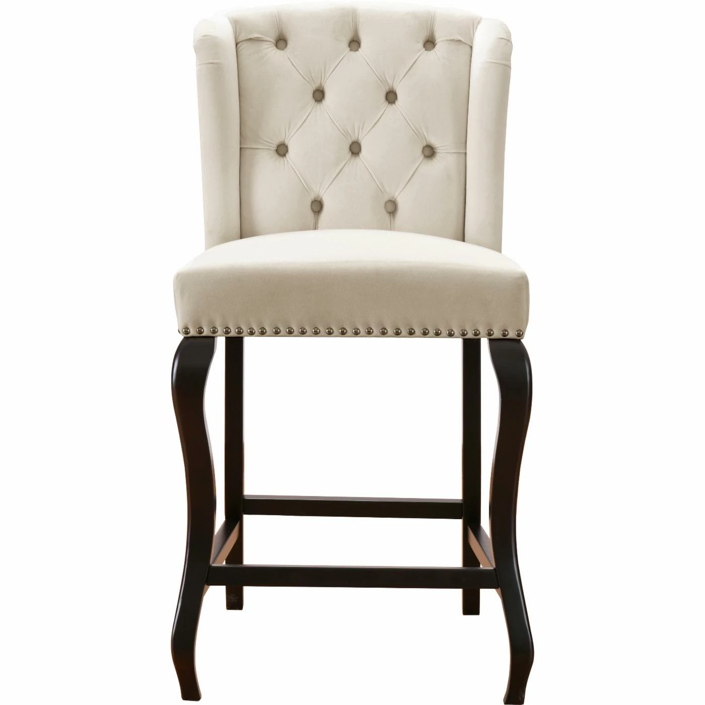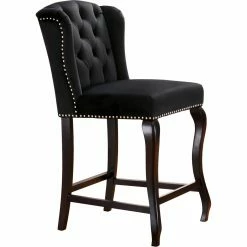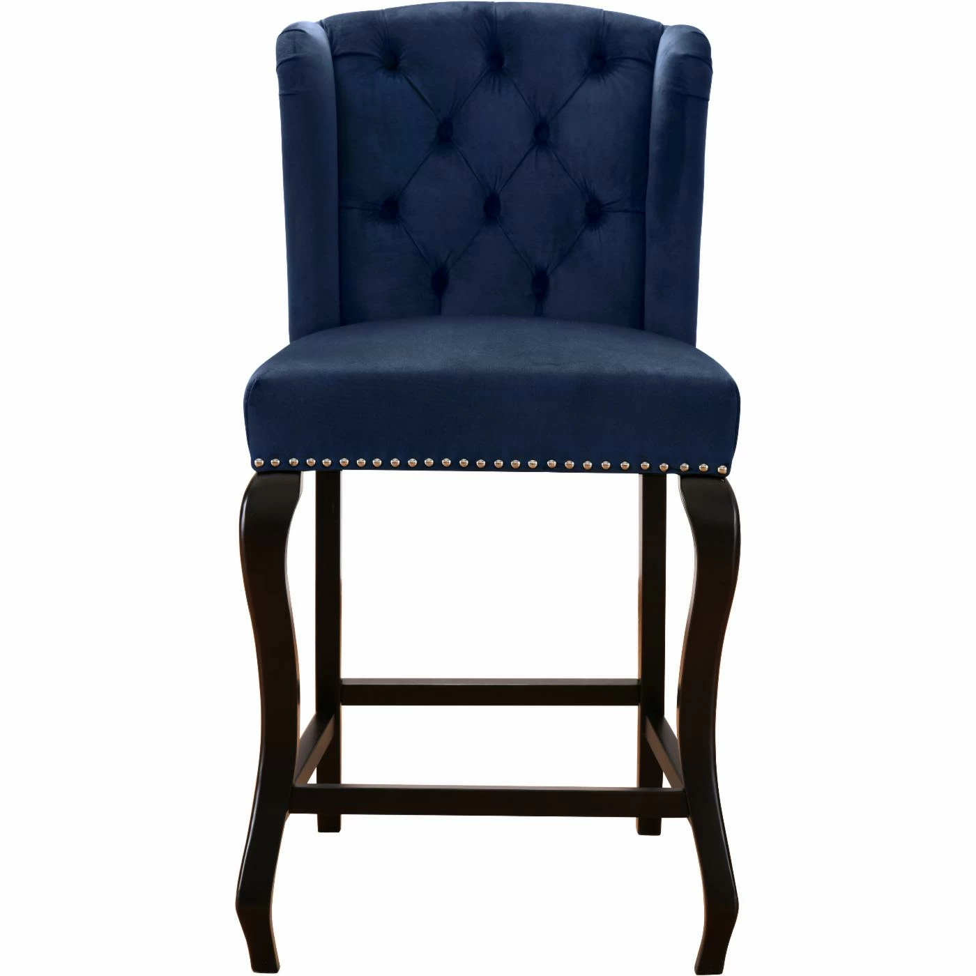 Polished nail head trim and distinctive jewelry at the back make the Meridian Furniture Inc Suri 27 in. Upholstered Counter Stool with Nailhead Trim – Set of 2 a glamorous twist on tradition. Deeply button tufted wingbacks and generous seats are upholstered in your choice of available velvet color, making these stools a sensory delight. The sit on cabriole legs with stretchers that double as footrests. The stools are sized to fit your counter height dining table.