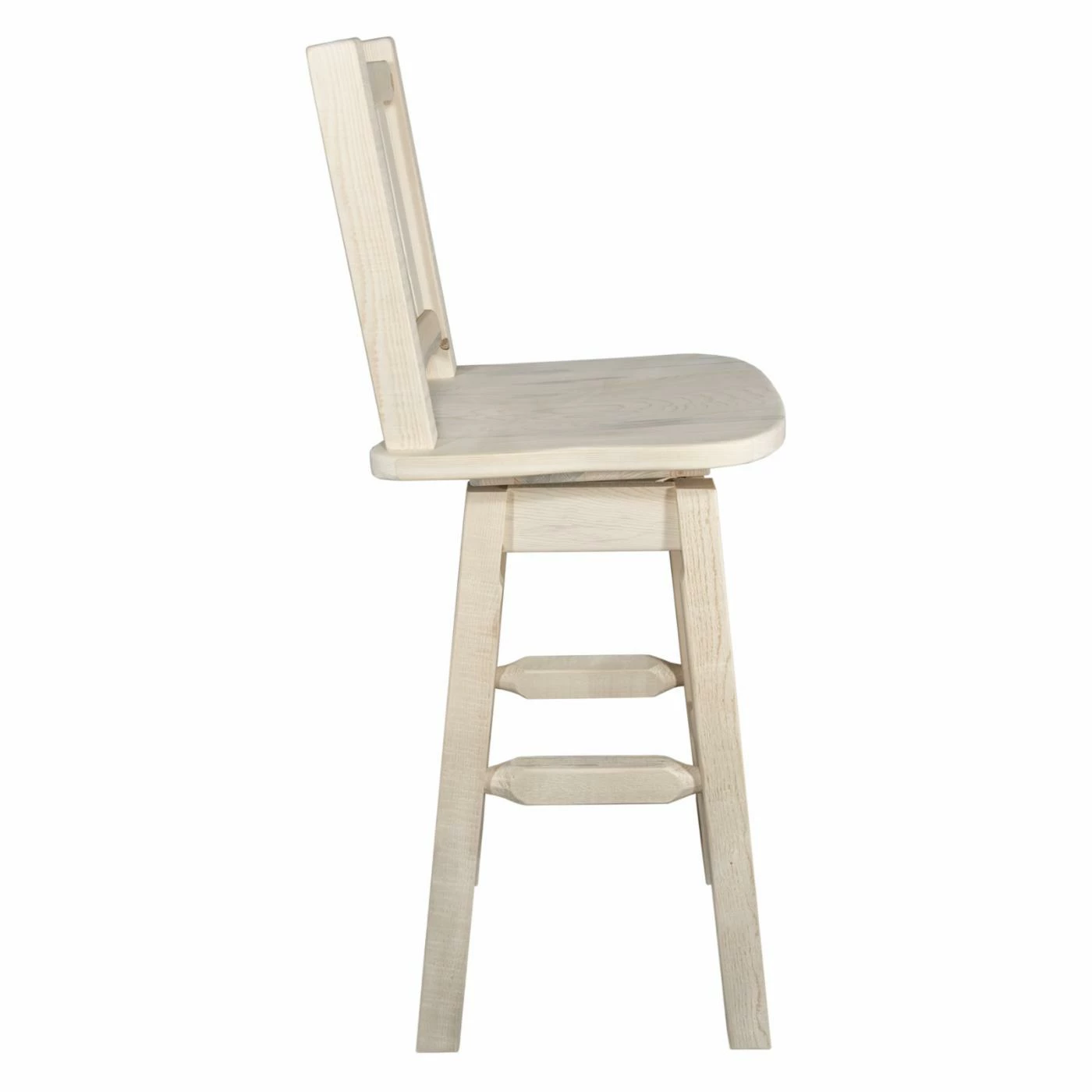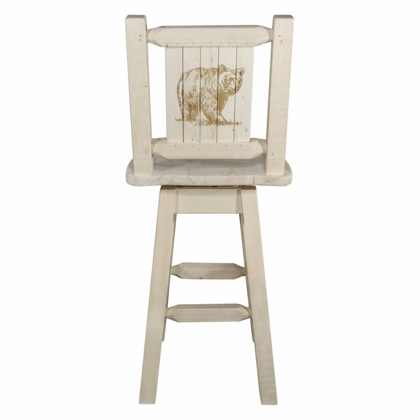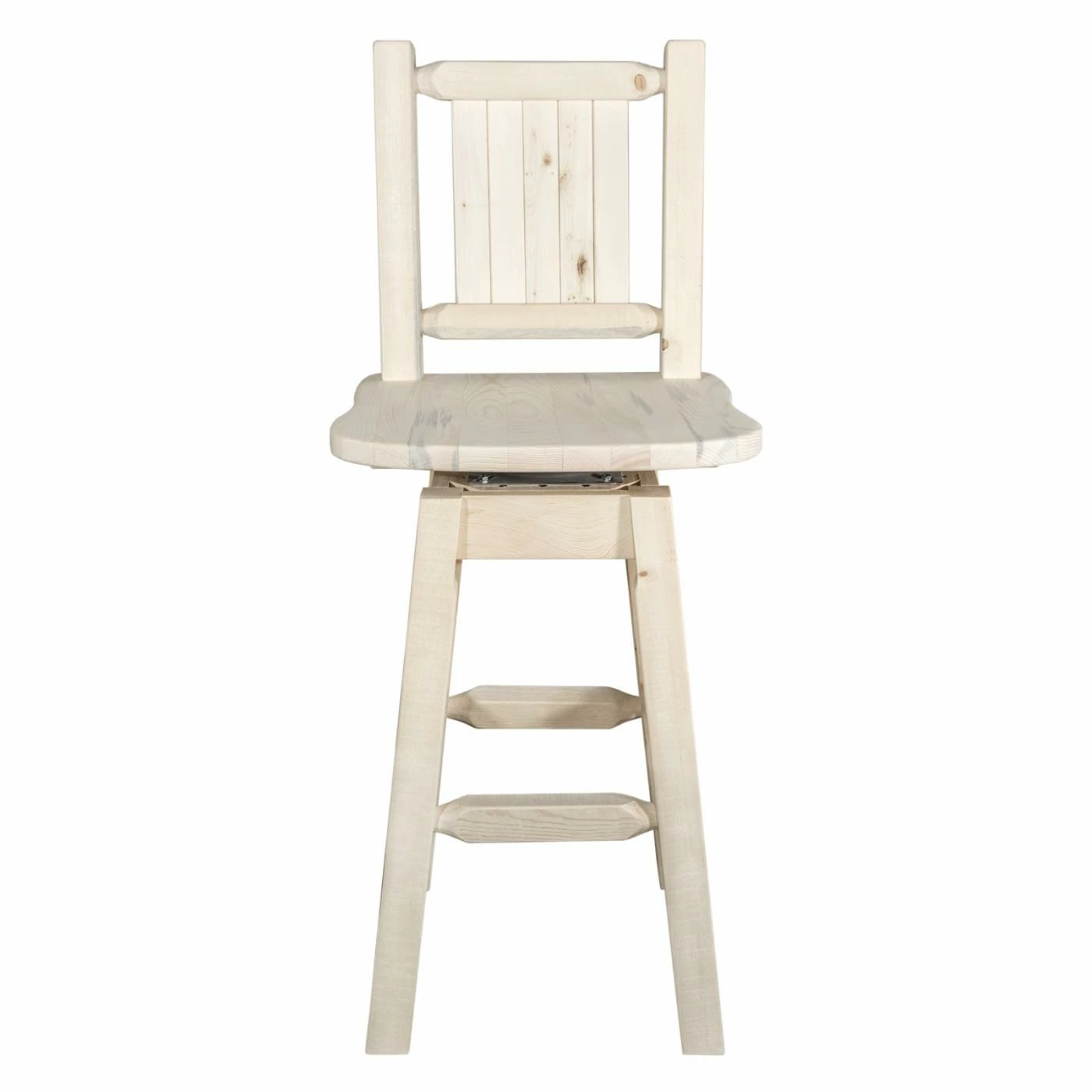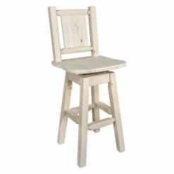 The rustic style of the Montana Woodworks Homestead 24 in. Engraved Swivel Counter Stool adds a bit of Rocky Mountain ruggedness to your home. Crafted from genuine lodge pole pine thatβs been skip-peeled by hand using old-fashioned draw knives, this piece would be just at home in a mountain lodge. With your choice of available finishes and laser-engraved designs on the back, youβll love how easy it is to customize these stools. An ergonomic seat and built-in swivel makes these stools as comfortable as they are beautiful. These heirloom quality stools are handcrafted in the mountains of Montana.