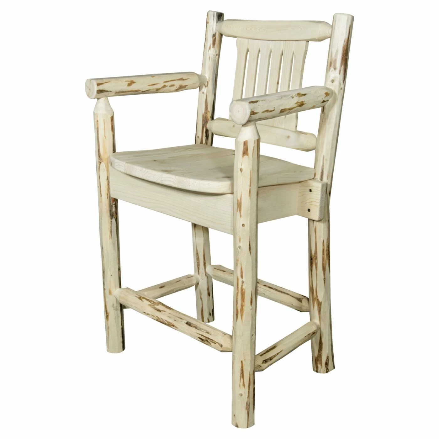 The comfortably contoured wood seat on the Montana Woodworks Montana 24 in. Captains Counter Stool makes it a true classic. To enhance comfort of this counter height stool, it boasts a slatted back, post arms, and built-in footrests. The stool is handcrafted in Montana using solid, U.S.-grown, lodge pole pine wood and skip peeled by hand. Choose from available finishes.